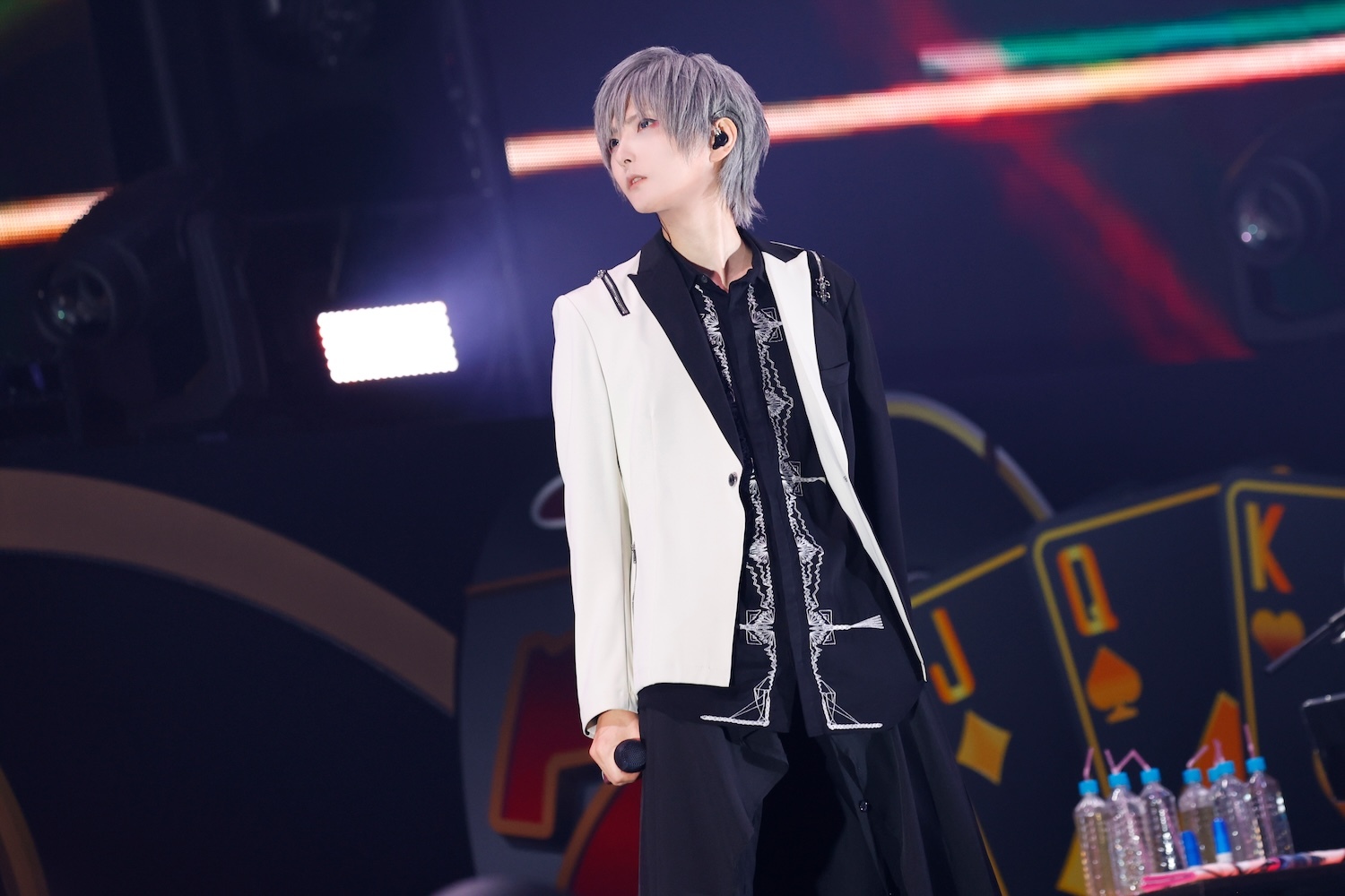 開演時間を過ぎてほどなく、場内の巨大ビジョンではビデオスロットの画面を模した動画が流れだして見事にJackpotが成立すると……ライブの開催前日にそらまふうらさか名義で新規投稿された、まふまふの作詞作曲による「Mrs.」から幕開けした。ちなみに、まふまふチャンネルの該当ページの概要欄によると、この曲はそらるからの「色気ある曲を作ってくれ」というオーダーをまふまふが具現化したものだったそうで、シャッフルビートを基調とした曲調と艶やかさを漂わせた歌詞は確かにアダルティな仕上がり。セクシーではあるけれども決してエロには寄っておらず、上品にまとめられているあたりが実に心憎い。