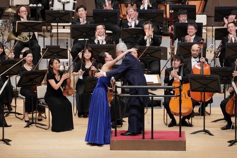 指揮者の秋山和慶とハグをする辻彩奈 (C)飯島隆