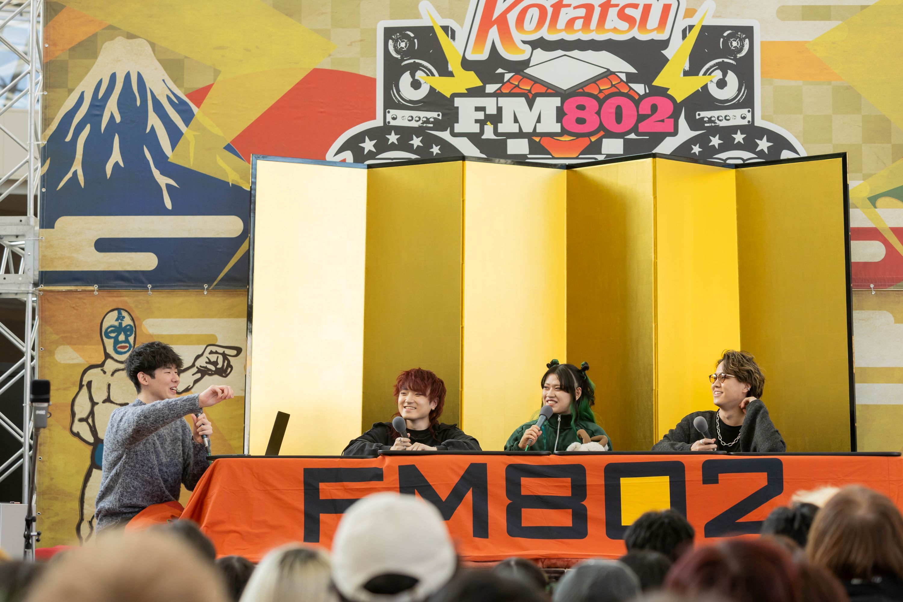 毎年恒例となった屋外のこたつサテライトスタジオでは、出演アーティストとDJがこたつを囲んで公開収録を実施。初日は15:30~ライブ前のChevonが『RADIO∞INFINITY』(DJハタノユウスケ)に登場。