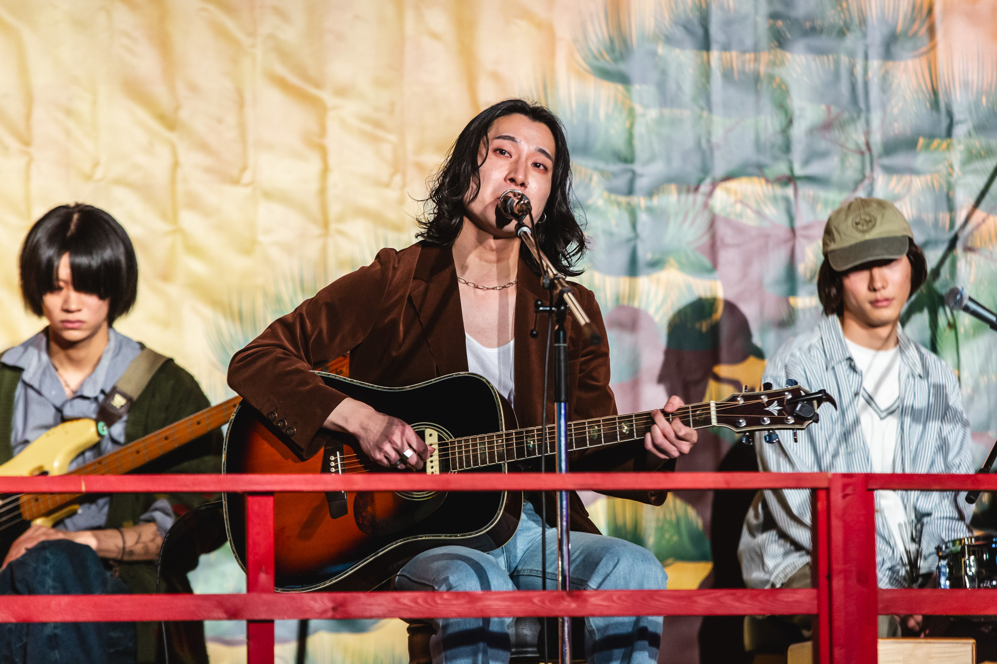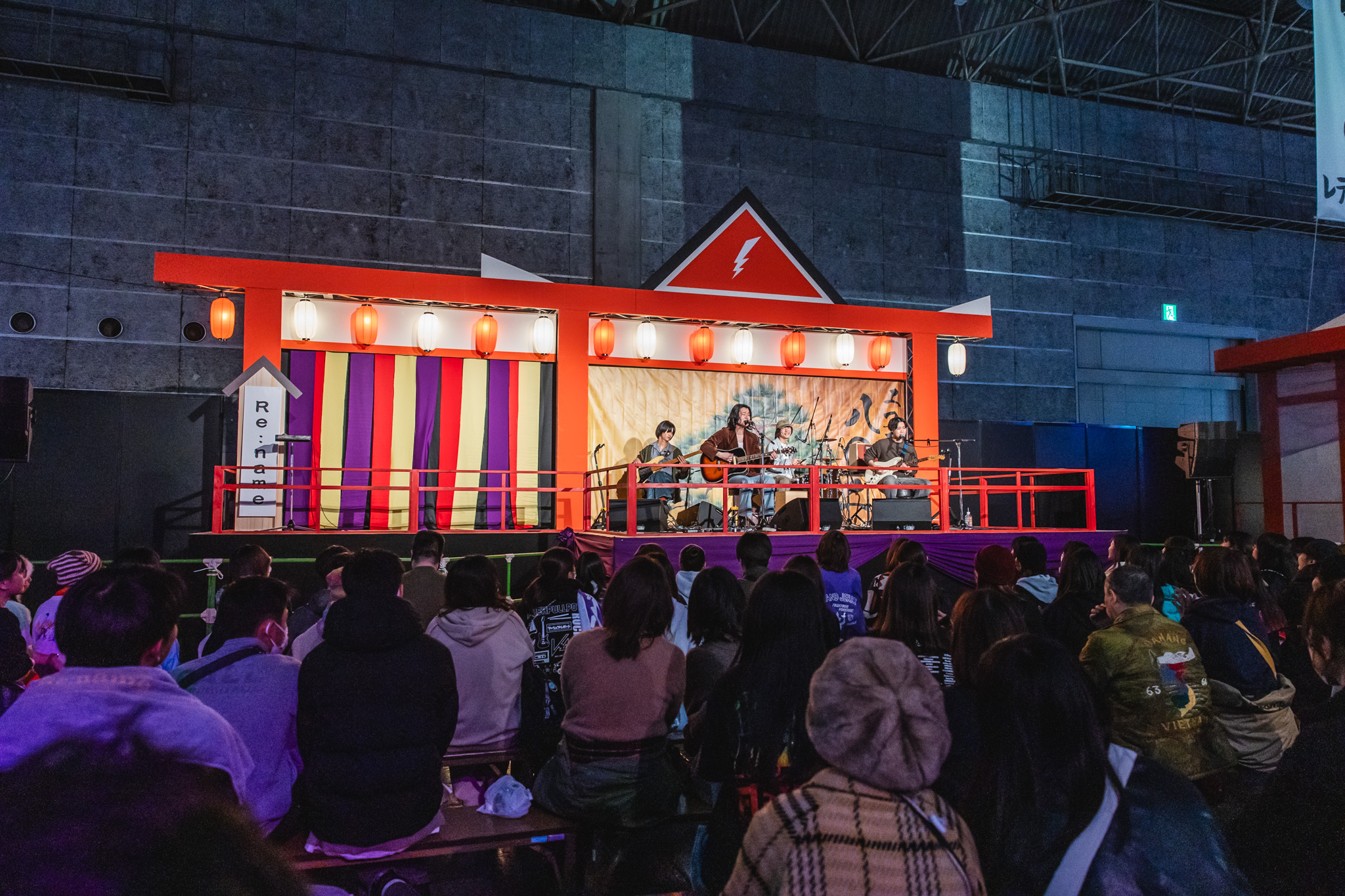アコースティックライブが行われる境内STAGEのトップを飾ったのが、Re:name。その時刻は15時30分。ちょうど甘いものが欲しくなるタイミングで、「Donut Song」が奏でられる。<大事な話はドーナツと少し苦めのコーヒーを 淹れてからにしてね>。その歌詞も、高木一成のボーカル、Somaのギター、ヤマケンのドラムの音色の柔らかさから、いつも以上に味わいが深まる。