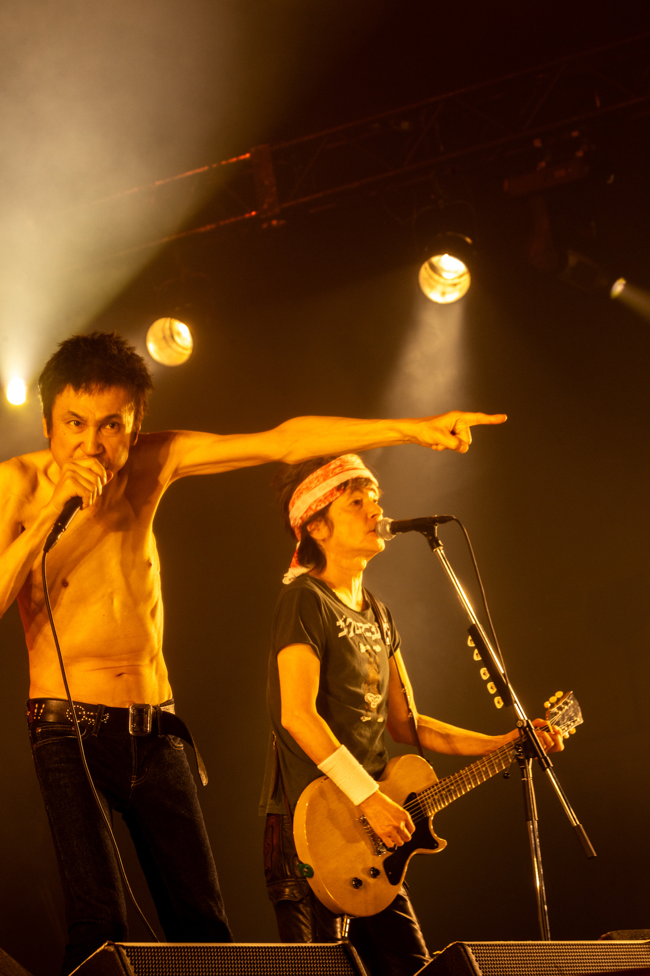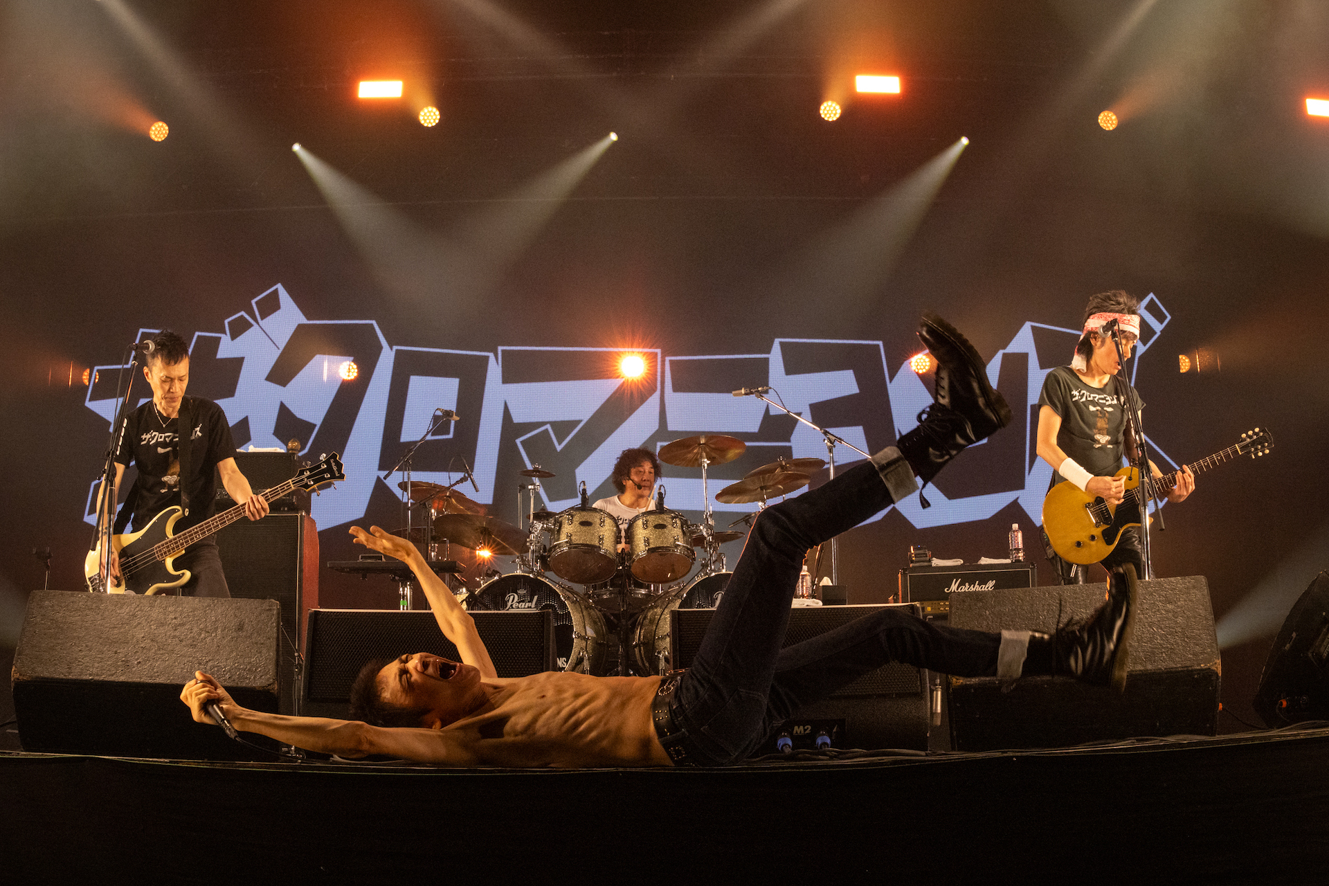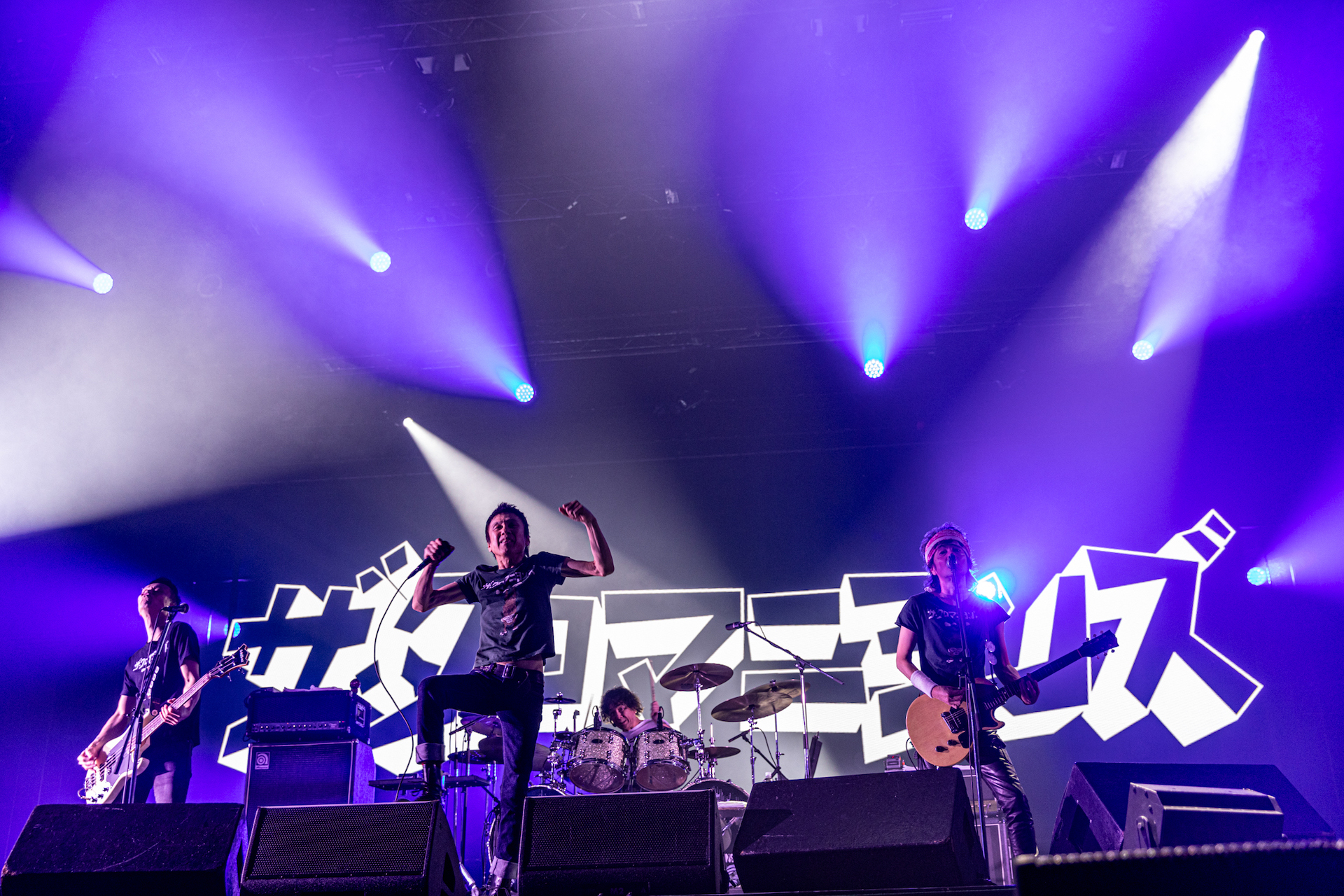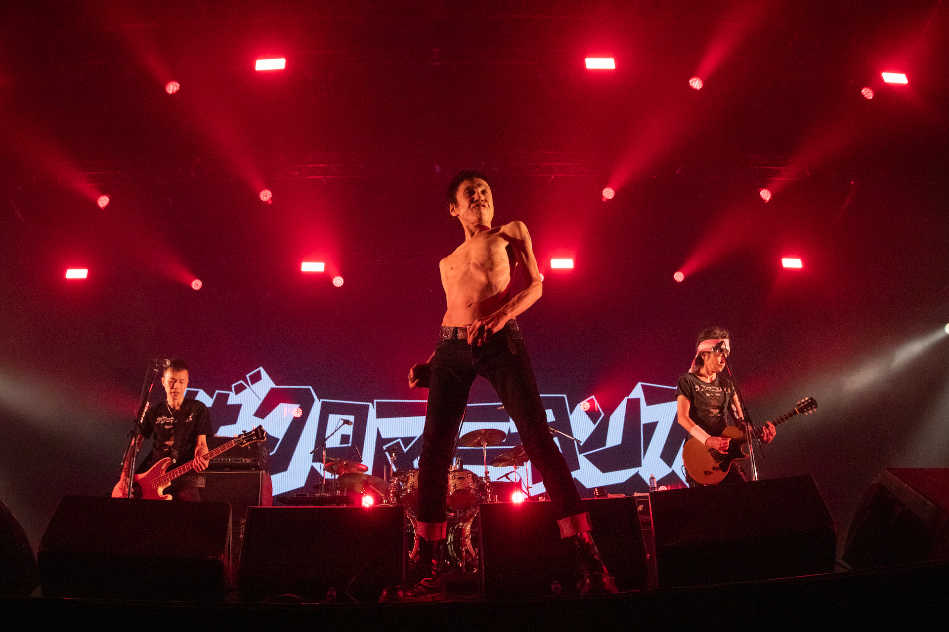 「オーライ、ロックンロール!」、甲本ヒロト(Vo)の声がSEを切り裂く。ザ・クロマニヨンズのお出ましだ。歌というより叫びと呼びたい「クロマニヨン・ストンプ」、サビの大合唱が起こった「タリホー」など、自分の胸を指差し叩きながら歌うヒロト、足をガバリと開き演奏する真島昌利(Gt)と小林勝(Ba)、そして頭を振ってリズムを刻む桐田勝治(Dr)の姿に視界はチカチカ、眩しくてならない。曲間ではヒロトの名を呼ぶ声が飛びまくる中「こんないっぱいありがとう! 楽しいなぁ! やり方は自由、どうぞ思い切り楽しい1日にして帰って下さい」というヒロトが放ち、またガンガン曲を続ける。