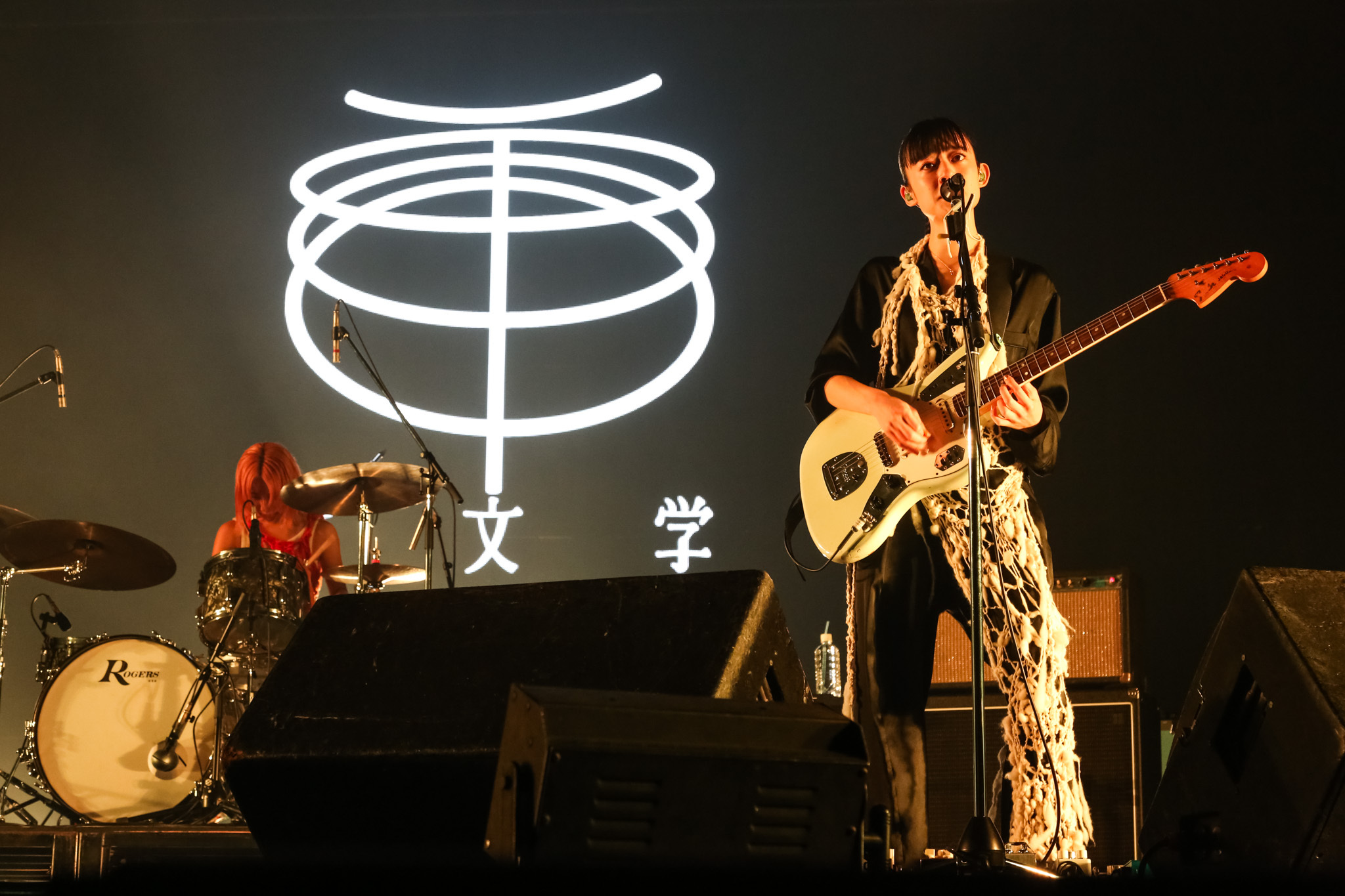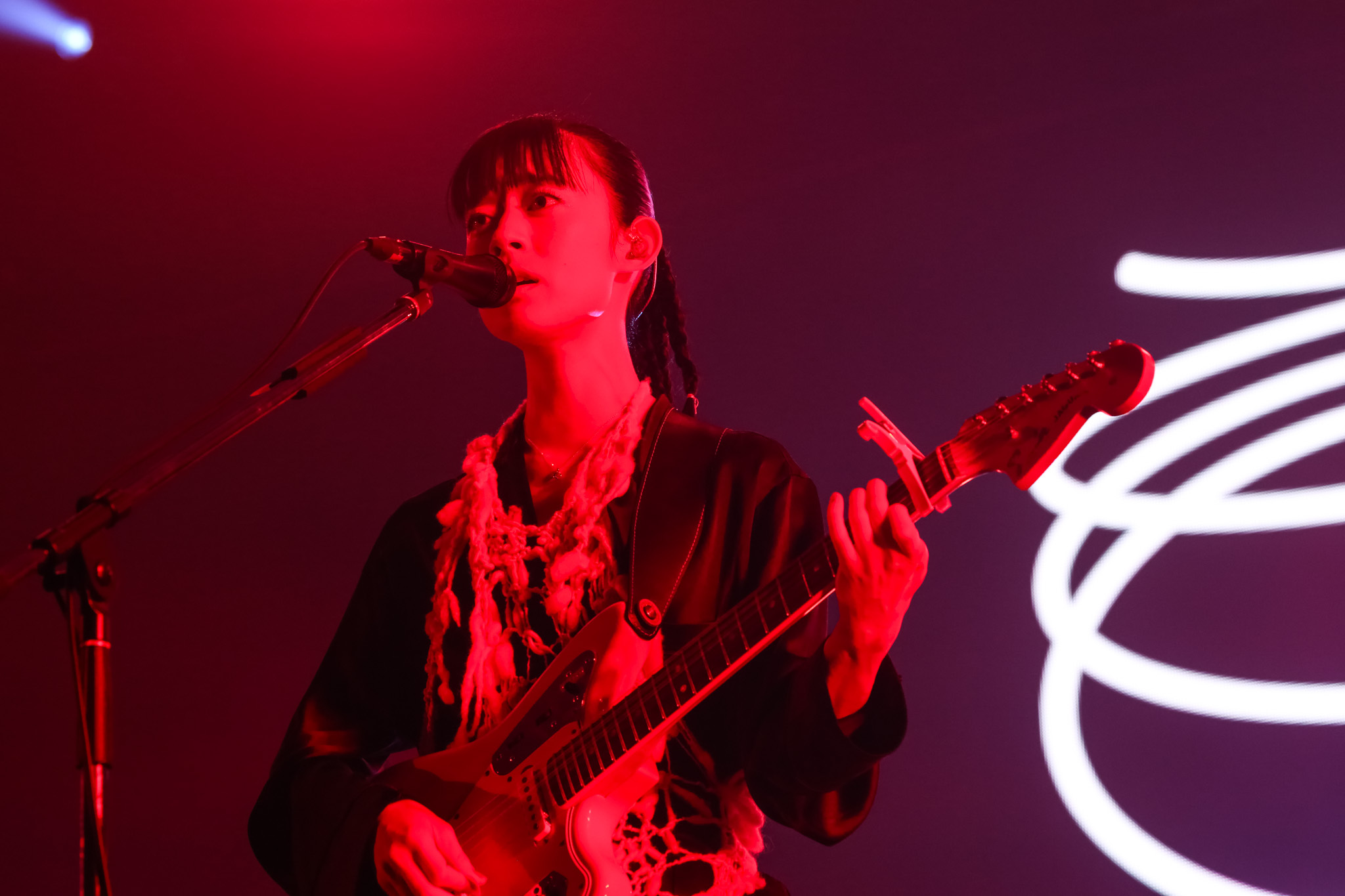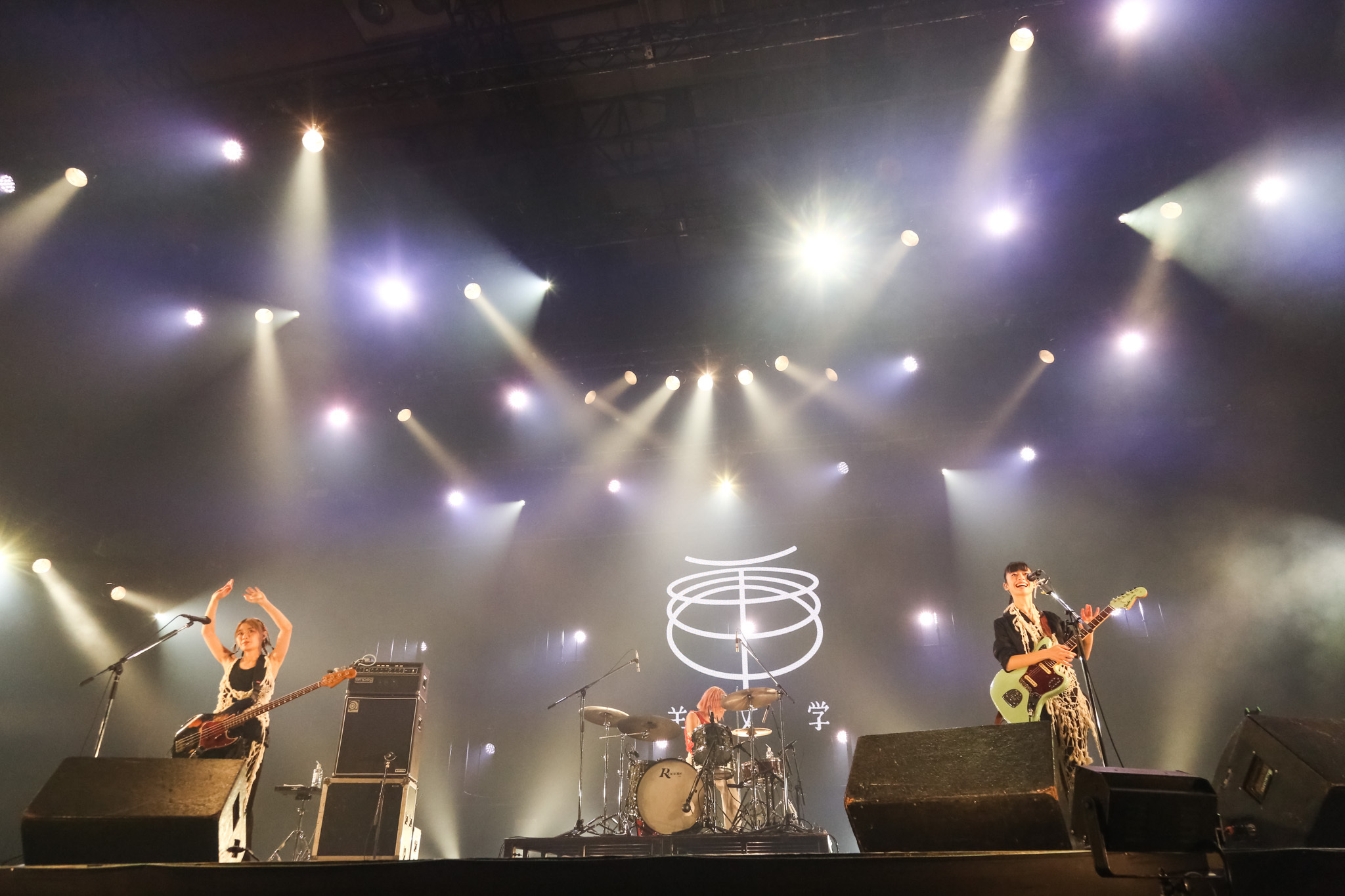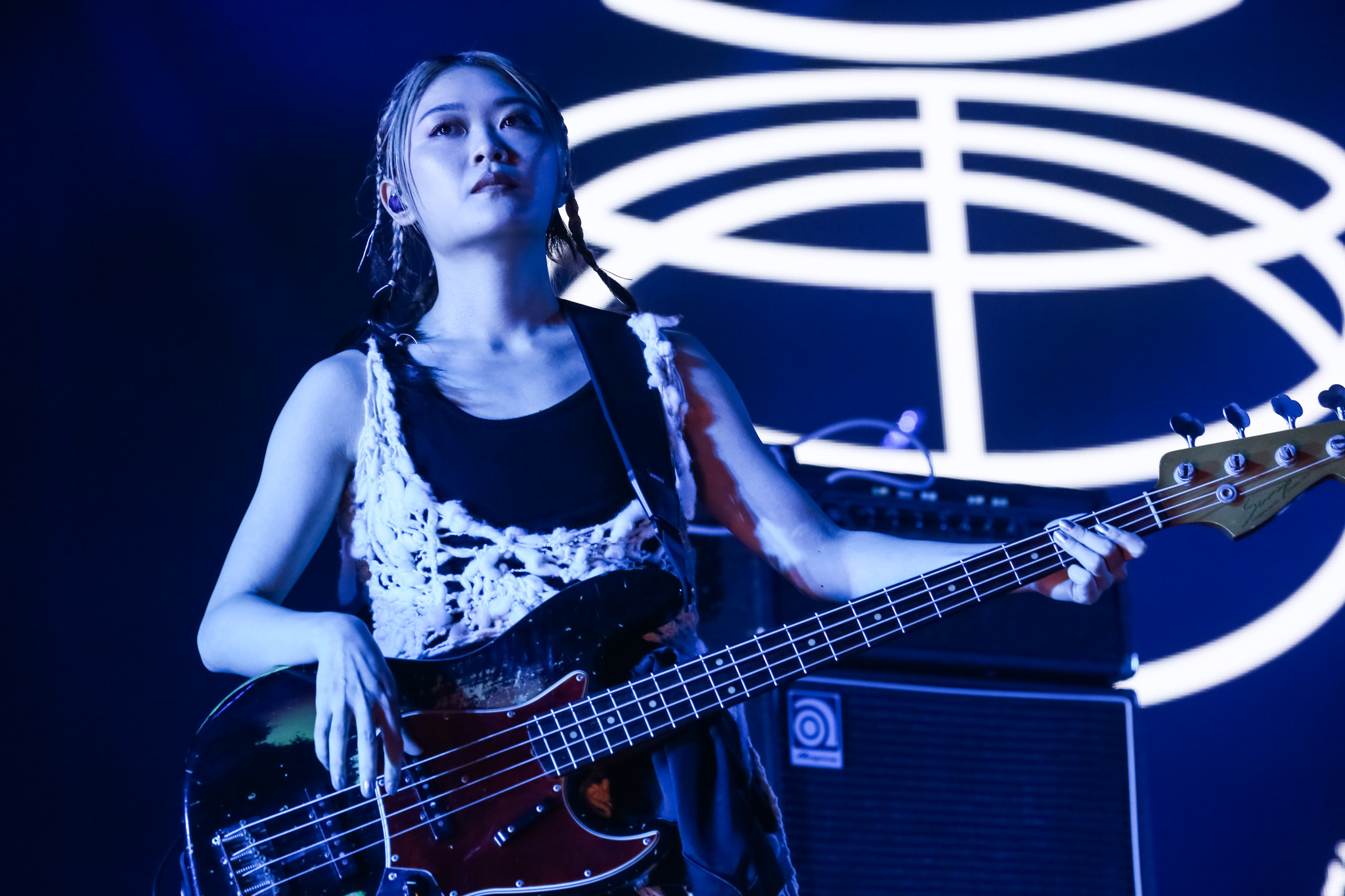 開始前から会場内の最後列まで人で満ち、注目度の高さが可視化されていた羊文学。この日は塩塚モエカ(Vo.Gt)、河西ゆりか(Ba)、サポートドラムにYUNA(ex. CHAI)という布陣で挑む。