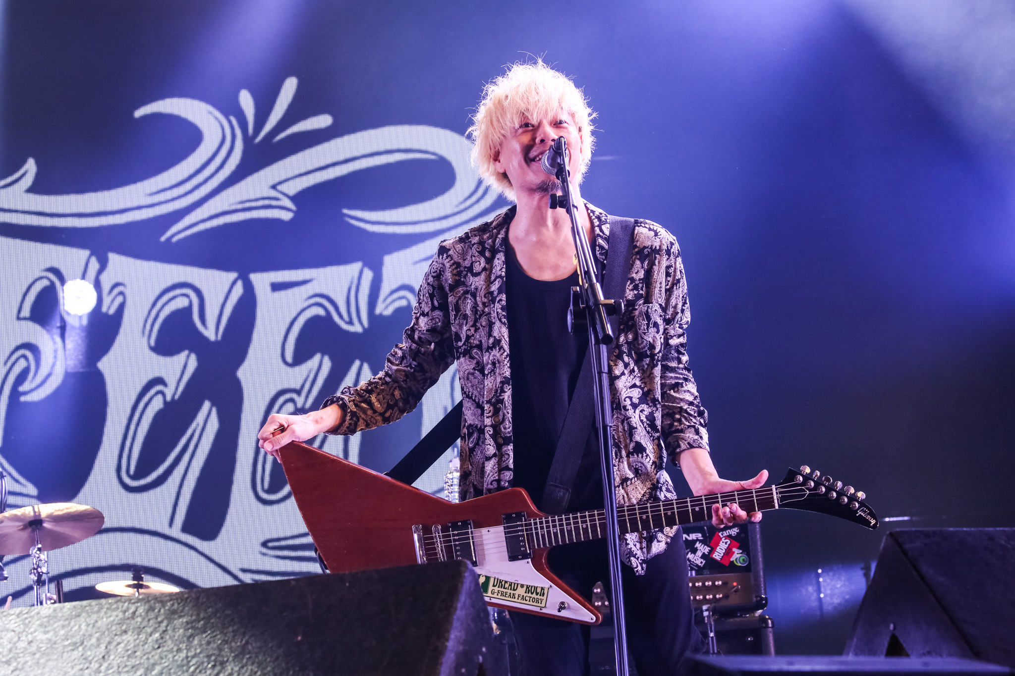 まだ早い昼の時間だが、勢いづいた観客から曲終わりに掛け声がかかり、クールに歌っていたホリエも思わず笑う。ライブならではの生なやり取りが微笑ましい。「Braver」ではホリエが鍵盤を弾くことで、ストレイテナーのメロディアスさが尚一層際立つ。「Skeletonize!」ではリズミカルながらも、激しい演奏であり、音が観客へ突き刺さっている感じした。