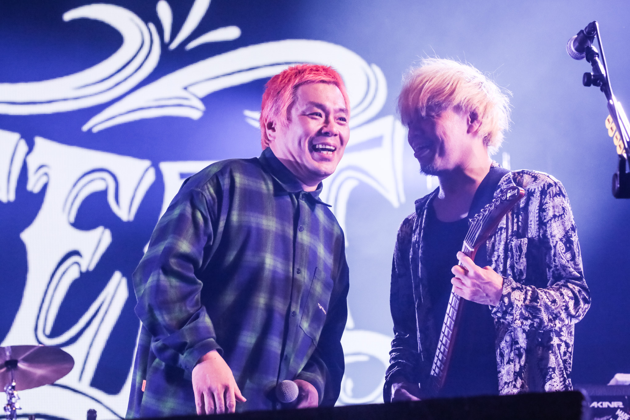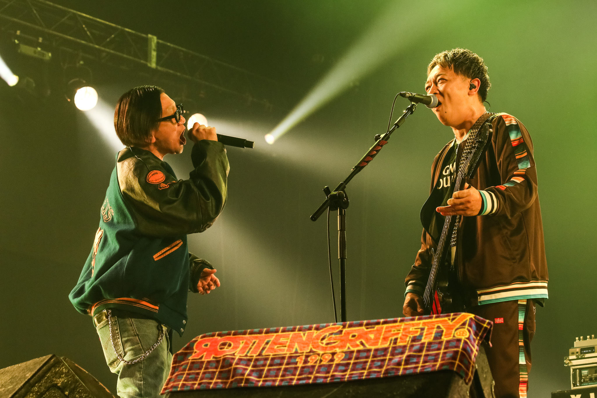 TAKUMAは「友達のバンドのドラムが助けにきてくれて。助けにきてもらう度にそのバンドの仲間が袖で観ているのでおもろいです」と語っていたが、もりもりもとを招き1曲目に鳴らした「JUST A FALSE! JUST A HOLE!」も、HIROSHIのみならずN∀OKI(ROTTENGRAFFTY/Vo)とNOBUYA(ROTTENGRAFFTY/Vo)まで登場し、もはや1つのバンドとして完成されているROTTENGRAFFTYと10-FEETのタッグとして届けた「その向こうへ」も、彼らがトリビュートアルバムや各地のライブハウス、そして盟友たちのフェスでちょっとばかりひねくれた、しかし根っこは真っすぐな愛を注いできたからこそ、実った成果にほかならない。
