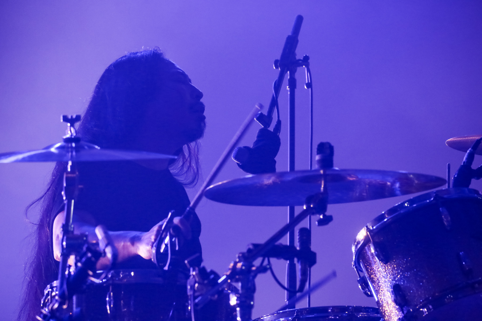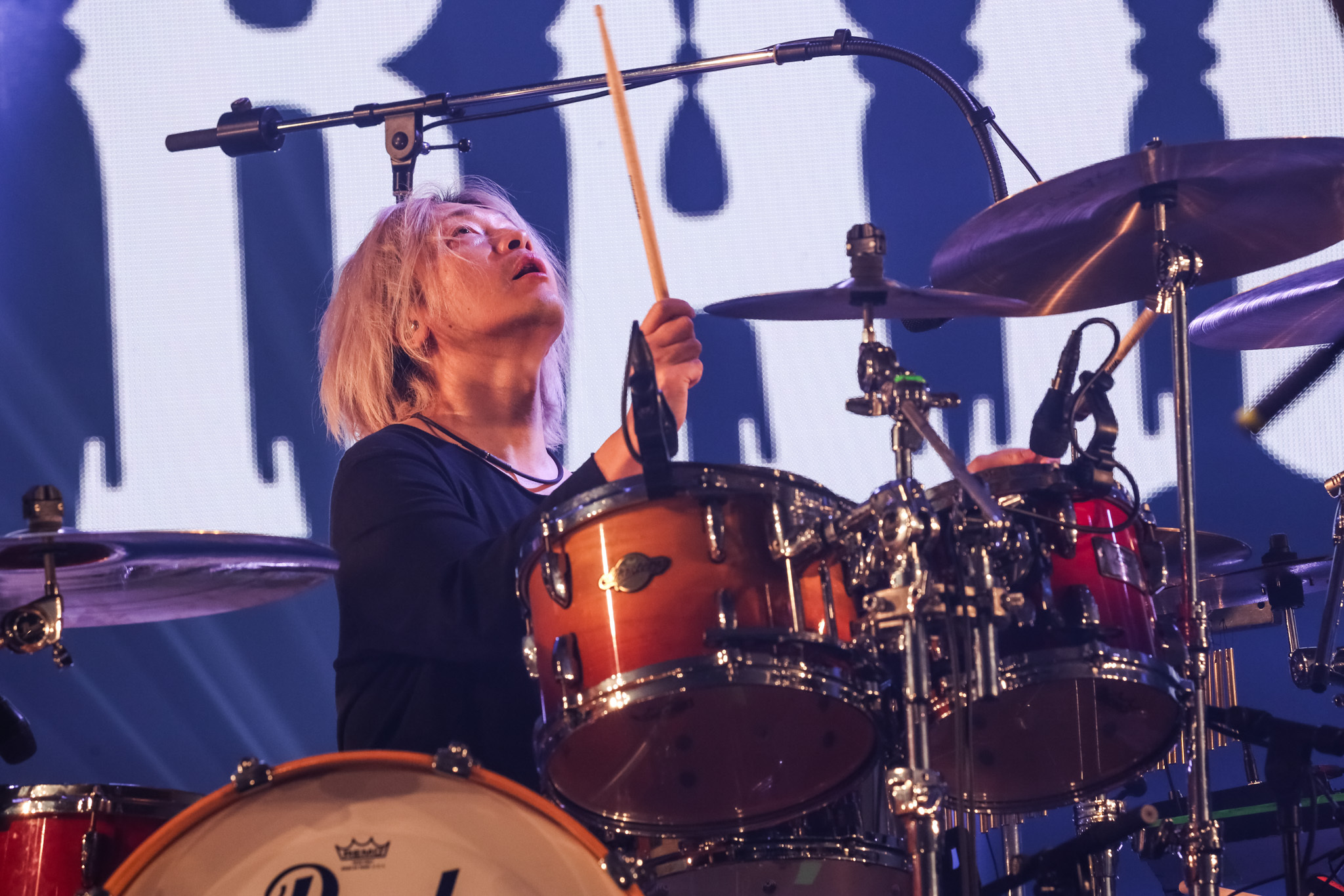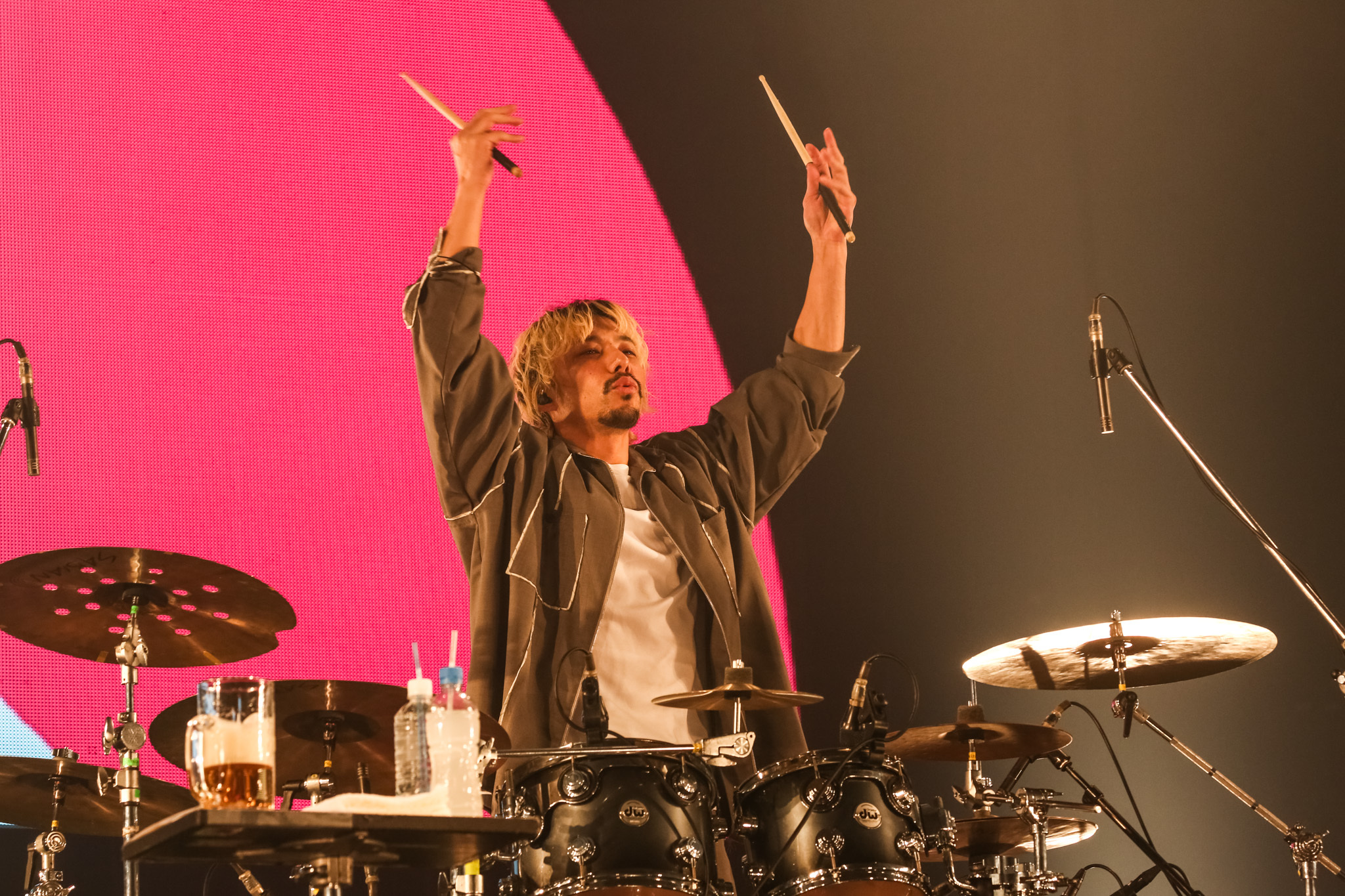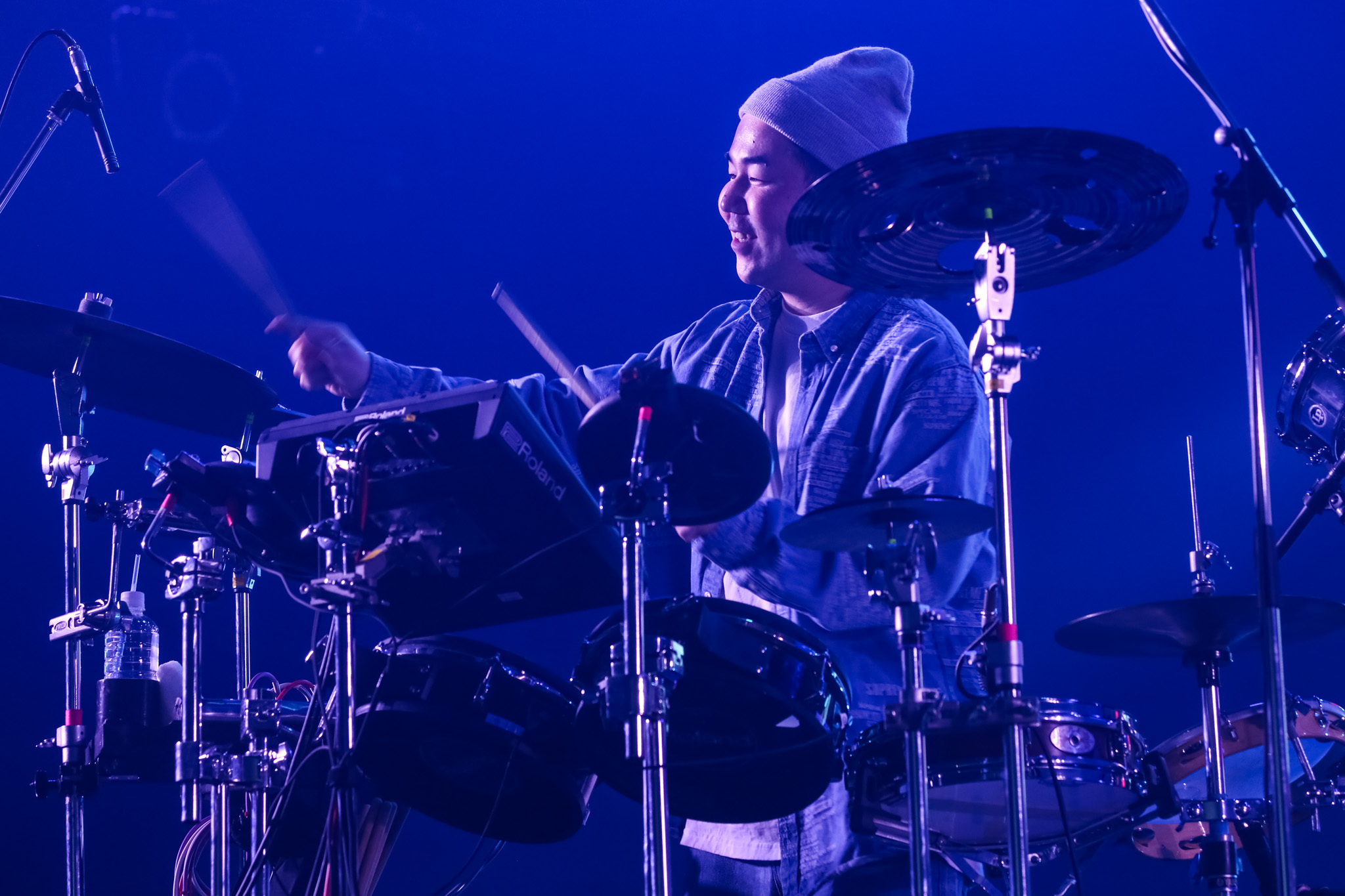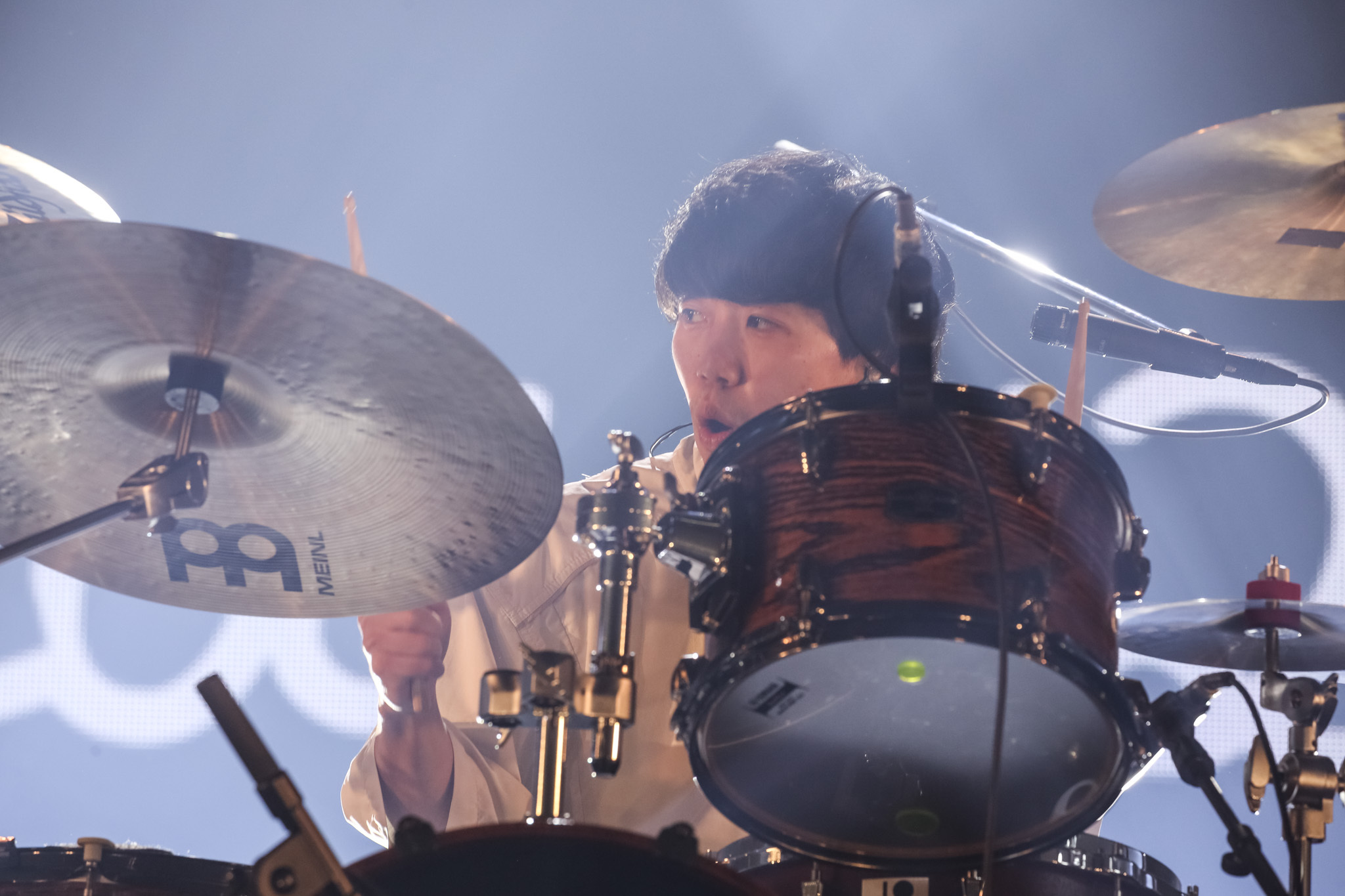 もりもりもとのローの効いたタムと攻撃的なNAOKI(Ba.Vo)のベースが抜群の相性を示した「STONE COLD BREAK」、柔らかなHIROSHIのドラミングが感傷的に響いた「蜃気楼」、早川の軽快なスネアが跳ねた「RIVER」。いずれの曲もそれぞれのドラマーによって異なるエッセンスが加えられており、さながら少年漫画でかつてのライバルと共闘するような特別感もあった。