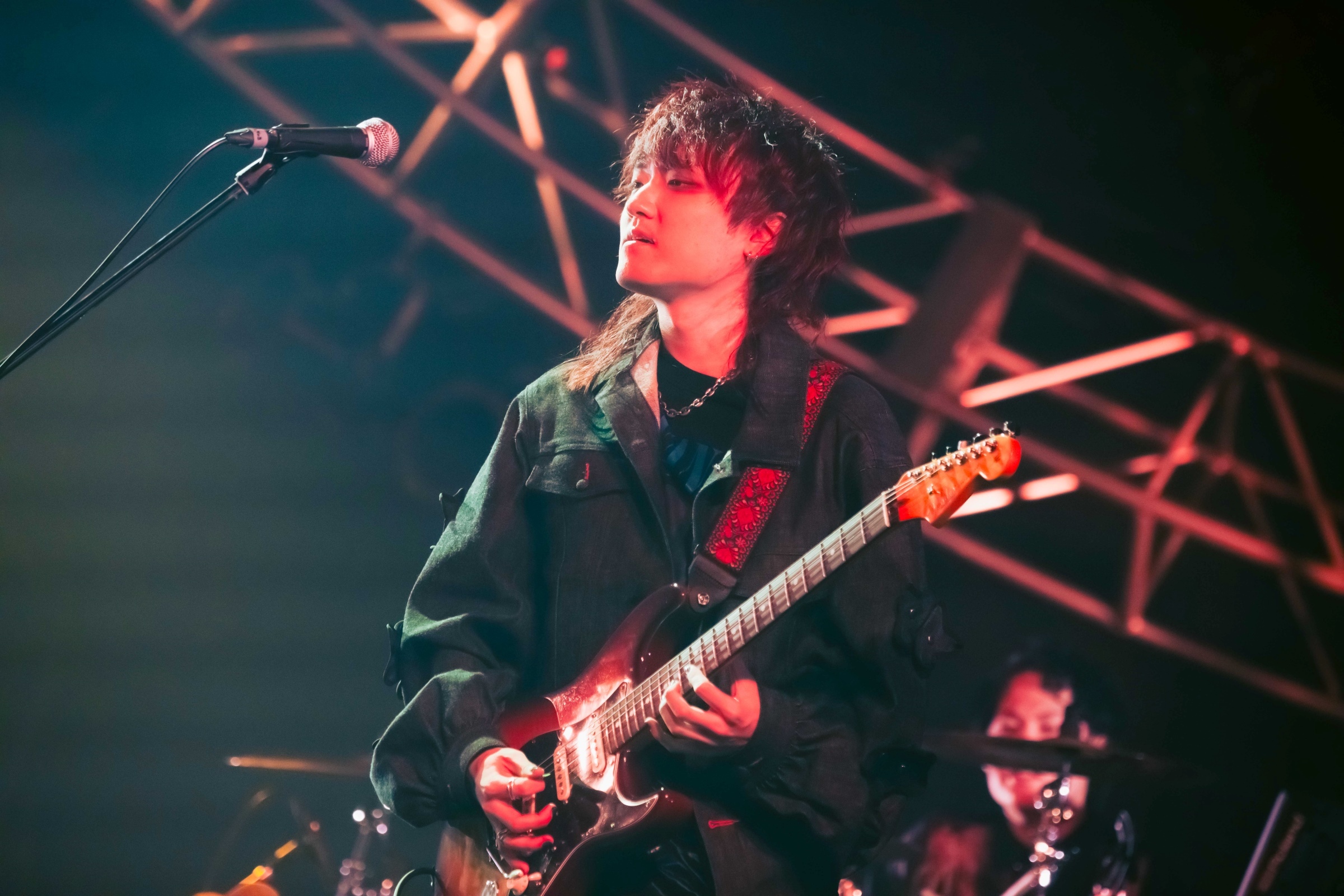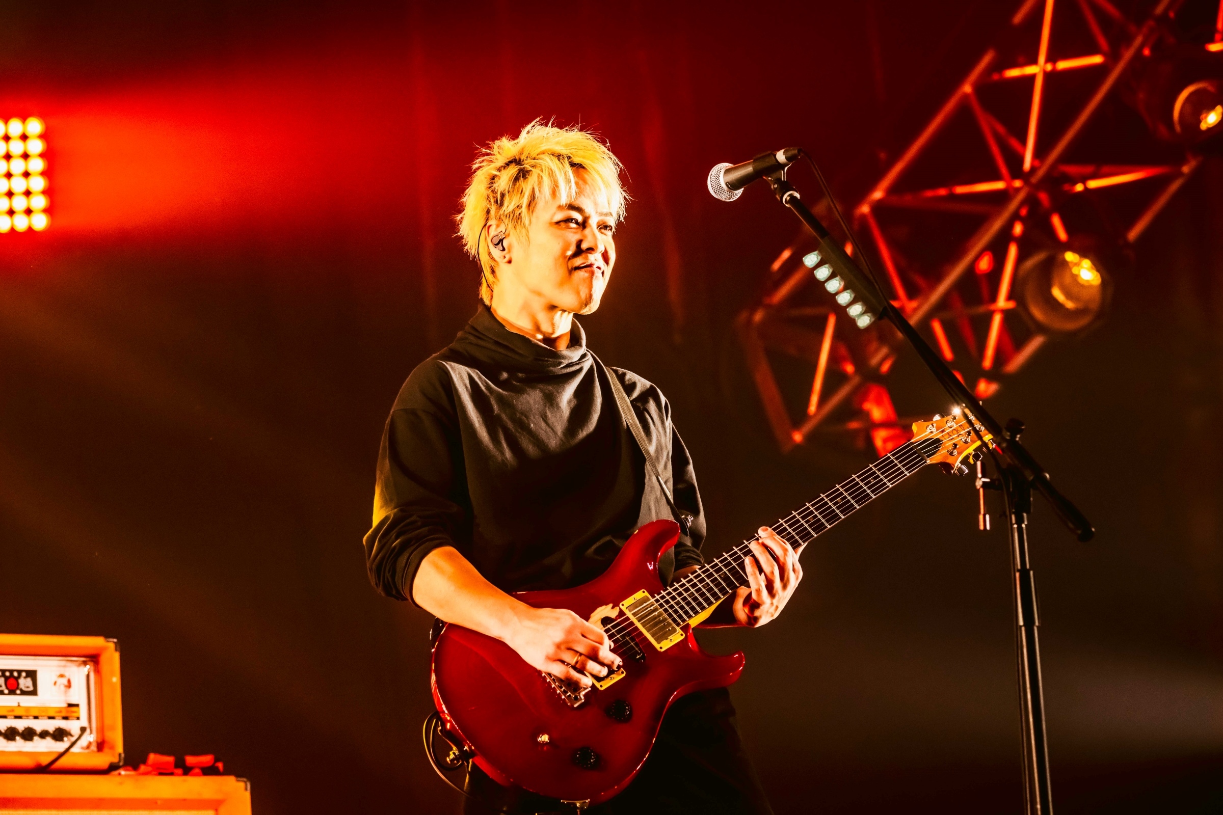 「ぶち壊していこうぜ、大阪」と煽りながら、オープニング曲「絶対零度」を激しいアクションをまじえながら演奏。ギターをハードに弾いていることが、その謎めくシルエットからはっきり伝わってくる。
