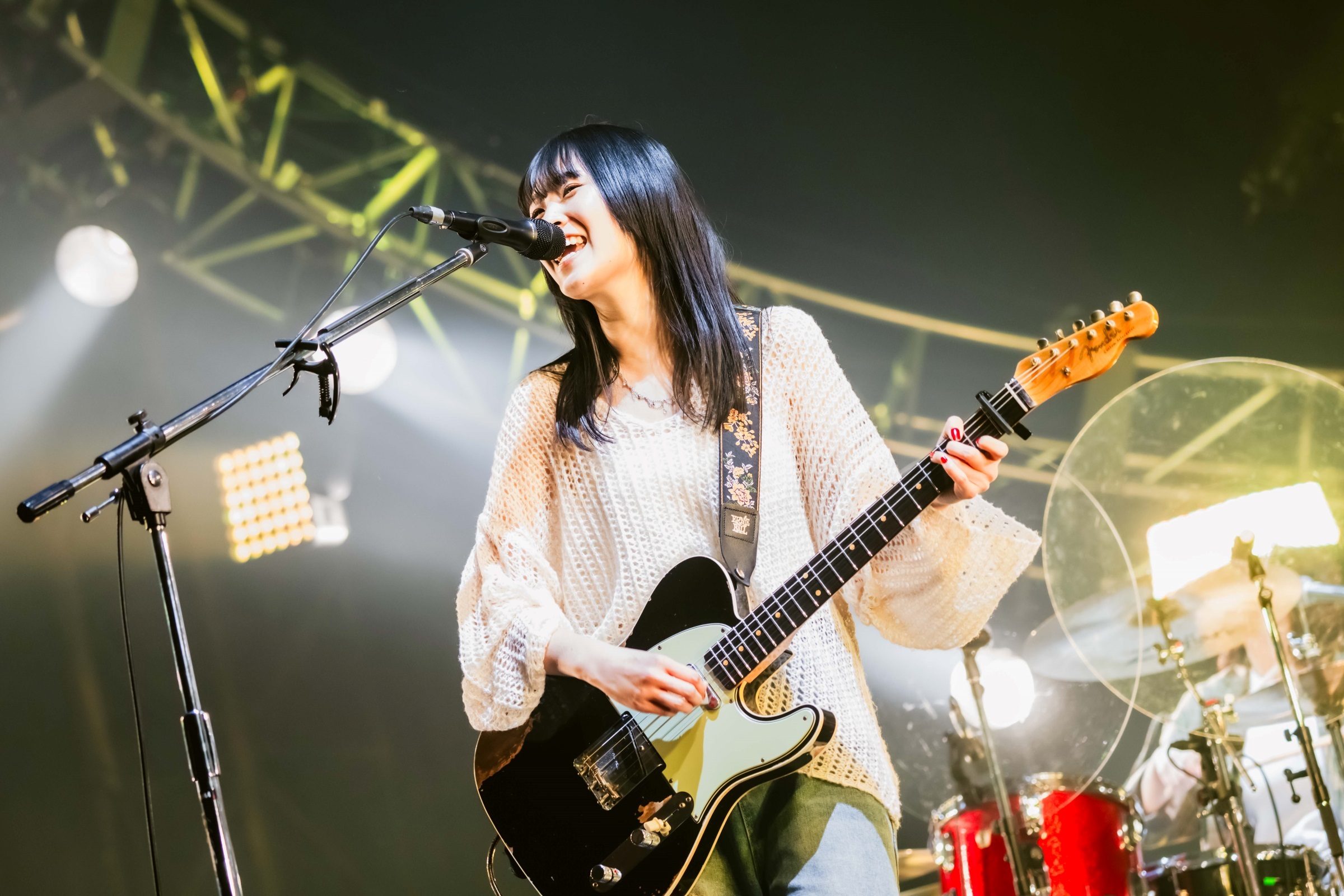 白いニットキャップにジャケットとパンツというハンサムスタイルで、恐竜のぬいぐるみを手に舞台に現れたにしな。歪んだギターの音を鳴り響かせて「クランベリージャムをかけて」でライブは幕開け。早々にフロアへとぬいぐるみを投げ込み、歌いながらステージに置いていたふわふわの白いバッグを手に「キャンディー欲しい人ー?」と手の挙がる方へ投げ込み笑う姿もチャーミングに映る。