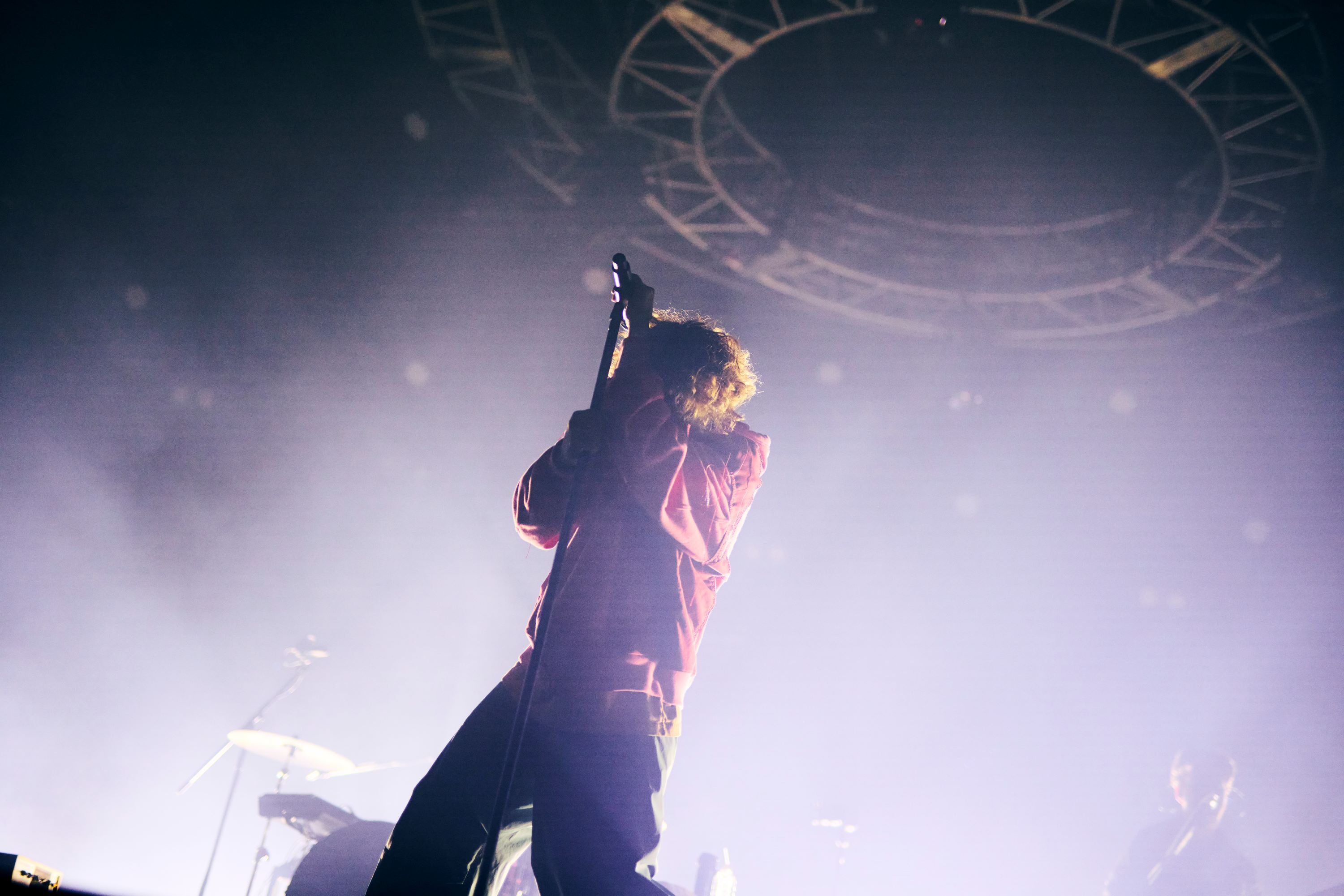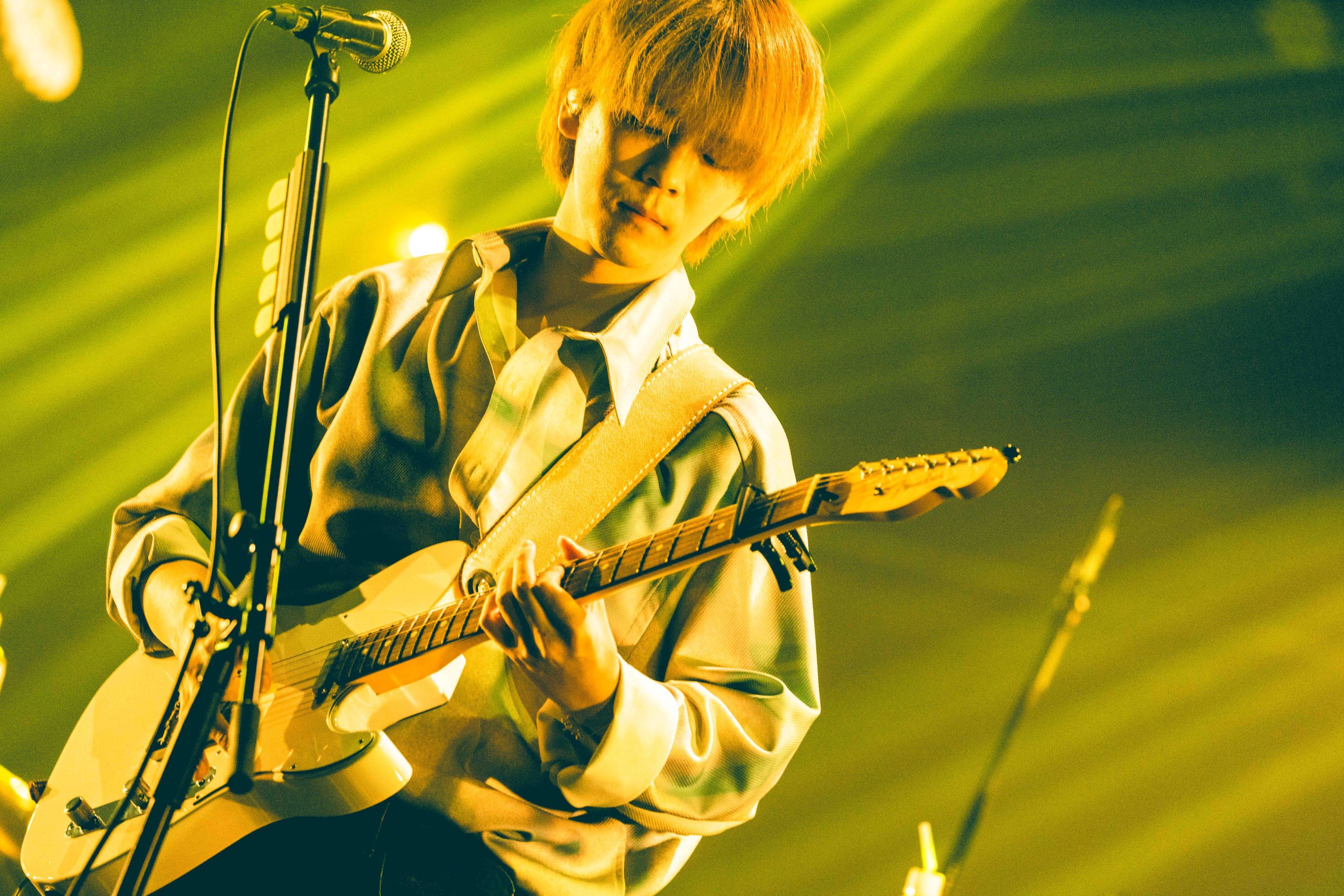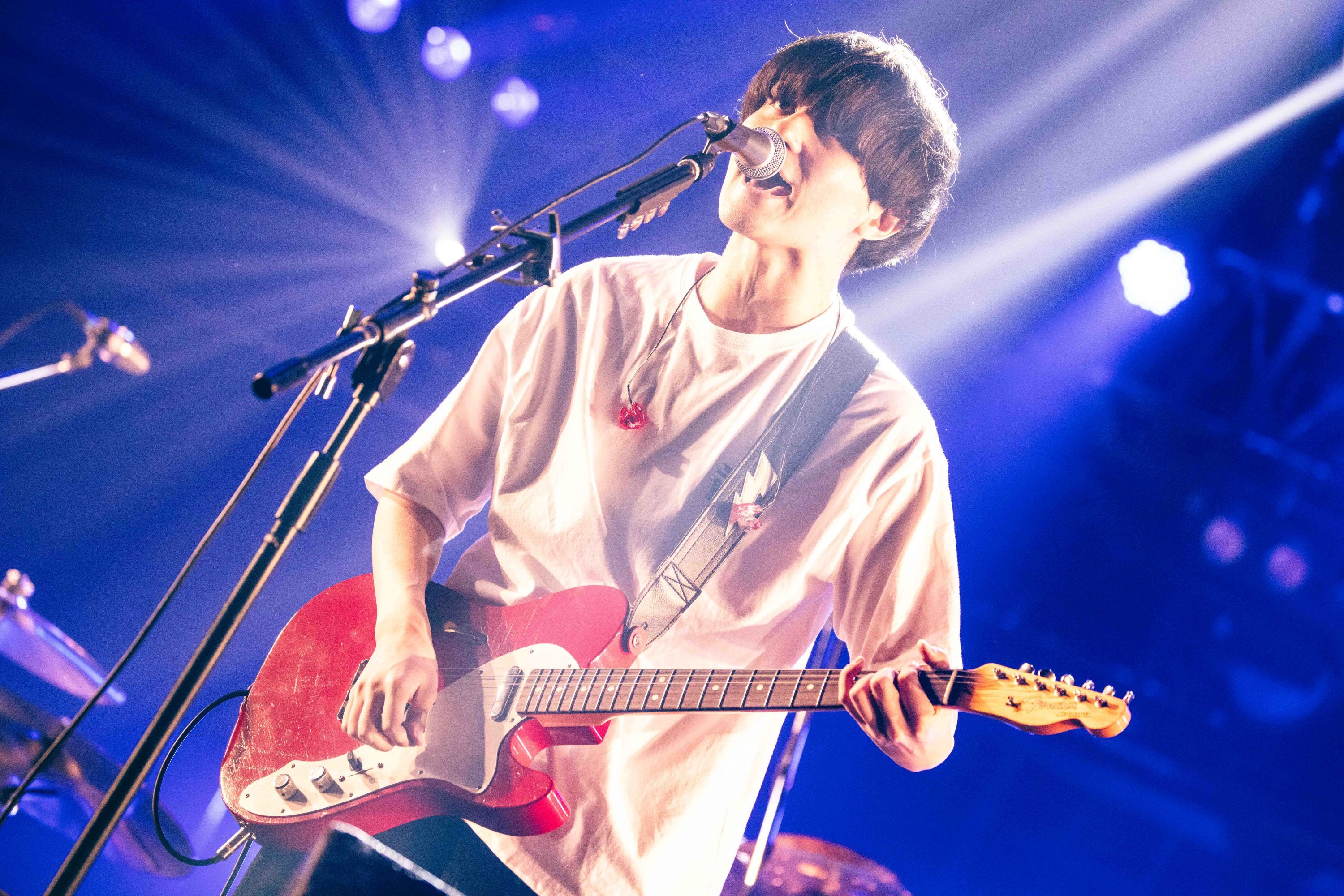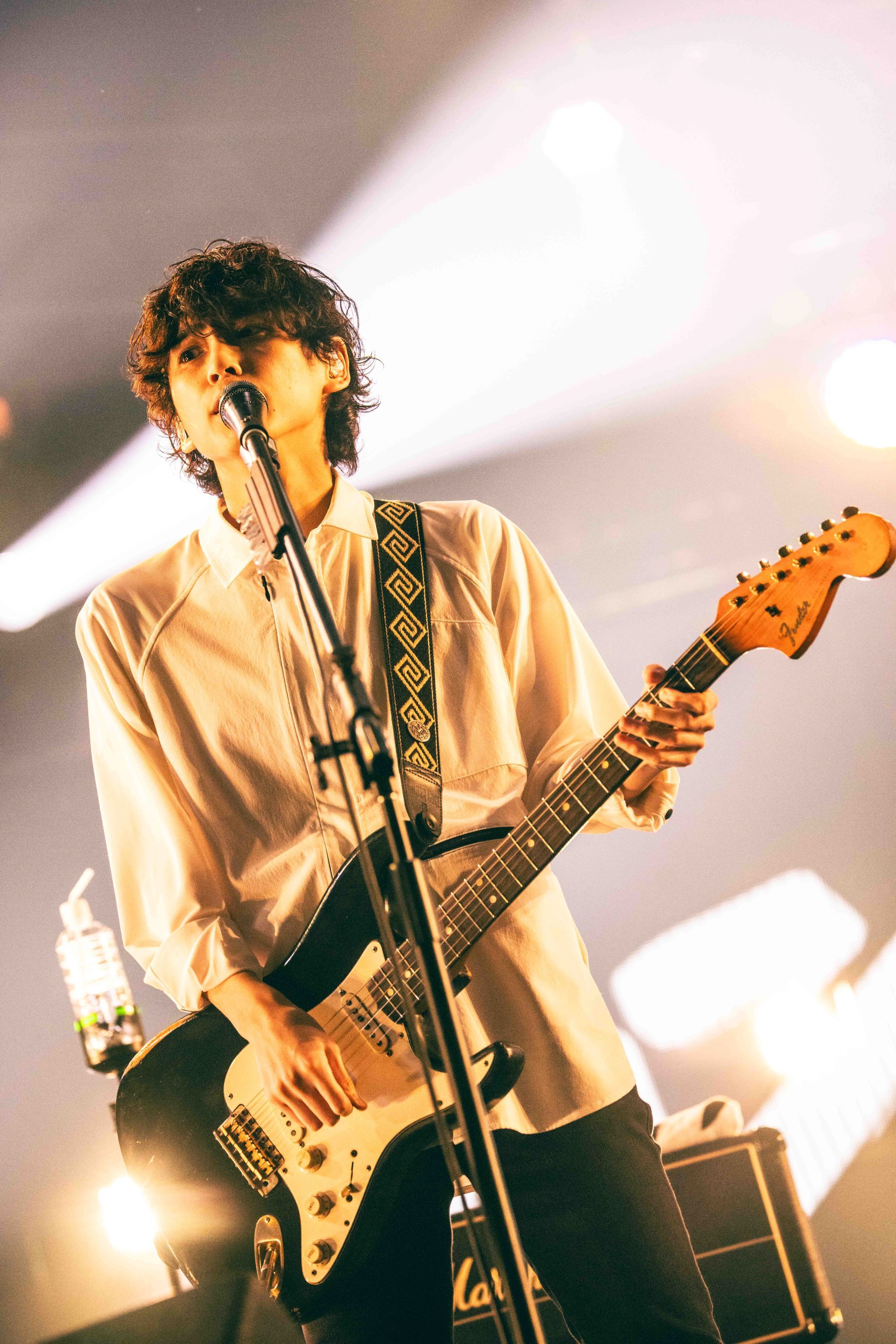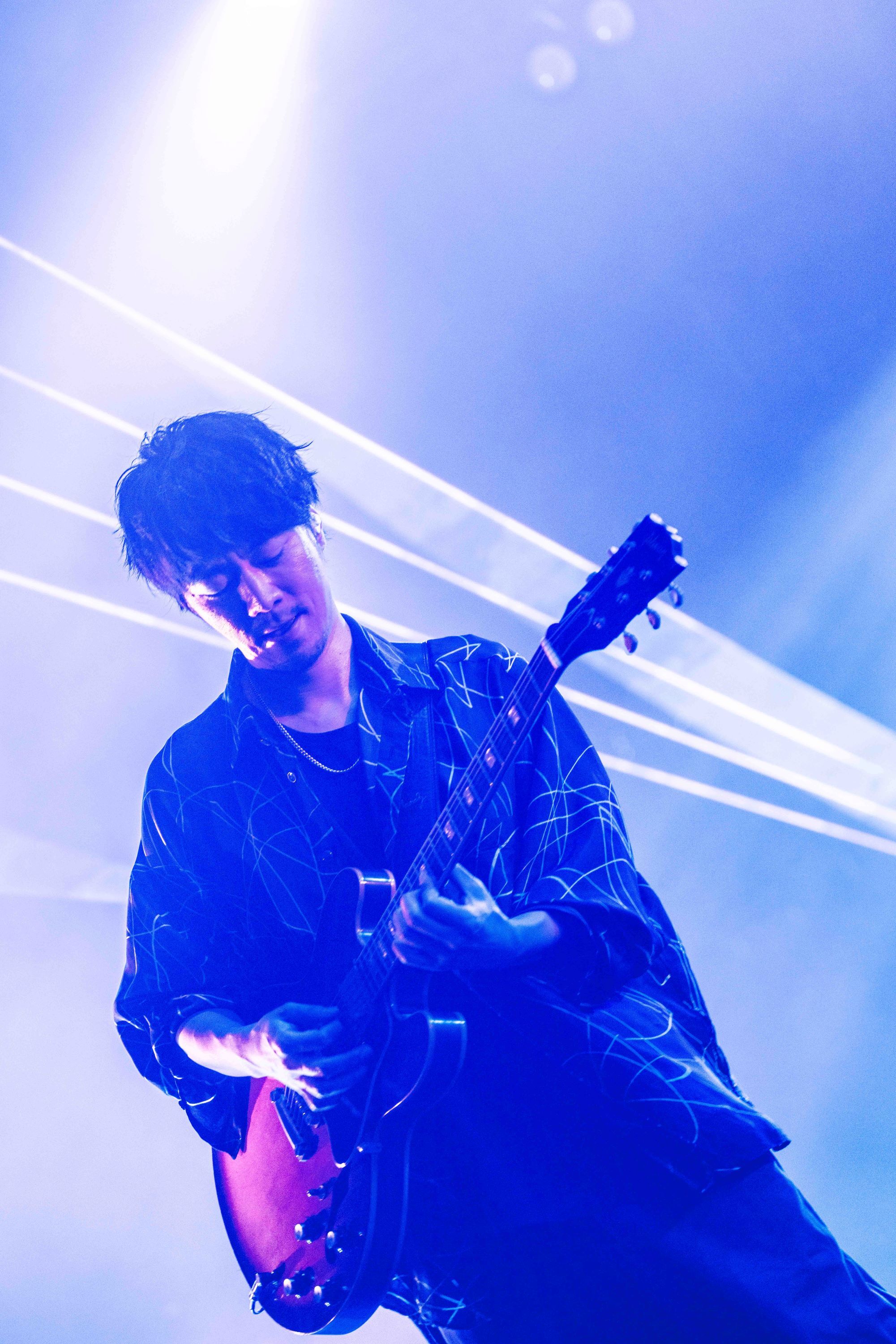 眩い照明の中から聞こえる、ムツムロアキラ(Vo.Gt)の「大阪ただいま!」の挨拶。前のめりの演奏が繰り広げられた「グー」に始まり、「今日、俺たちがきた理由はただひとつ。悲しいこと、憂鬱なこと、全部ギターでぶっ壊しに来ました」と「ギター」などを披露。「DANCING IN THE ROOM」では、<モタモタしていたらあっという間に12時>の歌詞パートでムツムロが腕時計を指す仕草をするなど、いろんな身振り手振りも楽しめた。