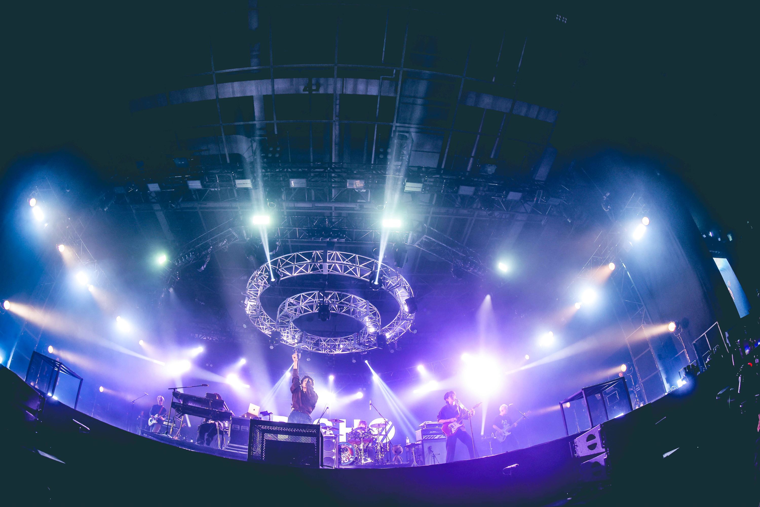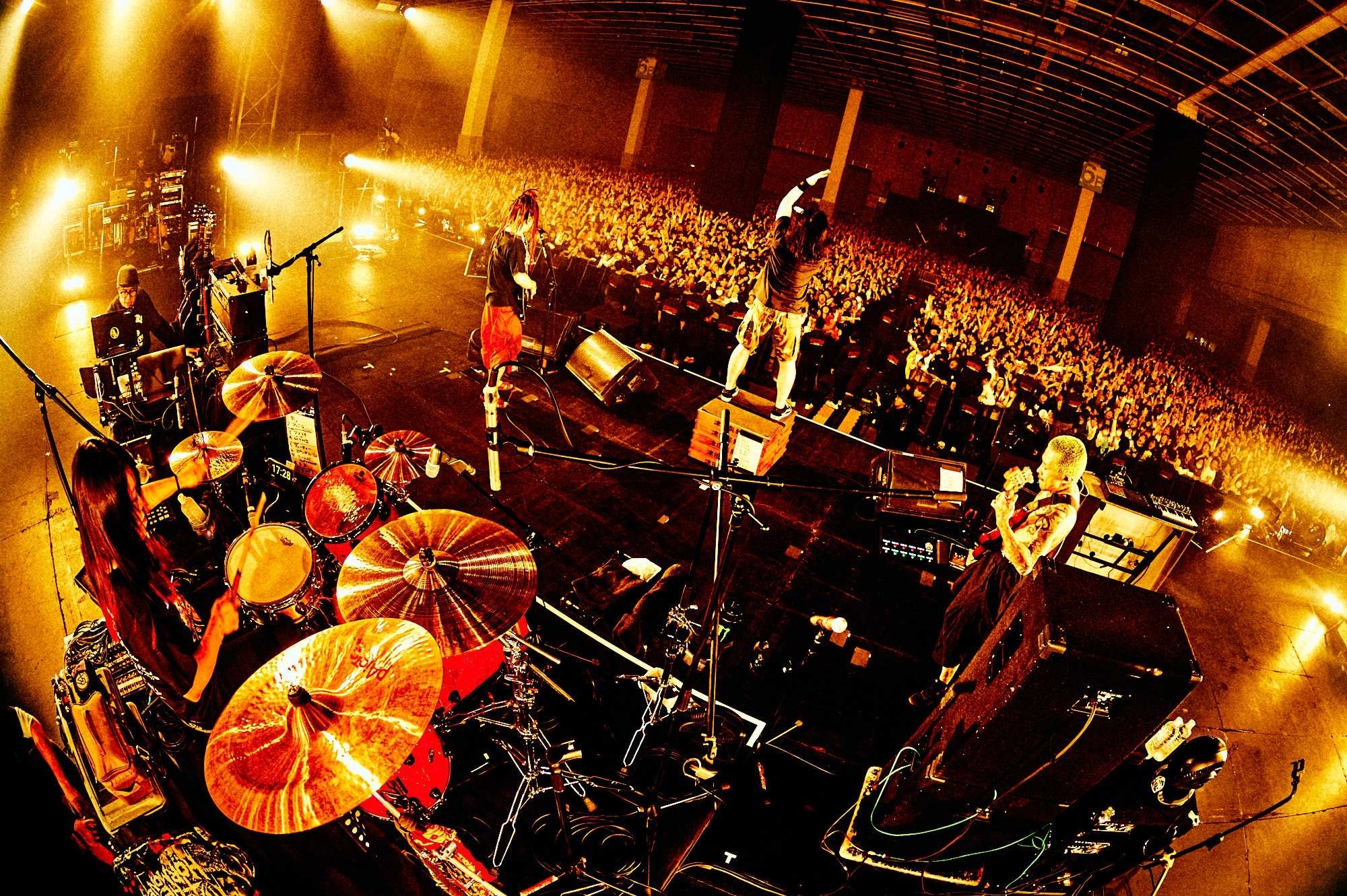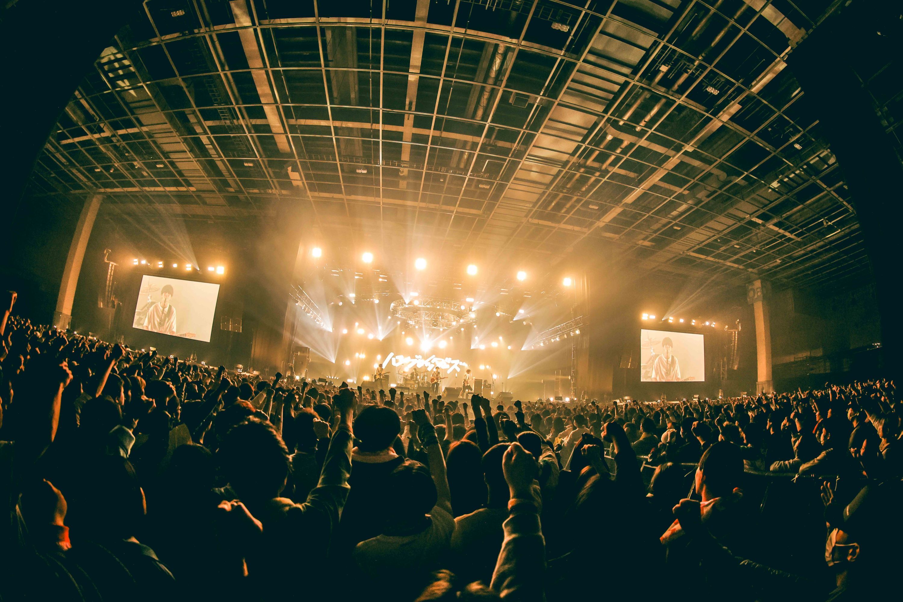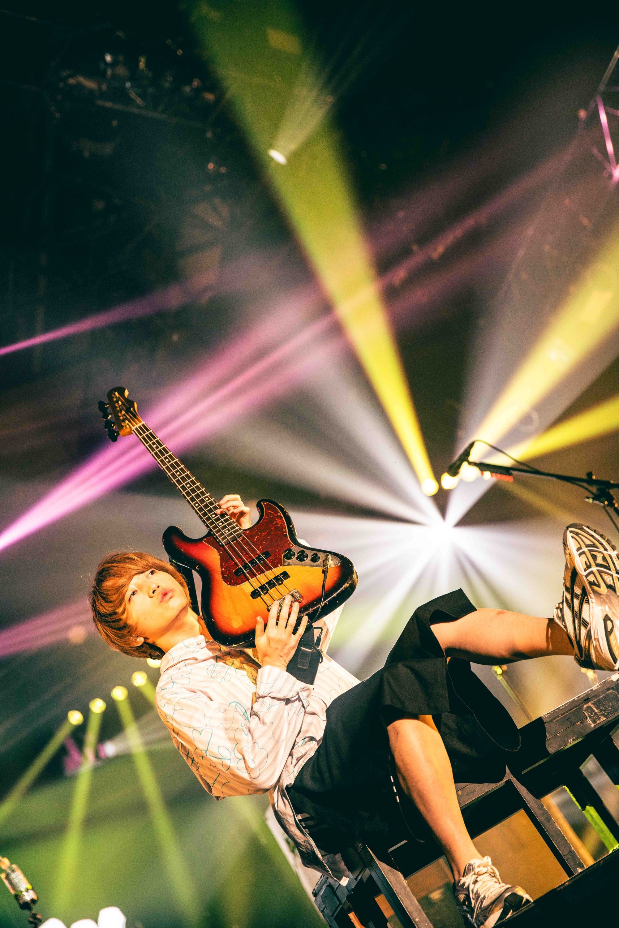 サウンドチェックから大空間を沸かし、繰り出す初手は「プランA」。アグレッシブな和のロックは合いの手的なコーラスでも盛り上げて歓声を引き出し、すぐに次の「No.1」へ。今度は疾走感やスケール感に観客の掲げた手が揺れ、すべてがきらめくような光景が広がる。