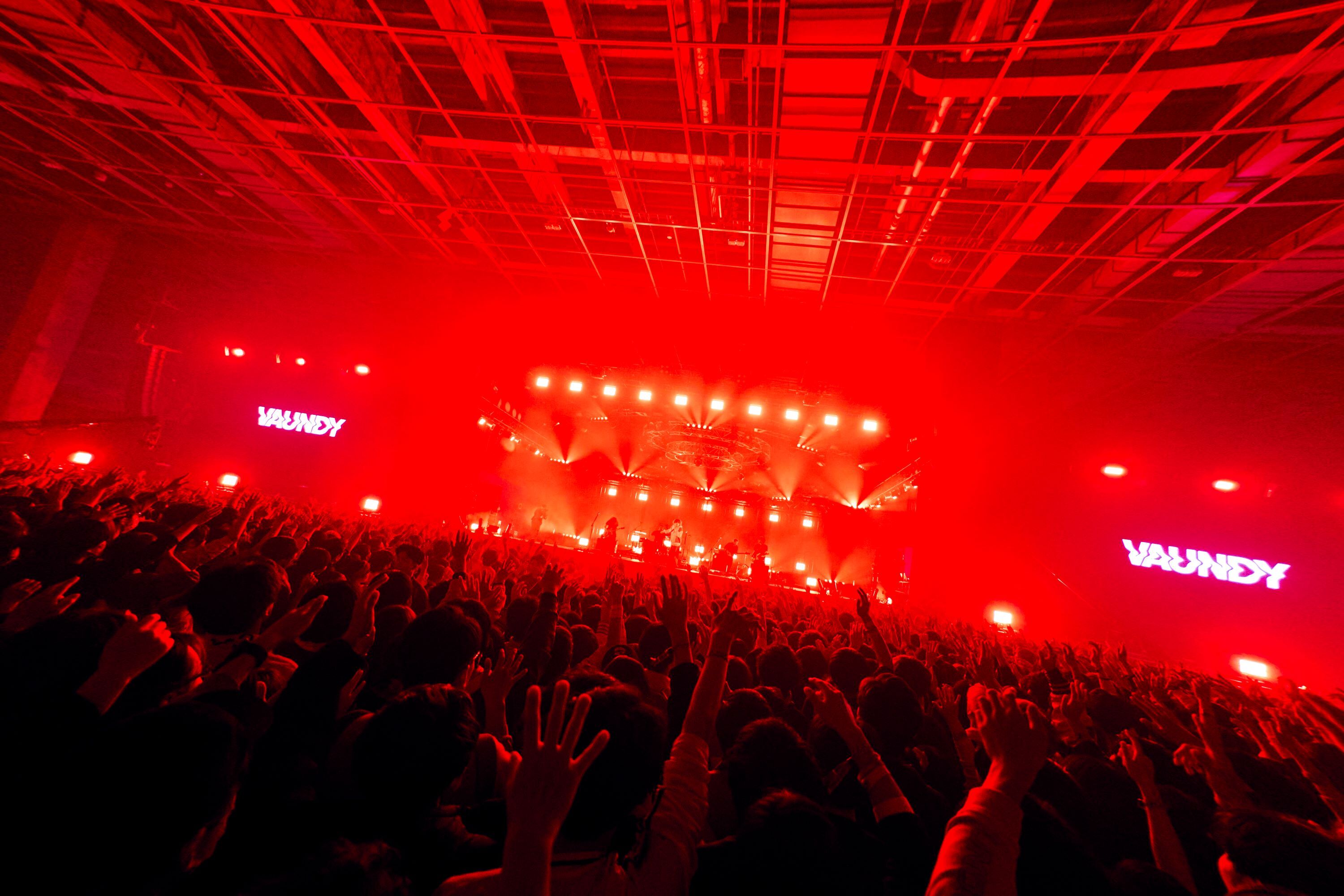 そして急に訪れた無音の時間。いよいよ中継が始まるらしい。意外と長い無音に会場がざわめくと、Vaundyが「緊張してきた? あと20秒だってよ」と言った直後に生放送中の『Mステ』サイドから鈴木新彩アナの声が届く。「Vaundyは大阪から中継でのご出演となります」。するとタモリからの「ライブ中? すごいね、お客さーん!」という声に、地鳴りのような「うぉぉぉぉ!」という歓声と拍手で応える。再び鈴木アナからの「風神」「花占い」「怪獣の花唄」3曲続けてどうぞ、のフリでパフォーマンス&日本全国への生中継が始まった……! いわずもがな歴代の曲の中でも圧倒的人気を誇る3曲の披露中、溌剌としたパフォーマンスを見せるVaundy、レーザーが飛び交い、紙吹雪が舞い、大音量の手拍子とそこら中で上がる手、ジャンプする人に聞こえてくる大合唱、ラストで舞う銀テープ。何もかもがスペシャルで、キラキラした光景がそこにあった。全国の人が観てるんだよなぁという不思議な感覚とテレビの中にいる自分たち。日本中と共有した3曲で体感した興奮は、しばらく忘れられそうにない。中継が終わった瞬間、間髪入れずに「俺らはまだまだいくぞ!」とラストナンバーへと雪崩れ込んだ。パフォーマンスをやり切ったVaundyはかわいく小さくペコリ。彼が去っても熱狂と歓喜に体を支配され、すぐには動けない人の姿がたくさんあった。