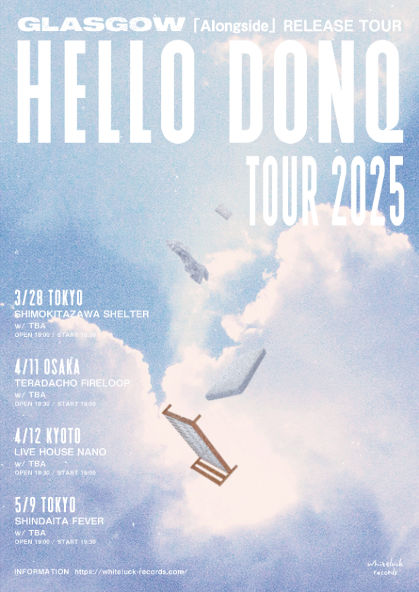 また、『Alongside』を携えたツアー『GLASGOW presents. HELLO DONQ TOUR』を開催することも発表。同ツアーでは、3月28日(金)東京・下北沢 SHELTERを皮切りに、全4公演を開催。5月9日(金)の東京・新代田FEVER公演でファイナルを迎える。チケットは、イープラスにて受付中。