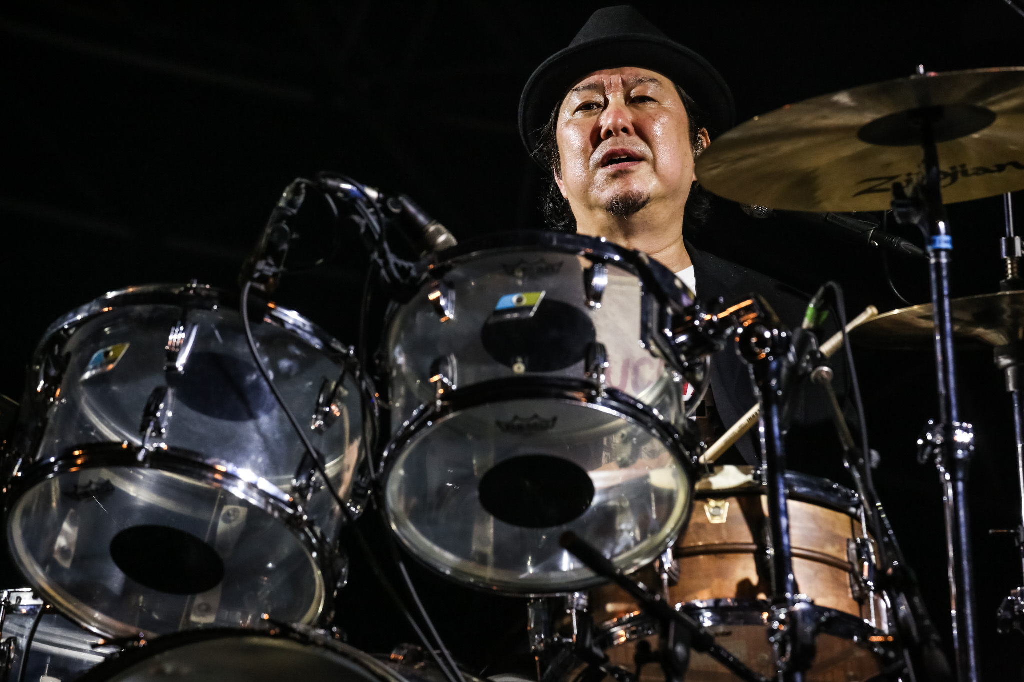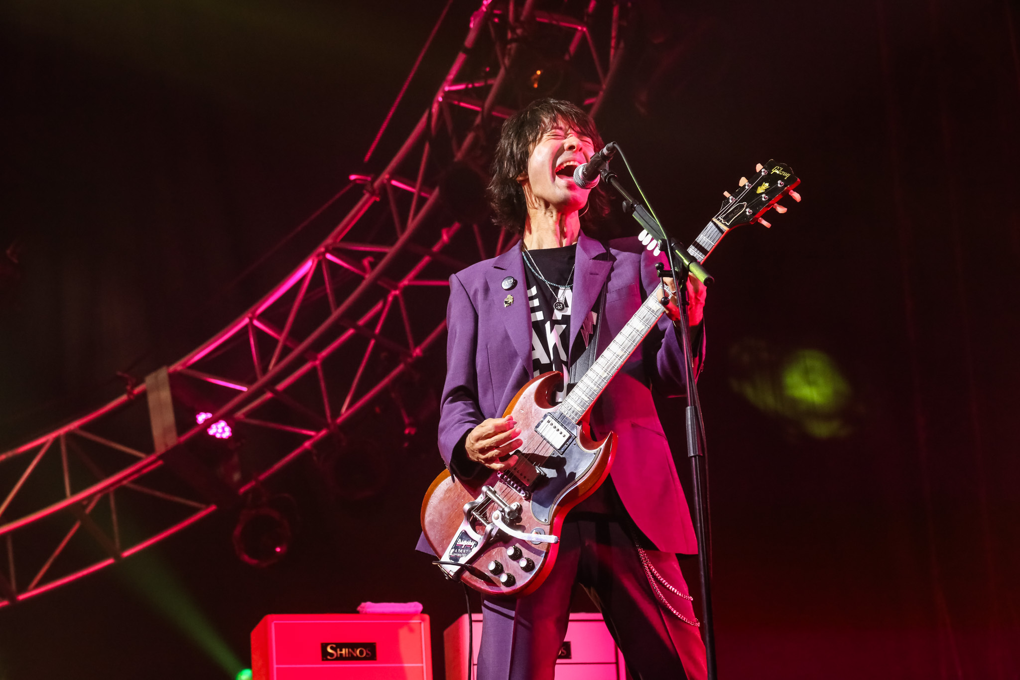 菅原卓郎が右手を大きく上げて優雅に頭と共に下げる。それだけで絵になる。1曲目「Baby,Please Burn Out」からギターの滝善充・ベースの中村和彦と共に大回り大暴れで、音もうねりまくりと絶好調なのが一聴しただけで伝わってきた。