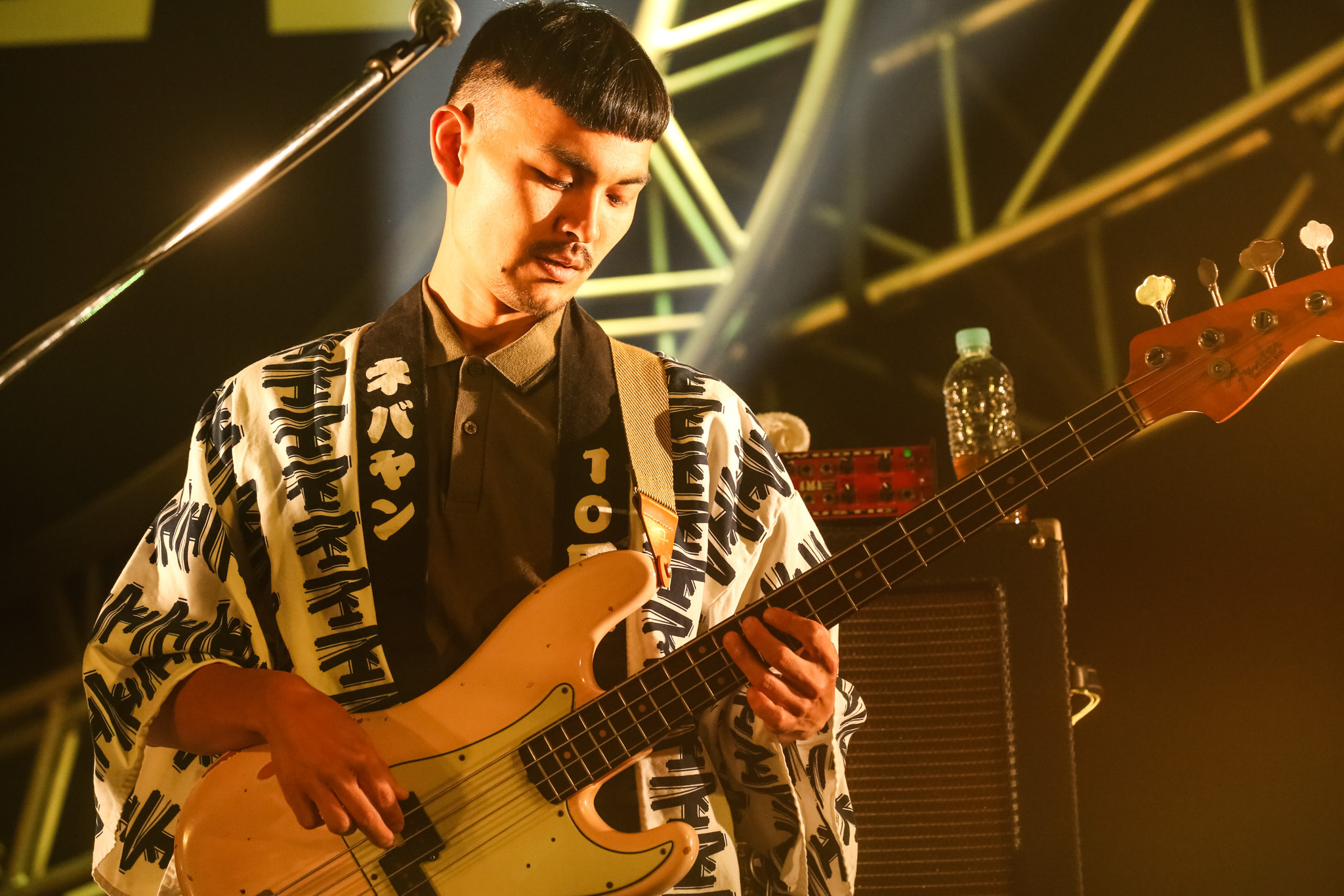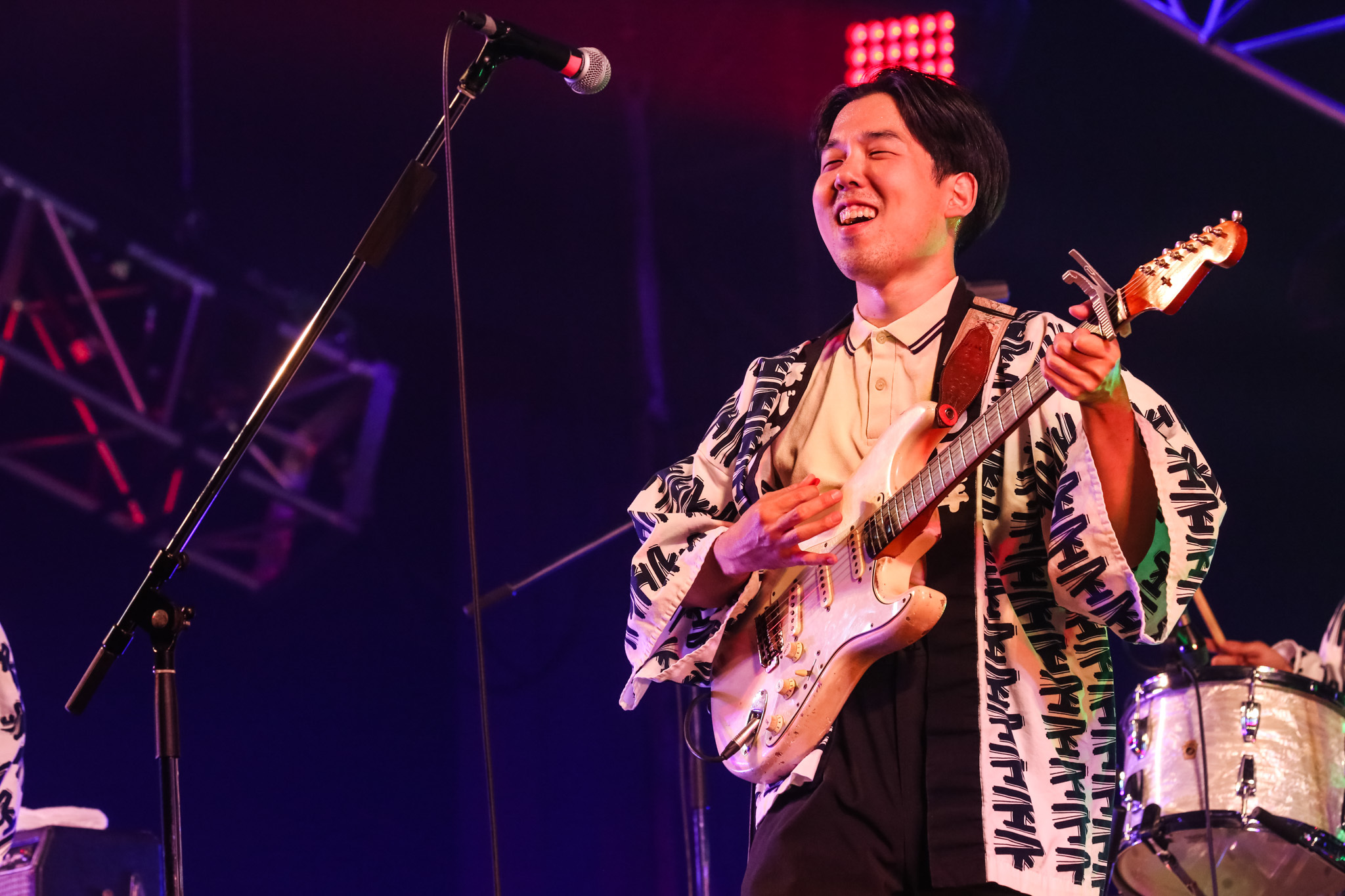 襟元には10周年&背中に「祝」と染め抜かれた法被を全員が纏い、結成10 周年イヤーを締めくくるステージへ挑んだnever young beach。暗闇のステージから安部勇磨(Vo.Gt)の「オッケ、レッツゴ!」という声が飛び、「なんかさ」が鳴り響く。「おはよ! みんな楽しんでってね!」。