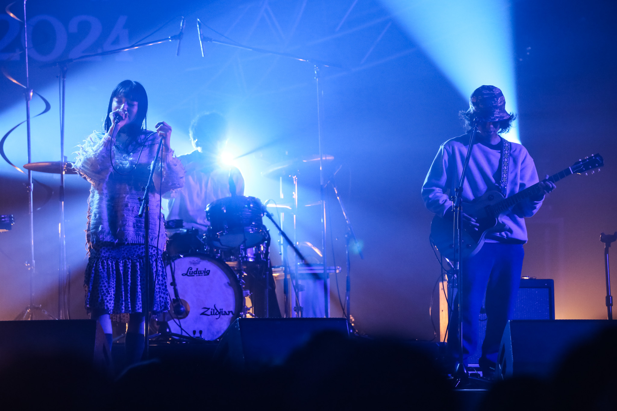 「透明」が2024年4月のFM802邦楽ヘビーローテーションに採用され、関西でもよく知られることとなったLaura day romance が2日目R-STAGEのトップを飾る。鈴木迅(Gt)、礒本雄太(Dr)とサポートメンバーの内山祥太(Ba)、小林広樹(Gt)、西山心(Key)、そしてボーカルの井上花月も現れると、ゆったりとした「リグレットベイビーズ」で始める柔らかな滑り出し。