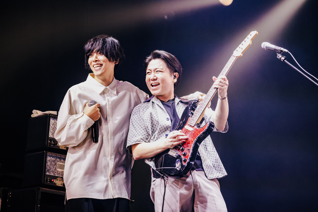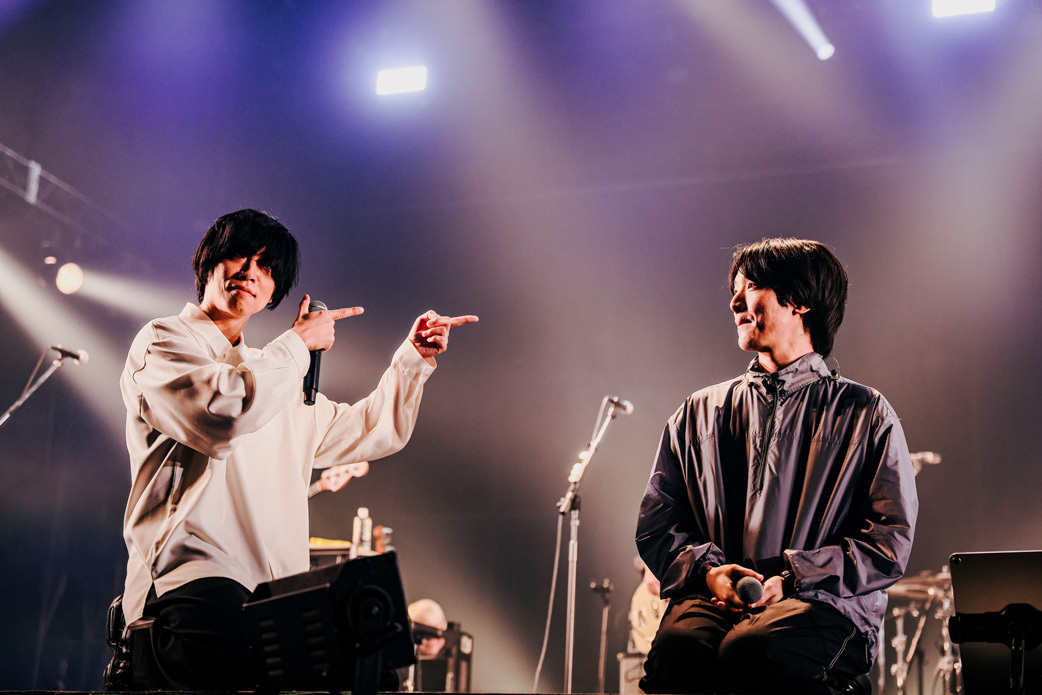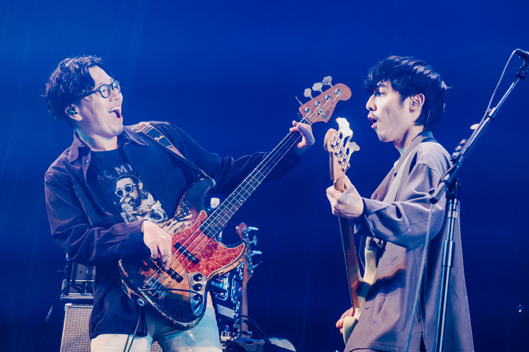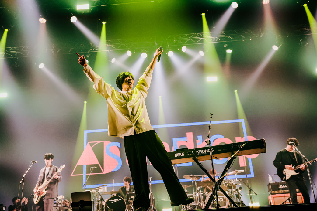 andropの「Massara feat.井上竜馬(SHE’S)」で見えたのはまさに両バンド全員戦とも言える厚みあるサウンドと、このコラボに興奮する8人の姿。終了後に内澤と井上がステージセンターで正座しペコリとしたこと、2人の後ろに掲げられた重なり絡み合う両バンドのロゴも「2組で1バンド」だと物語っていた。