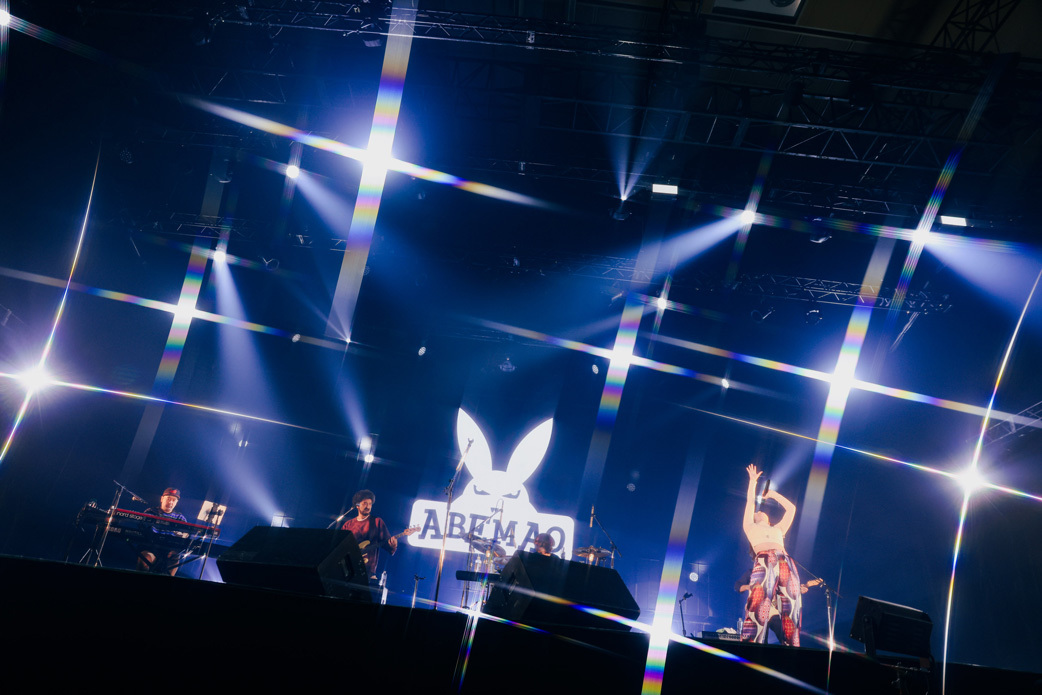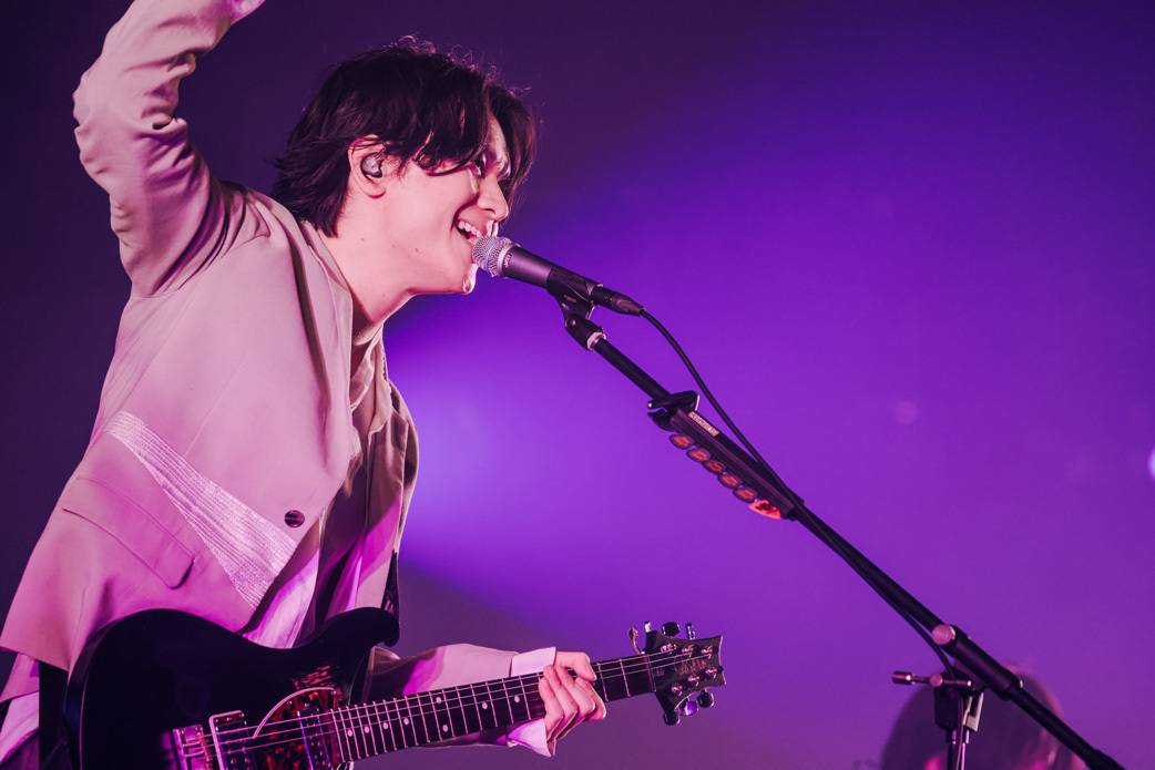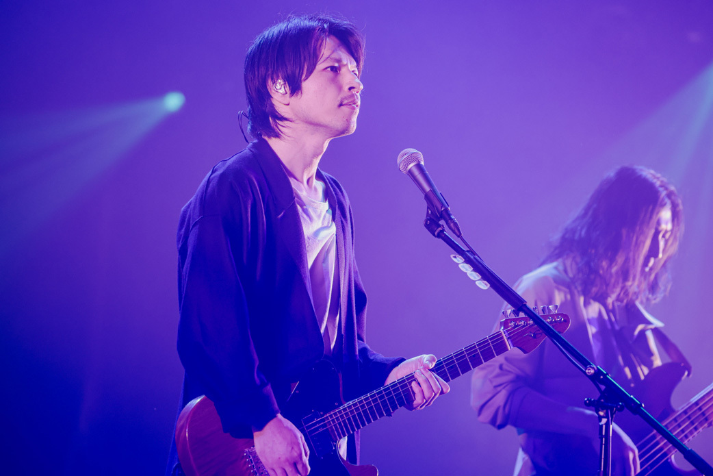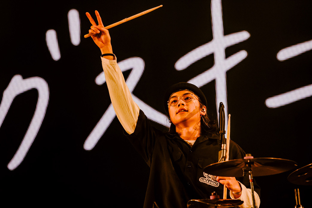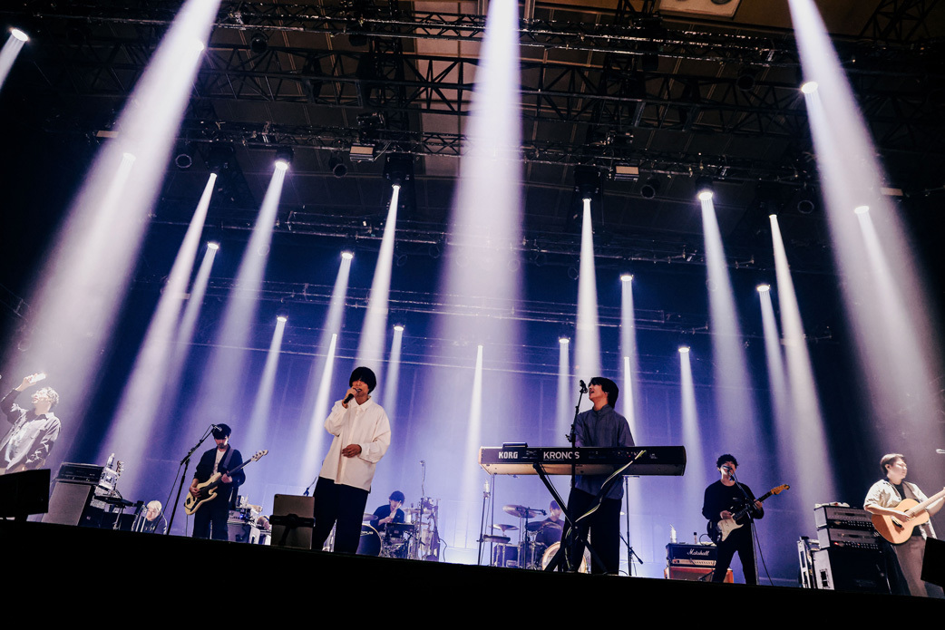 andropの「Massara feat.井上竜馬(SHE’S)」で見えたのはまさに両バンド全員戦とも言える厚みあるサウンドと、このコラボに興奮する8人の姿。終了後に内澤と井上がステージセンターで正座しペコリとしたこと、2人の後ろに掲げられた重なり絡み合う両バンドのロゴも「2組で1バンド」だと物語っていた。