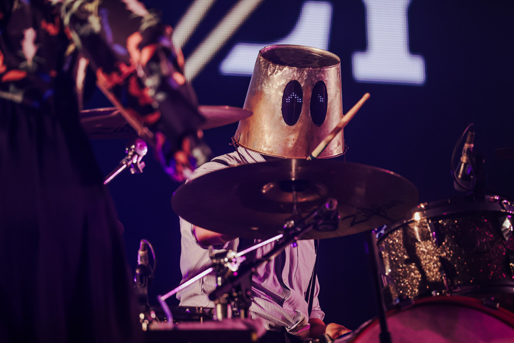 柿沼広也(Gt.Vo)と安井英人(Ba)は目を合わせて笑顔を見せ、Bucket Banquet Bis(Dr)も立ち上がって自身の頭をヒット。すると東出真緒(Vln.Key)の「最高やん!」も聞こえ、次は金井政人(Vo.Gt)と柿沼のダブルボーカルもパワフルな「荒狂曲“シンセカイ”」と、イントロでファンを浮足立たせる「Swan Song」。