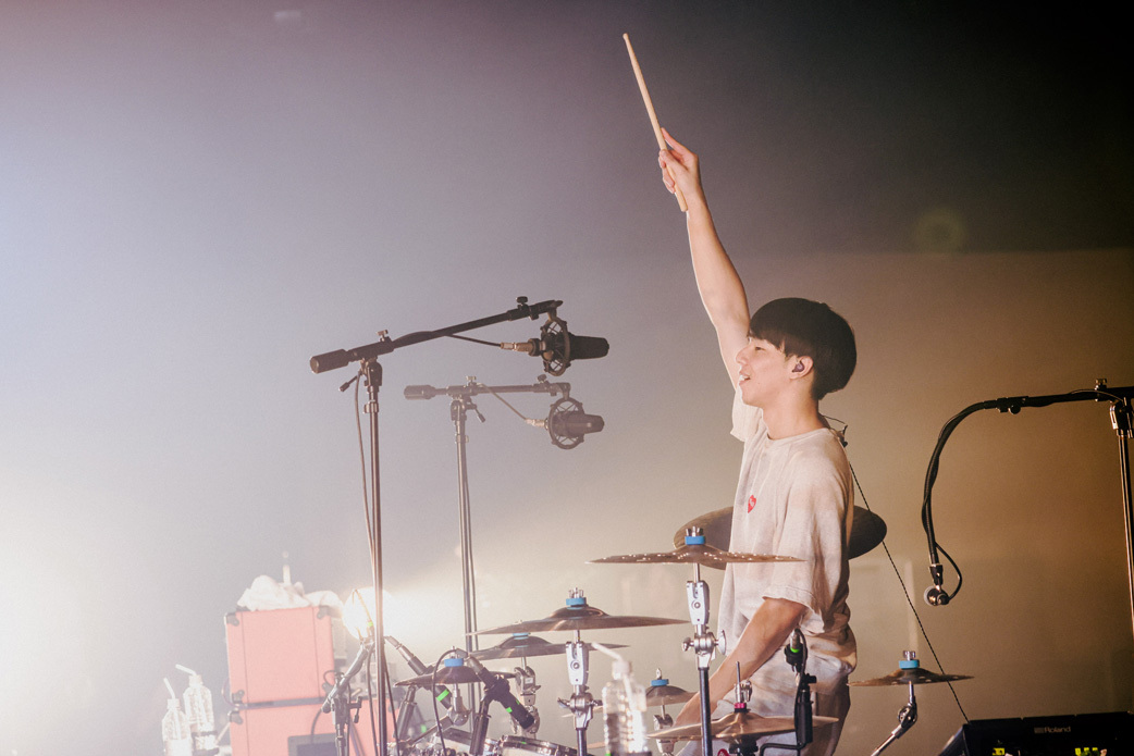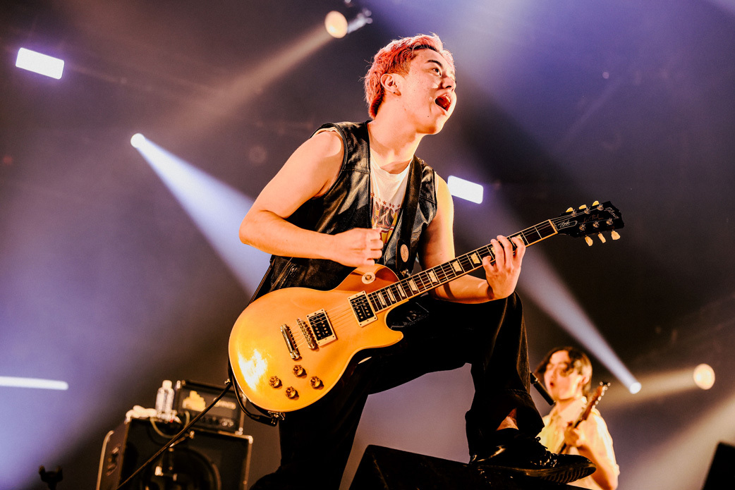続く「デイズ」ではなおや(Gt)が綴るポップなバンドサウンドから一転し、しょうと(Ba)、なおと(Dr)のリズムがうねりを上げるエネルギッシュなサウンドでフロアを圧倒。りょたちの軽やかな歌声とのギャップも気分を高めていく。