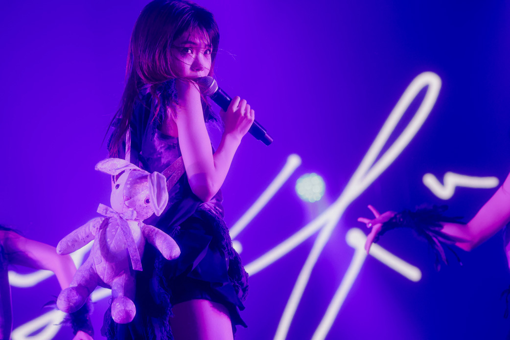 「偽りのシンパシー」では、抱えていたウサギの人形に指を絡める動作、観客への目配せの仕方、振り向き方、そしてヒップラインをなぞったり地面を這ったりする大胆なダンスなど、一つひとつの動きに物語性が感じられる。自身が演者であり、また優秀な演出家であることがこの1曲だけで分かる。