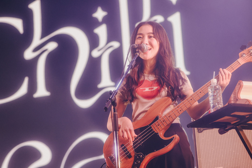曲が「See C Love」へと切り替わると、この曲が聴きたかった! とばかりにグッとたくさんの手が挙がる。ステージ上でステップを踏むように歩き回って歌うMoto(Vo)、はじける笑顔で演奏する姿がキュートなMaika、ギターと対話するように音を掻き鳴らすLily(Gt.Vo)。音楽を聴きながら三者三様の佇まいを眺めるのがチリビのライブにおける楽しみ方でもある。