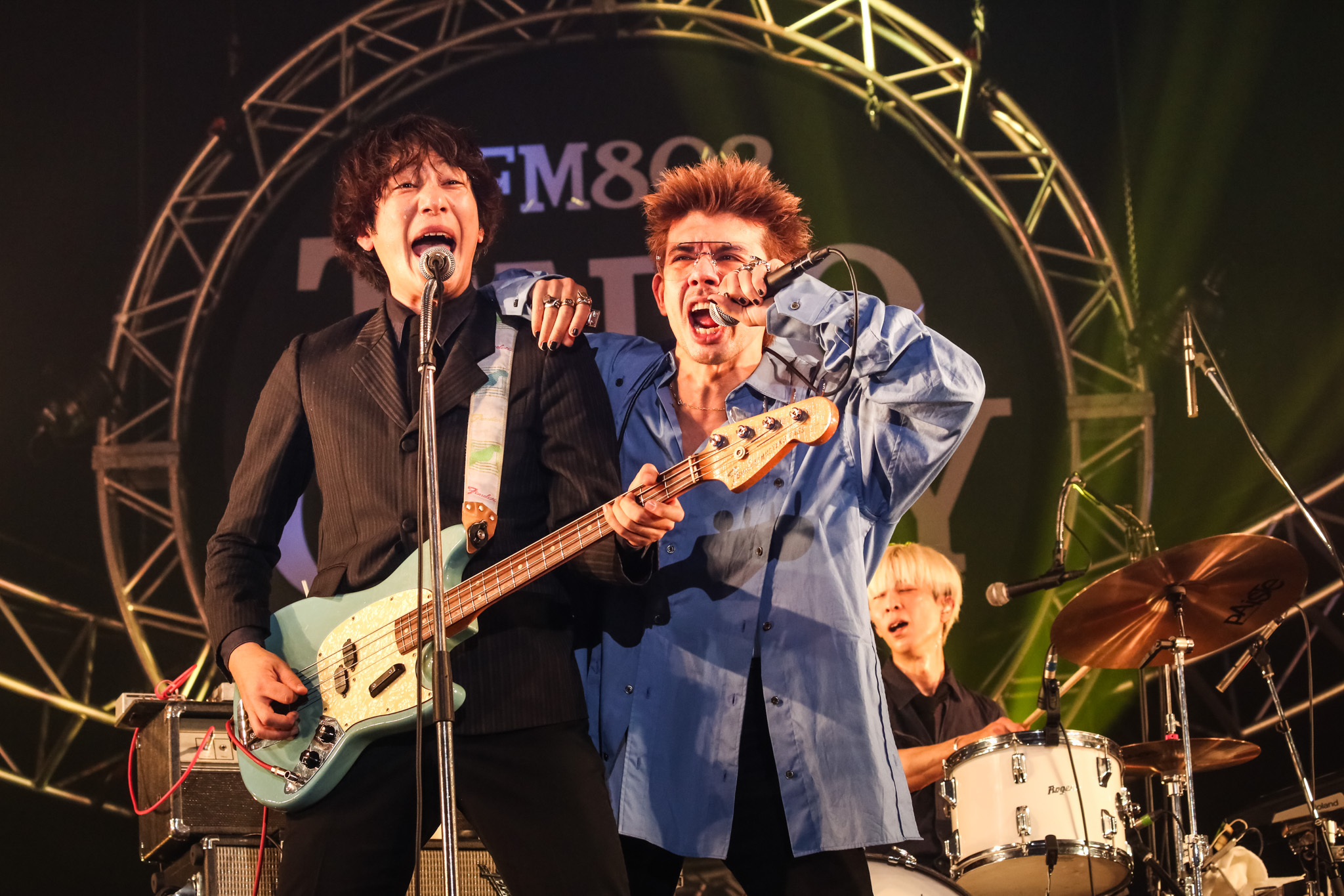 「俺らの愛するロックンロールブラザーです」とオカモトショウ(OKAMOTO’S/Vo)を招き入れて披露した「GIMME GIMME」を終えると、「HOT DOG」へ雪崩れ込む。「HOT DOG」が演奏されることは同時に、パンとソーセージが出会うまでの壮大なストーリーを描いた寸劇「HOT DOG劇場」の開演を意味する。こうして幕を上げた「HOT DOG劇場」では、ROY扮するパンダムの操縦士としてFM802DJの樋口大喜が登場。境内STAGEで繰り広げられたトークイベントの伏線を見事に回収したかと思えば、JIM演ずるジムの操縦士には同じくFM802DJの高樹リサが任命されているではないか。2機が激しいバトルを繰り広げた末、ようやく完成したホットドッグ。すると、颯爽と現れたオカモトショウが「It’s American style!」と言葉を残し、会場の笑いをかっさらっていった。