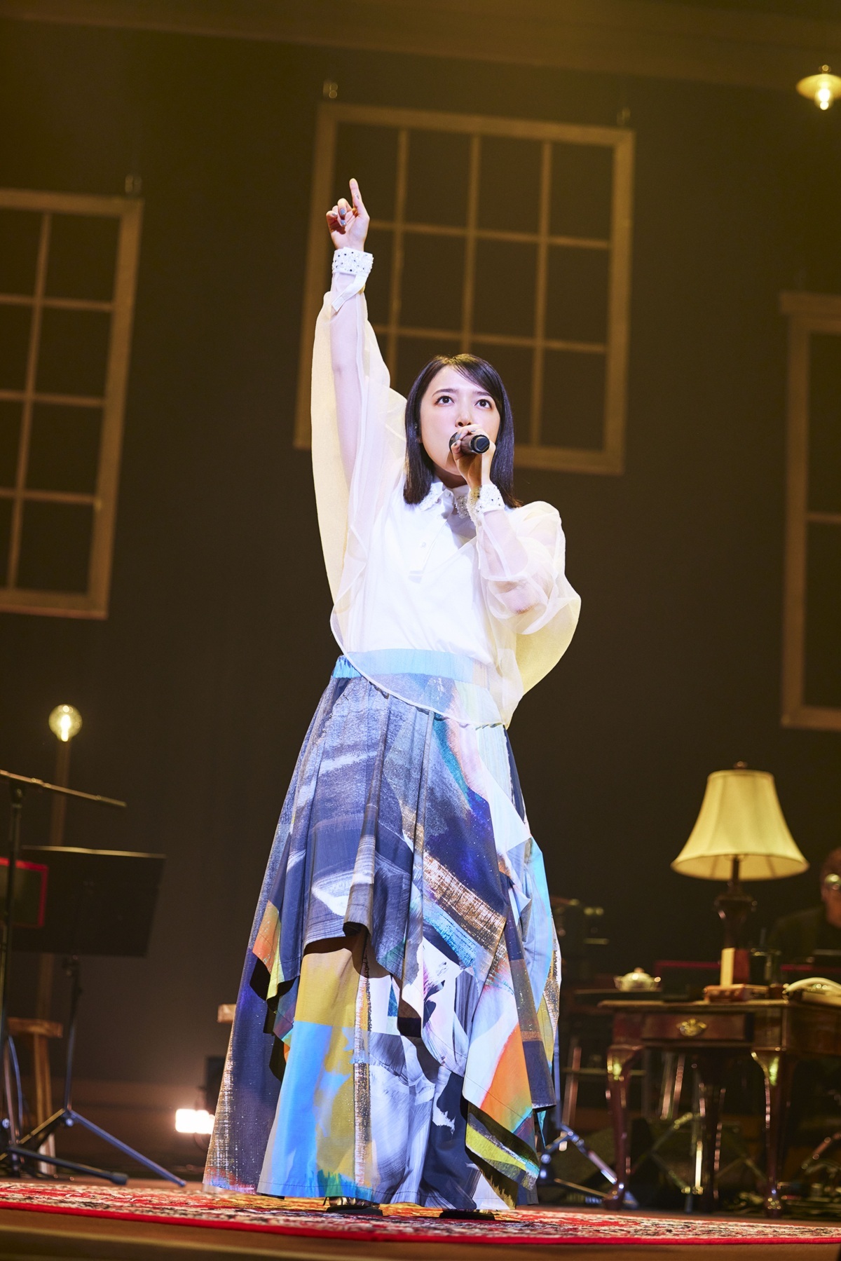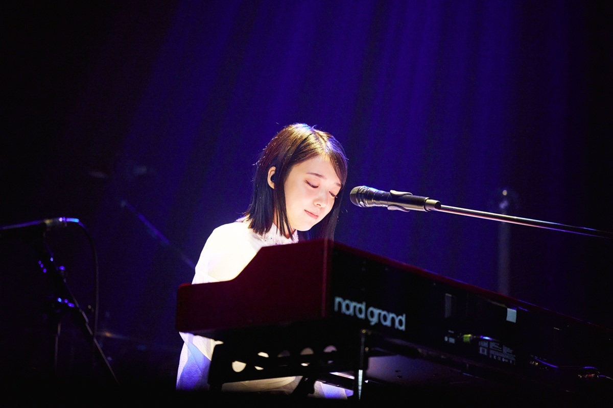 柔らかな電子音が場内に流れ始め、1曲目の「あくび」が始まると、ステージにかけられた紗幕に、上白石のシルエットが浮かび上がった。この曲には《淡いカーテンの その先》という一節があるのだが、まさにそれをイメージしたかのような演出だ。カーテンの向こう側から届けられる透明感のある歌声に耳を傾けていると、サビで幕が開き、椅子に座って歌っている彼女の姿が飛び込んできた。客席から拍手が起こる中、上白石は一言一言を丁寧に、思いを込めて届けていく。続けて「Loop」を伸びやかに歌い上げると、ポップなサウンドが弾ける「skip」では「みなさん、立っていいですよー!」と客席を促し、ハッピーな空気が場内に広がっていった。