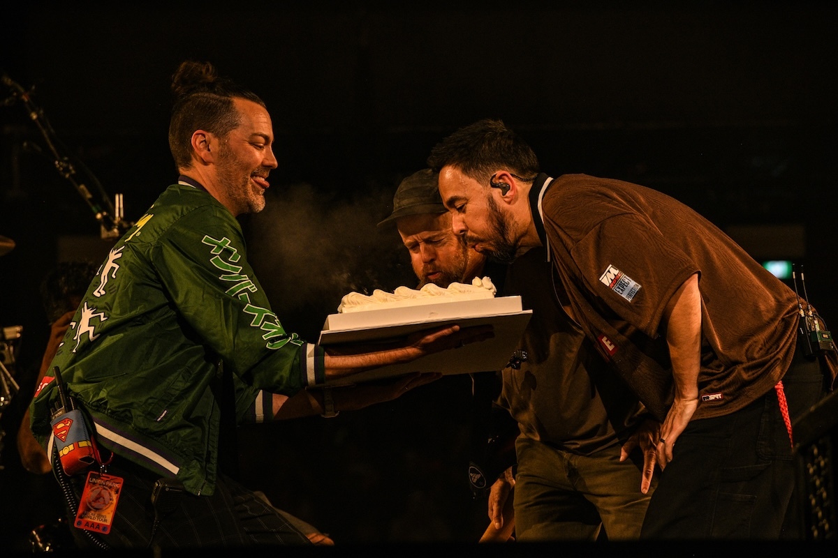 更にマイク・シノダのプロジェクト、Fort Minor(フォート・マイナー)の「When They Come for Me」と「Remember the Name」の2楽曲を特別アレンジしたマッシュアップ形式で披露した際の会場の興奮は大きな声援となって会場を包み込んだ。そして会場が突然明るくなり、「ハッピーバースデートゥーユー」と歌うエミリーと共にケーキが登場した。そう、この日の公演はメンバーのマイク・シノダの誕生日なのであった。さらに2月8日(日)はフェニックス(デイヴ)の誕生日でもあり、会場の観客たちと共に二人の誕生日をお祝いした。