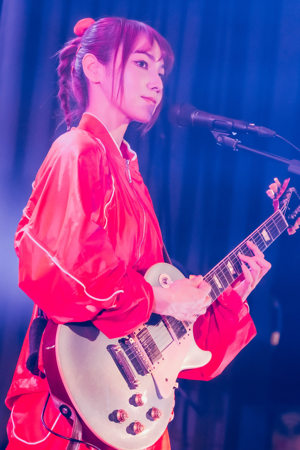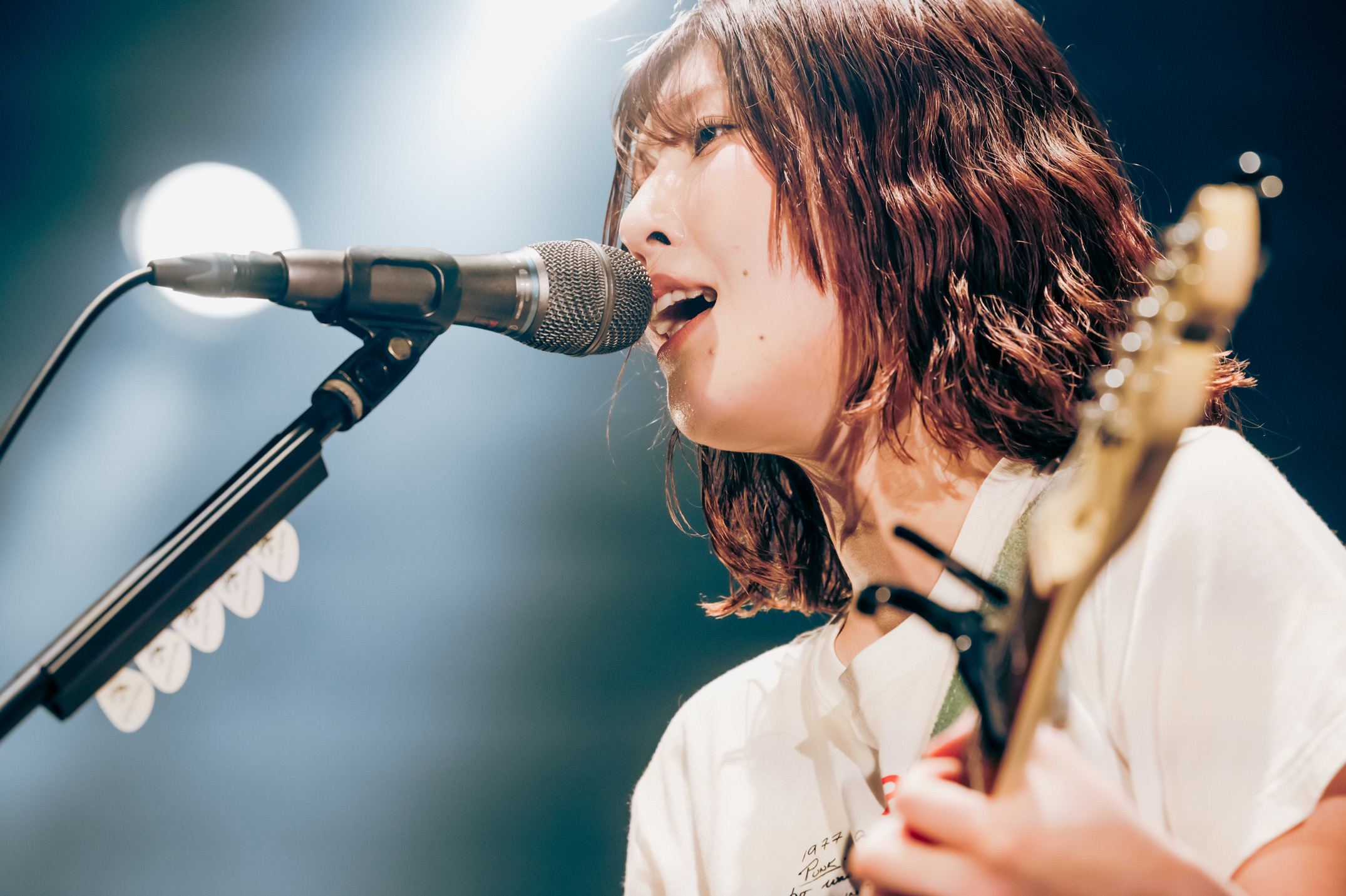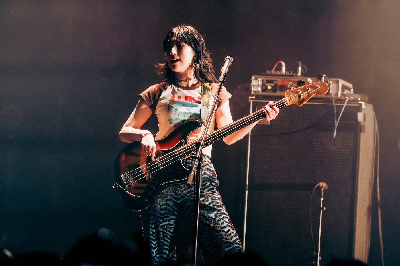 「GORILLA HALL OSAKAには初めて出るんですけど、懐かしい曲を持ってきました」(紬衣、以下同)と放った「エンジェルスモーク」では、楓華のうねるベースと、ドラムのみならずコーラスでも貢献する彩楓(さやか)(Dr.Cho)のタイトなコンビネーションに魅了される。メランコリックに突っ走る「急行券とリズム」しかり、緩急自在にさまざまな側面を見せていくセットリストでみずみずしい魅力を存分にアピール!