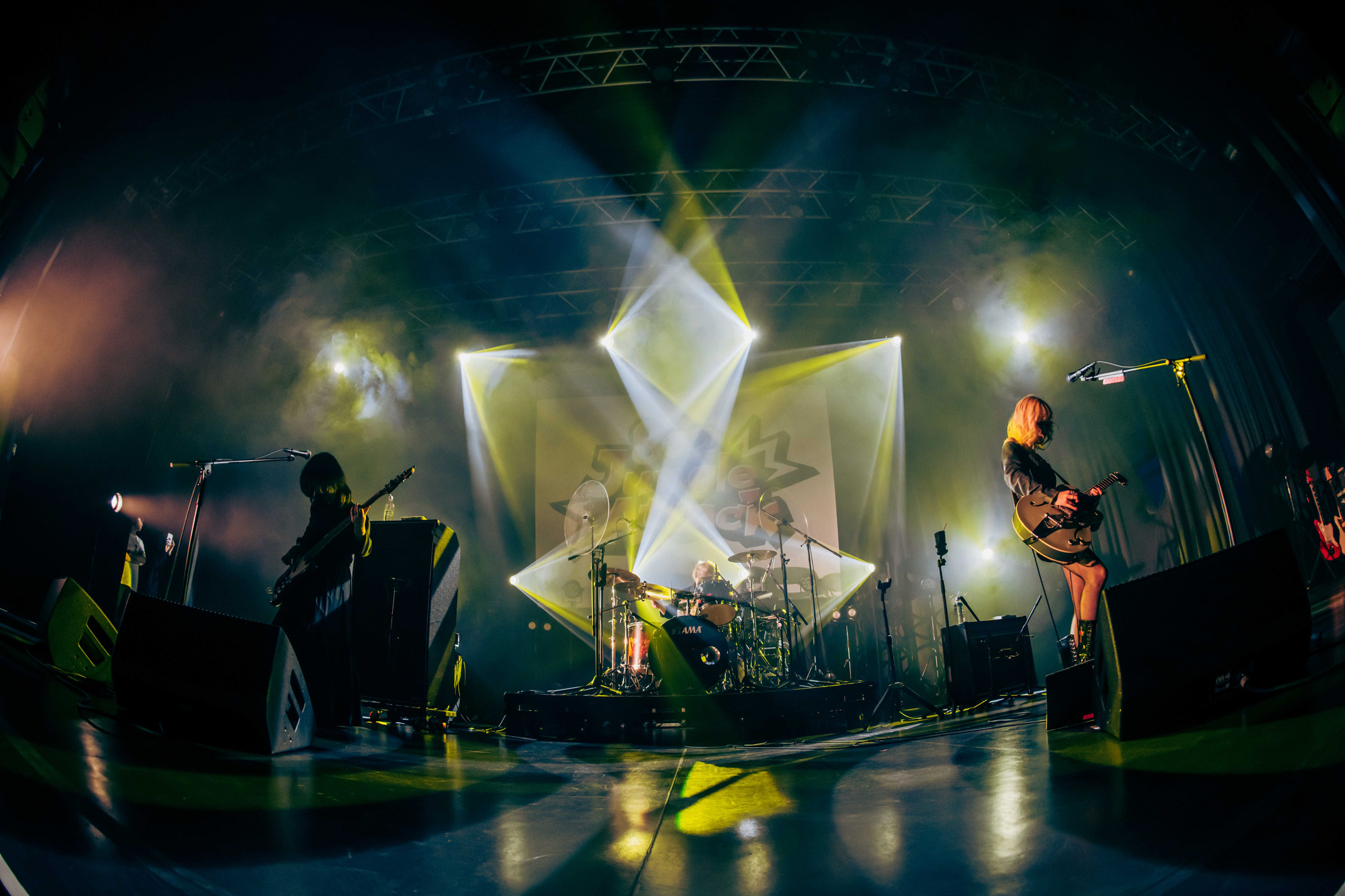Pixiesの「Where is My Mind?」のSEを切り裂くフィードバックノイズが鳴り響く中、みのり(Ba.Cho)のひずんだベースラインが導いた「ストックホルムの箱」から、堂々たる轟音を響かせたのは大阪発のスリーピースバンド、ブランデー戦記だ。続く「Coming-of-age Story」でも、SCANDALのさすがのステージ後でありながらまるで物おじすることなく、令和のオルタナサウンドで見る者を圧倒!