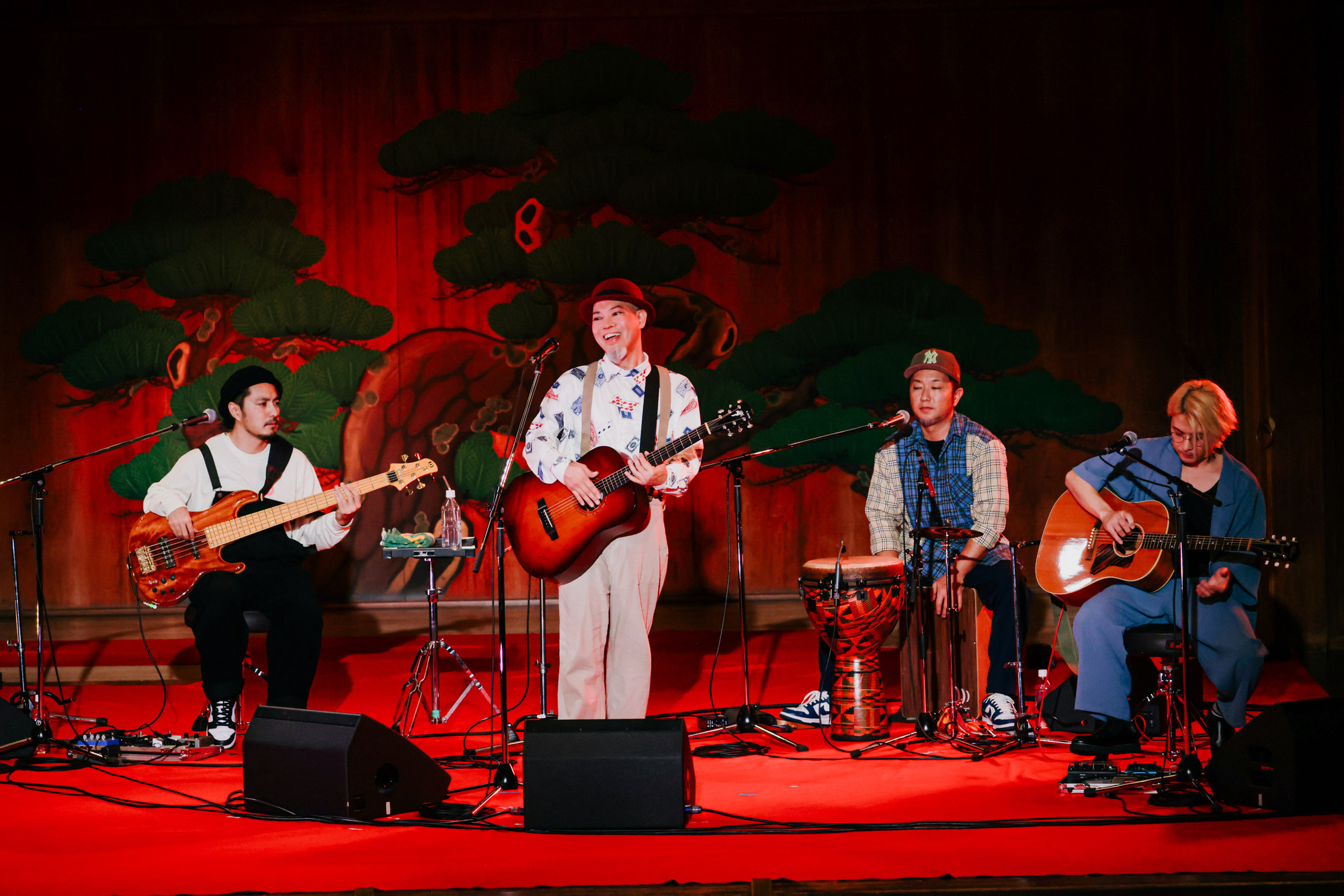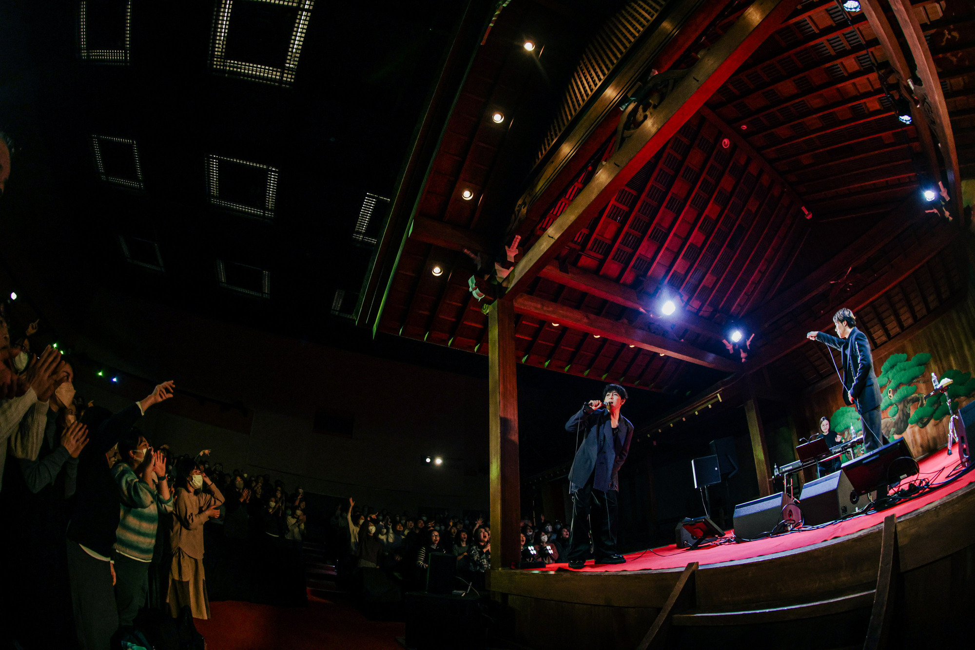 沖縄出身のかりゆし58は1曲目の「ホームゲーム」など、南国ムードをどころどころにちりばめながら。「まっとーばー」で描く青春や「アンマー」の家族のストーリーは、ギターのトレモロやユニゾンのコーラスもクリアに響く能楽堂でのアコースティックセットにより、胸の痛みをともなうほどみずみずしく聴覚を刺激。また「オワリはじまり」のどこかノスタルジックな音像は、前川真悟(Vo&B)が“お母さんのお腹の中ってこんな感じかな”と語った会場に夕焼けを広げてみせた。ちなみに“愛おしさと敬意が混じる”と、前川は子方・福王登一郎のファンになった様子だった。