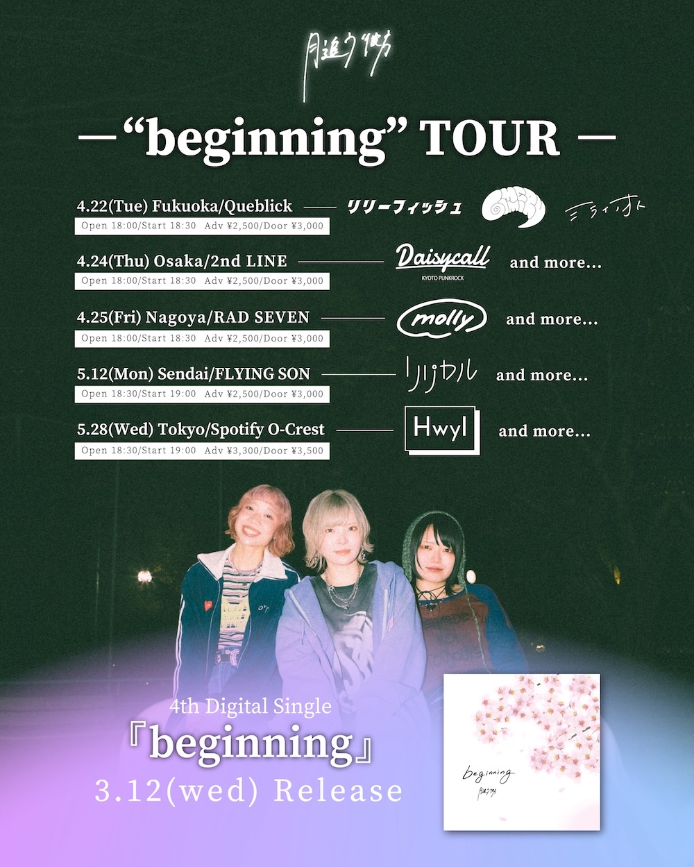 そして、福岡、⼤阪、名古屋、仙台、東京の5箇所を回る、新曲のタイトルを冠した『“beginning” TOUR』の詳細も発表され、イープラスにてチケット先⾏もスタート。対バン第⼀弾にはHwylやDaisycall等、若⼿ロックシーンで活躍中のバンドが多数出演する。