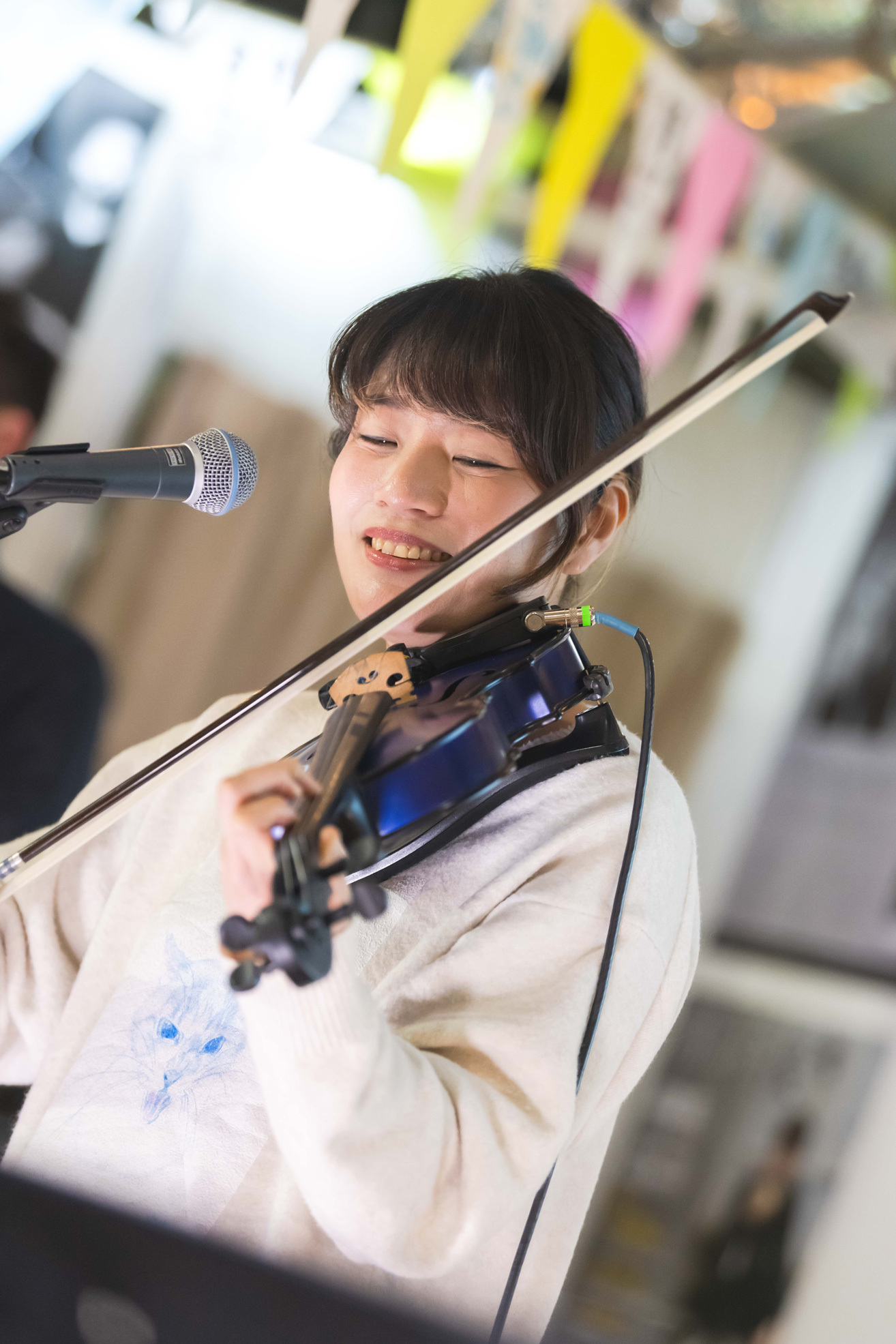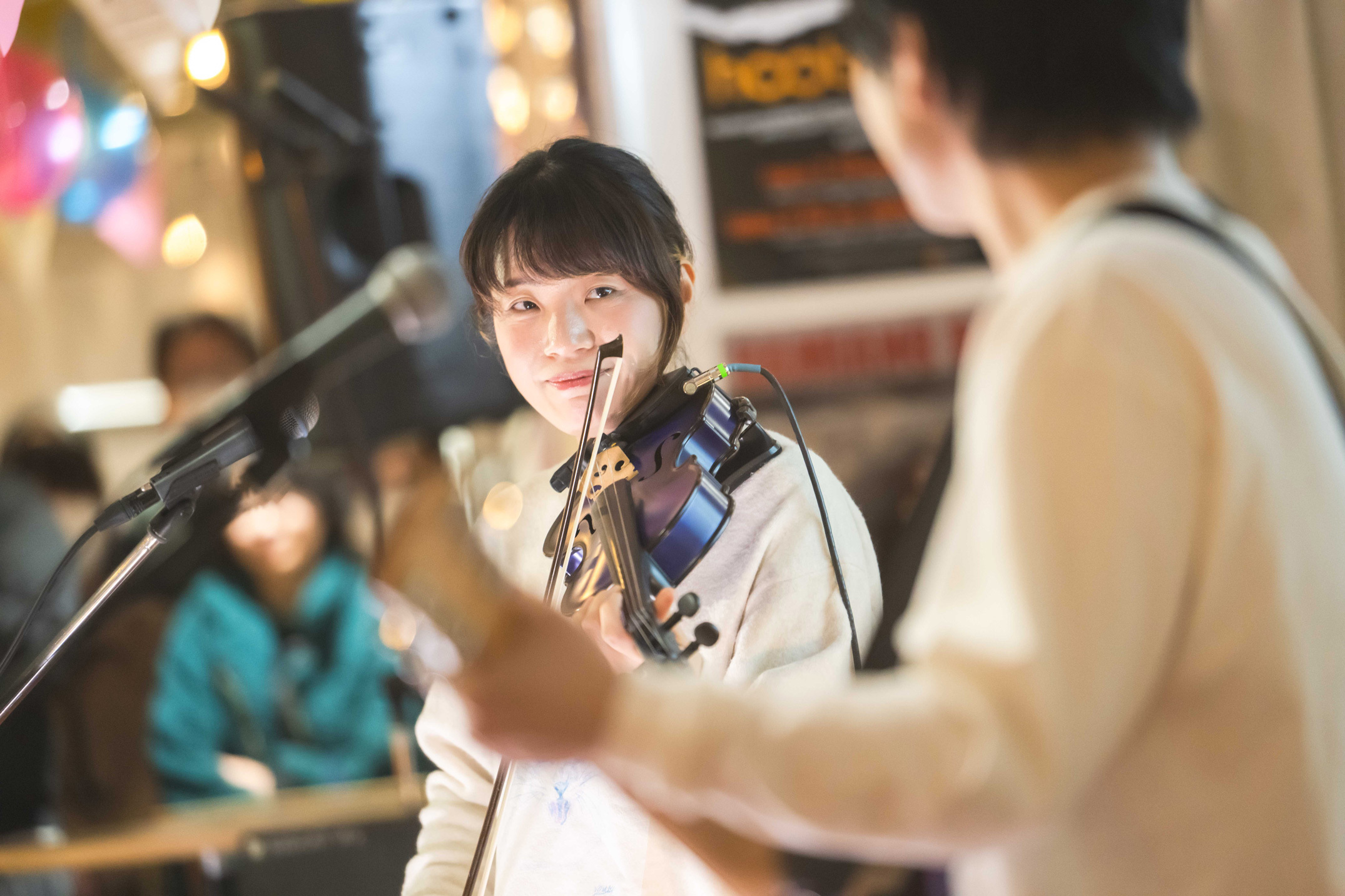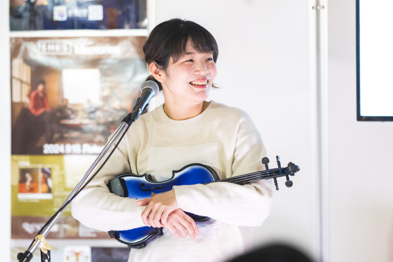 柿沼の弾き語りが徐々に熱を上げ、強い思いを表現する「SPECIALS」で幕を開けると、続くのは懐かしい2曲。「I Don’t Need a Time Machine」では2人のハーモニーもやわらかく、東出は弓でファンを次々指すようにしてスマイルを見せ、「Lovescape」では東出が手渡したタンバリンで大抜も参加。弾むリズムにのせられクラップも大きくなる。そして一体感も増した会場に広げるのは壮大な「美術 | ESORA」で、バイオリンの旋律も耳に残り、東出も曲後に思わず「気持ちがいいですね」と発すると、「次は真緒ちゃんのリクエストでね」(柿沼)、「聴きたかったんですよ、カッキー(柿沼)の声で」(東出)と「the cookie crumbles」を。細かな手拍子と一つになってボーカルもバイオリンも駆け抜け、サビではパワーを全開にして客席に歓声を上げさせる。