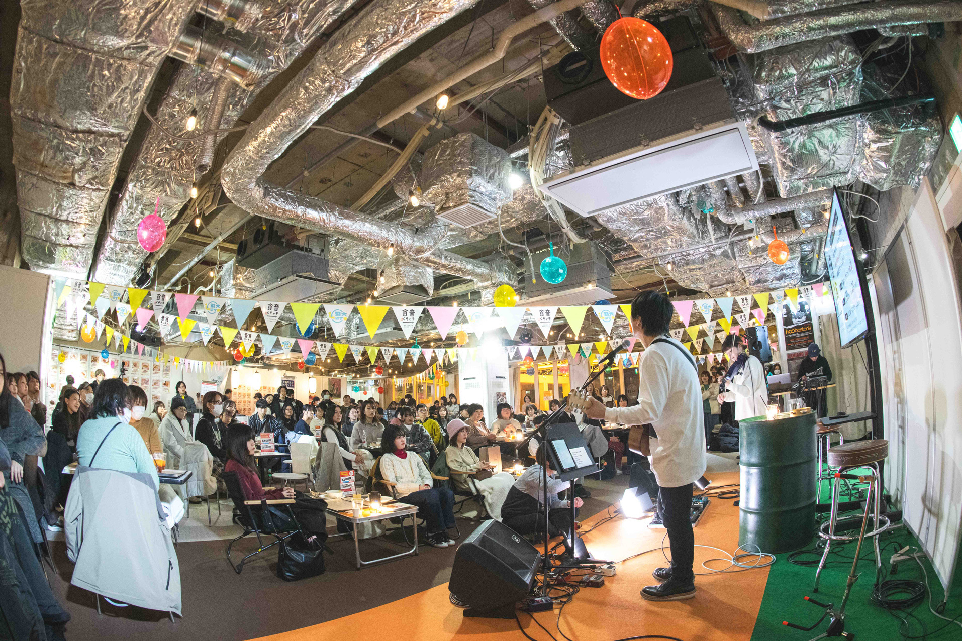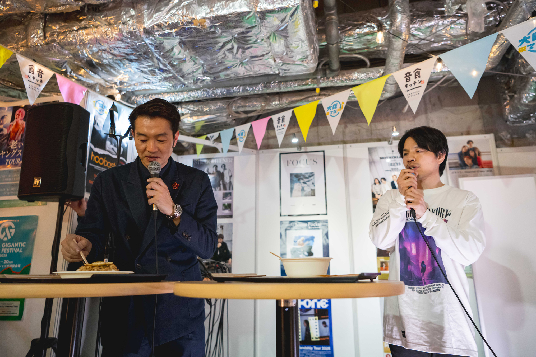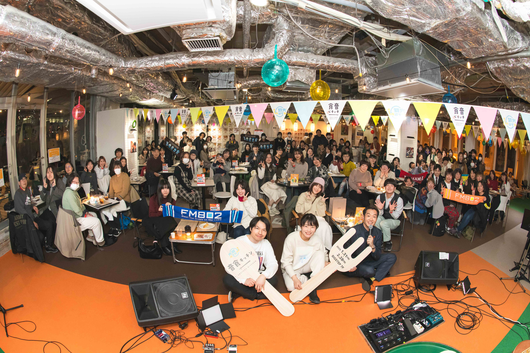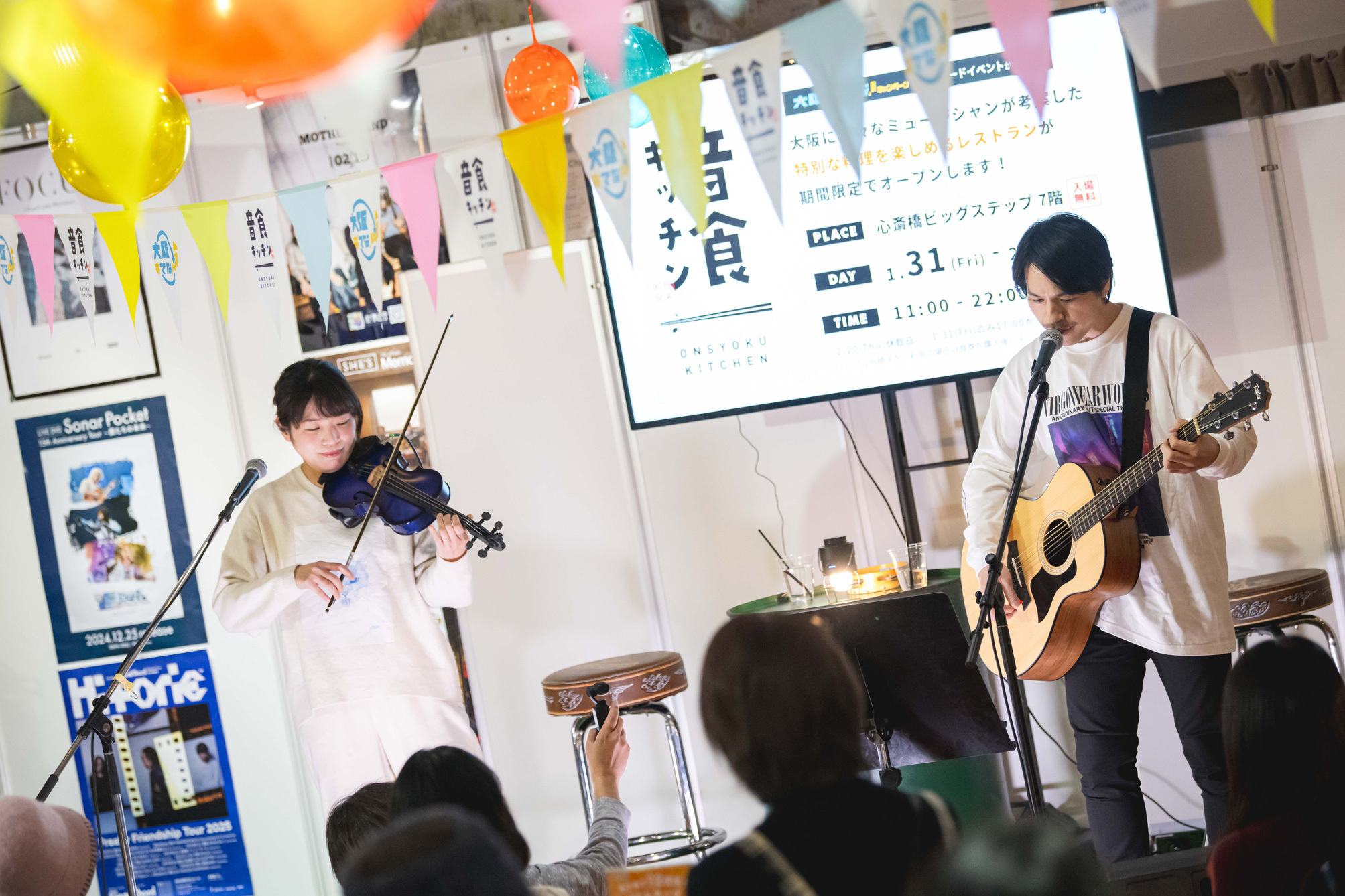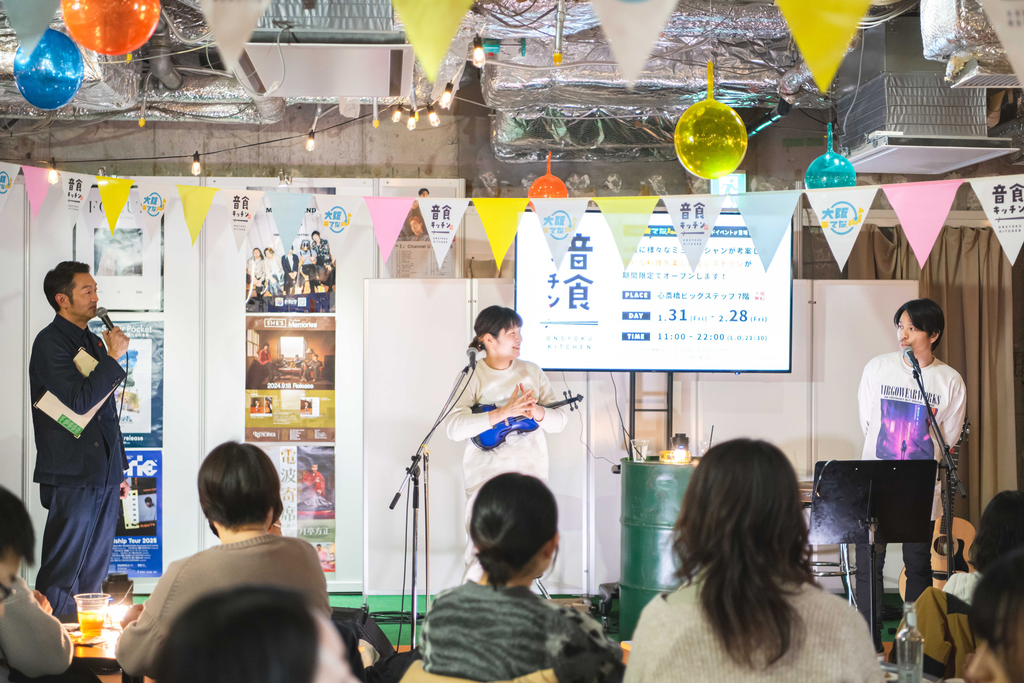 現在、大阪・ミナミエリアにある心斎橋ビッグステップにて、ミュージシャン考案の料理を提供するコラボレストラン『音食キッチン』が期間限定で営業中。連日、ここでしか味わえない品々を求める人々でにぎわいを見せている。2月28日(金)まで続くこの『音食キッチン』は、大阪の魅力を発信する「大阪来てな!キャンペーン」の一環として2023年にスタートしたものでこれが3回目。今回は前回よりもメニューが大幅に増え、ラーメンやカレー、丼や一品料理から、デザート、ドリンクまで、その数は51種類にもおよび、開発にはアーティスト44組と、在阪ラジオ局・FM802のDJ 4人が携わった。また、テラス席もある広い店内では、メニューを手掛けた本人を迎えたイベントが随時実施され、2月14日のバレンタインデーの夜にはBIGMAMAの柿沼広也(Gt.Vo)と東出真緒(Vio)が来店。おいしそうな香りが漂うなか、繰り広げられた約50分間のトーク&ライブを紹介する。