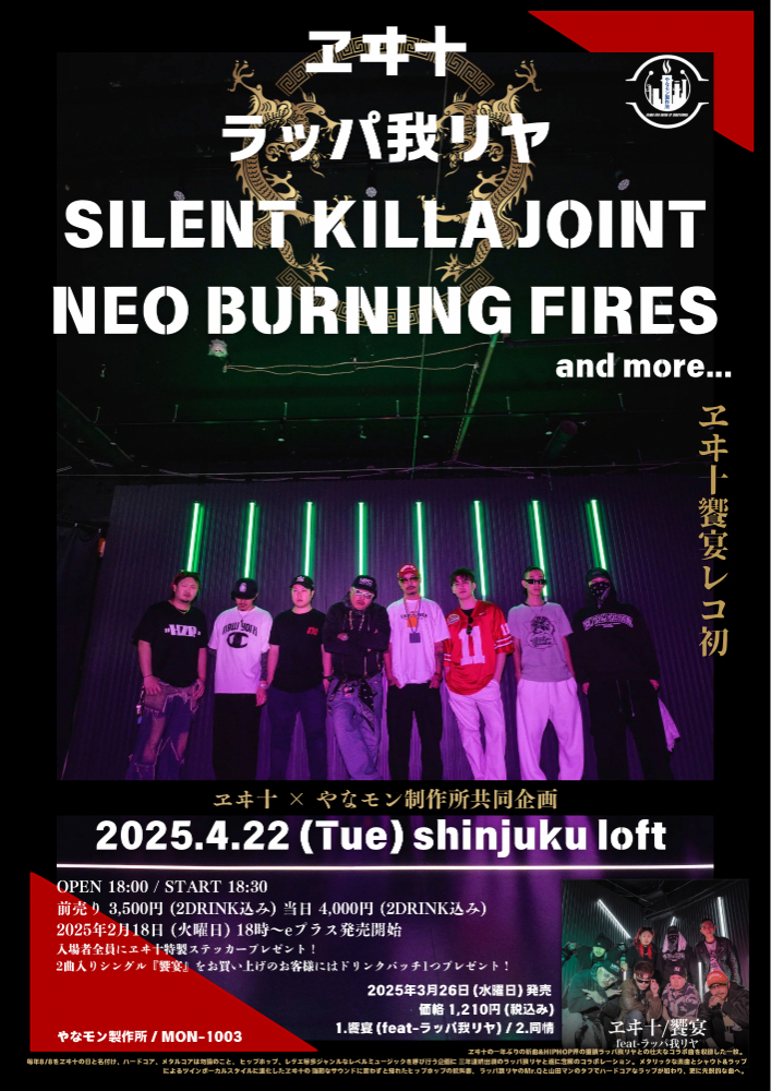 また、「饗宴」リリースを記念したレコ発ライブ『饗宴』が4月22日(火)に東京・新宿LOFTで開催されることも決定。同ライブには、ヱヰ十、ラッパ我リヤに加え、SILENT KILLA JOINTとNEO BURNING FIRESがゲストバンドとして出演することが決まっている。