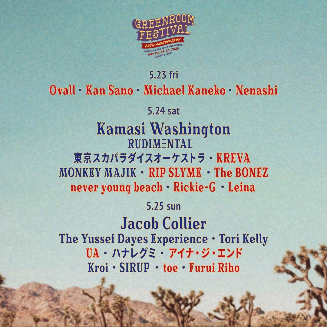 2025年5月23日(金)・24日(土)・25日(日)に横浜赤レンガ倉庫にて開催される『GREENROOM FESTIVAL 20th Anniversary』の第3弾出演アーティストが発表された。