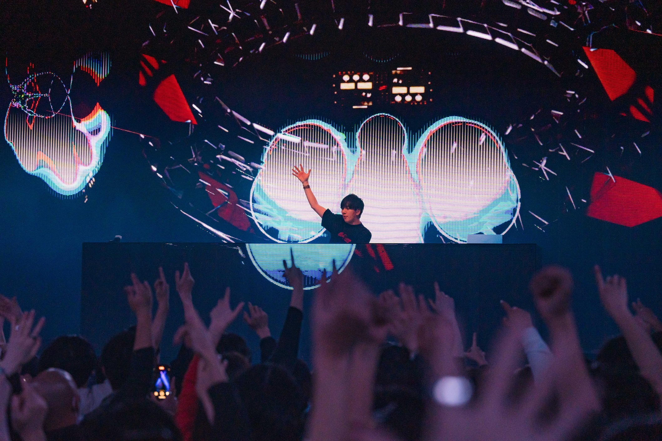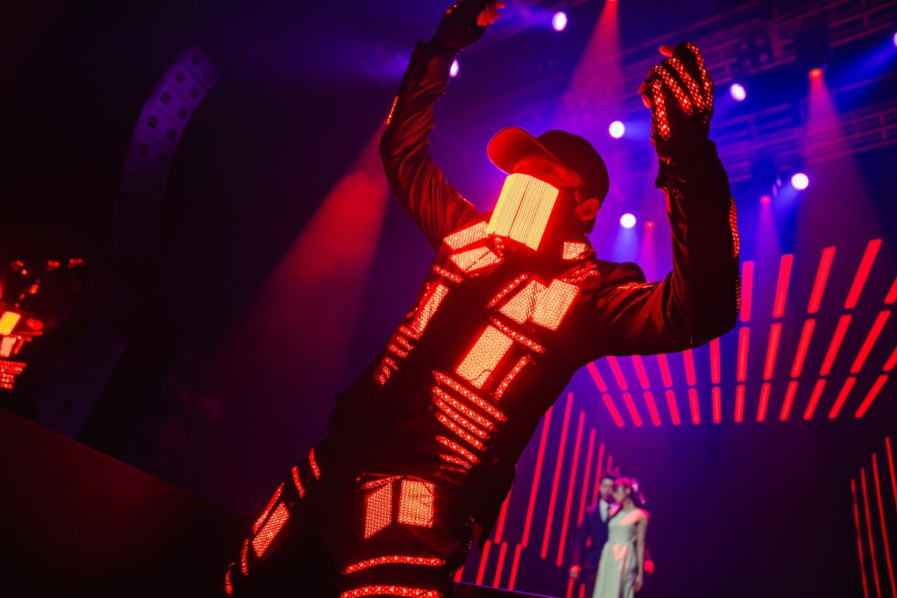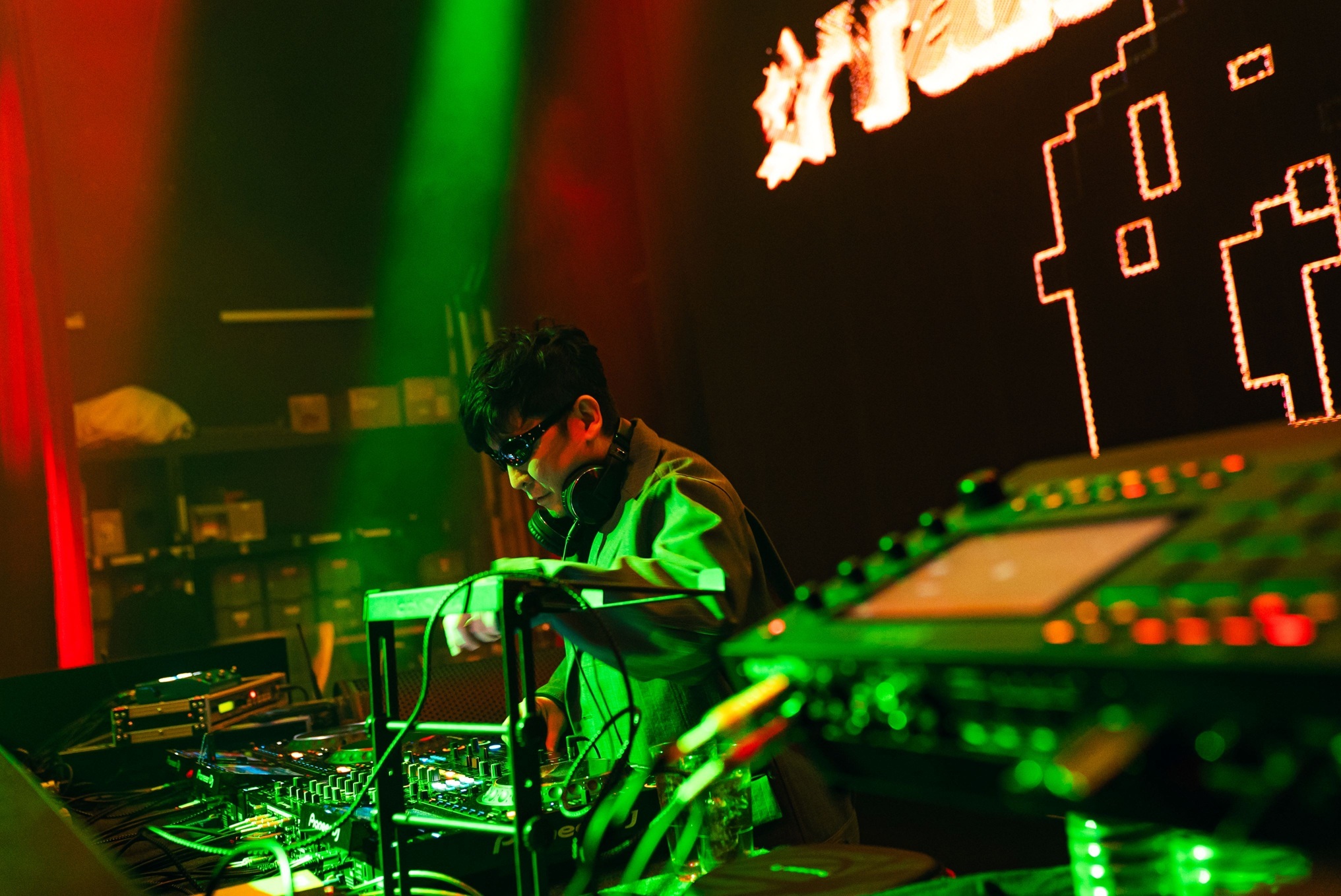 時刻は深夜1時15分を回った。ここからいよいよ今夜のメインイベントと言える特別ステージ「ZIPANGUサクラガミ」のショータイムだ。クリエイティヴ集団MPLUSPLUSが手掛ける光、音、映像と共にパフォーマンスを繰り広げるのは、島根県の伝統芸能「石見神楽」の担い手であるチーム「万雷」。まずは元NGT48の本間日陽による可憐なソロ、そして万雷に所属する三原新とのデュオによるコンテンポラリーダンス。続いてMPLUSPLUSの技術とダンスを掛け合わせた唯一無二のテクノロジーダンスクルー・D-Classicsが登場し、ダンスと伝統的な神楽囃子とEDMとの斬新な融合が繰り広げられる。