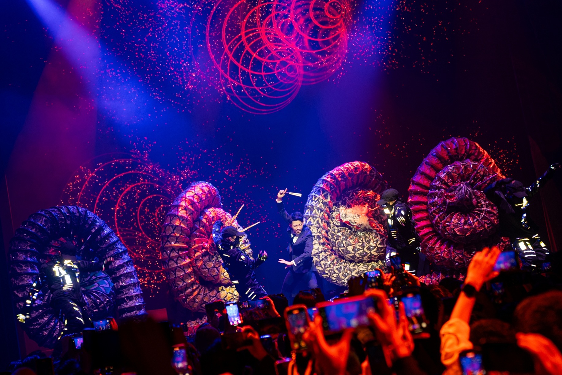 クライマックスは、全長17メートルのLED大蛇4体とD-Classicsとの格闘、続いて大蛇と三原新との決闘だ。神話的なテーマと現代的テクノロジーを掛け合わせたスリリングな展開に、固唾を呑んで見入るオーディエンス。そして物語のクライマックスに、ついに登場した小林幸子。満場の拍手喝采に迎えられ、光り輝く和装と金の髪飾りで新曲「サクラガミ」を歌う姿を、スポットライトがオーラのように包み込む。本間と三原が華麗な舞とダンスで華を添える。深夜2時の新宿のクラブに小林幸子が降臨する、夢か現かわからなくなるような貴重な時間。