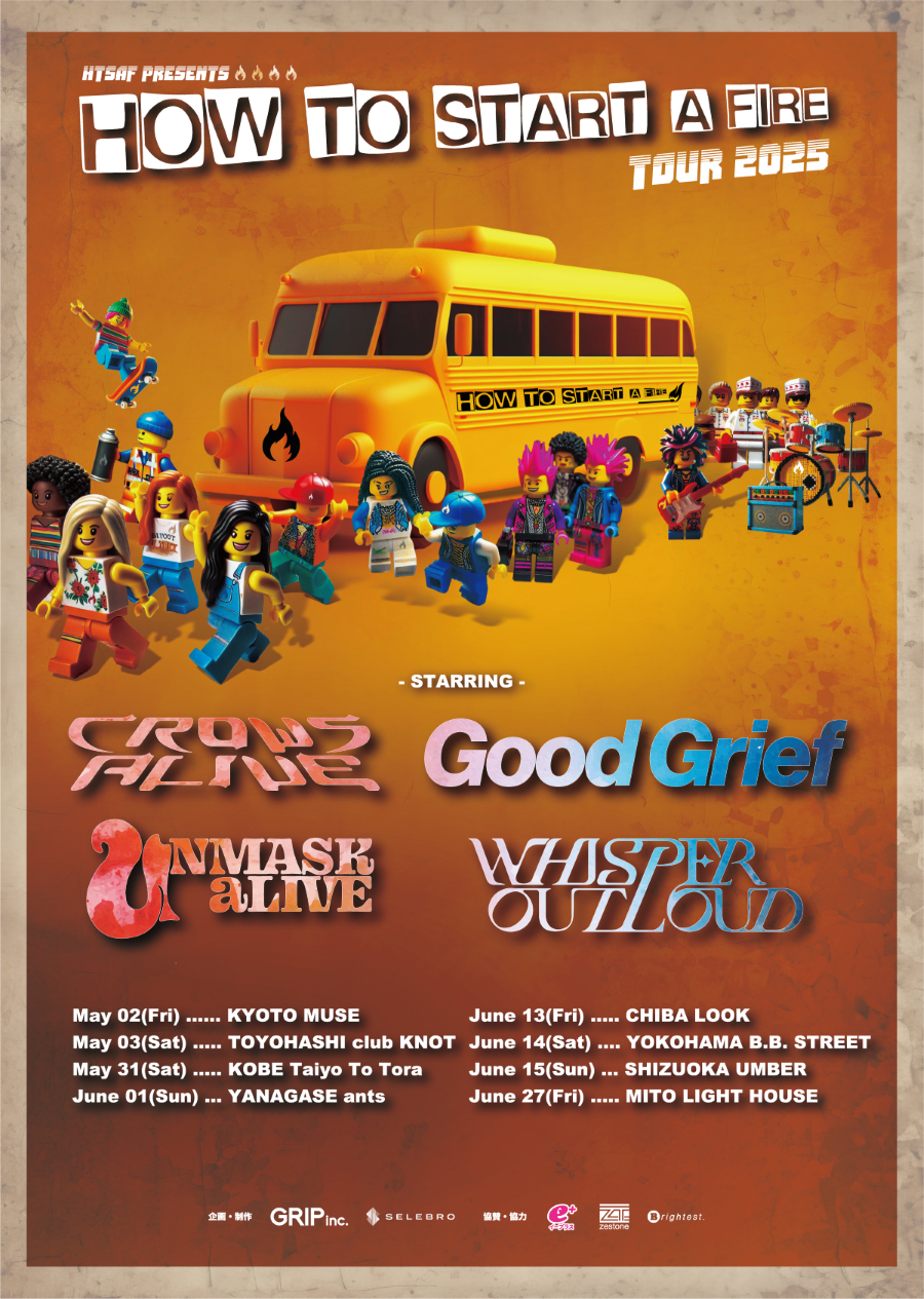 5月2日(金)京都MUSEを皮切りにCrowsAlive、Good Grief、UNMASK aLIVE、WHISPER OUT LOUDの4組によるスプリットツアー『HOW TO START A FIRE TOUR 2025』が全国8か所で開催される。