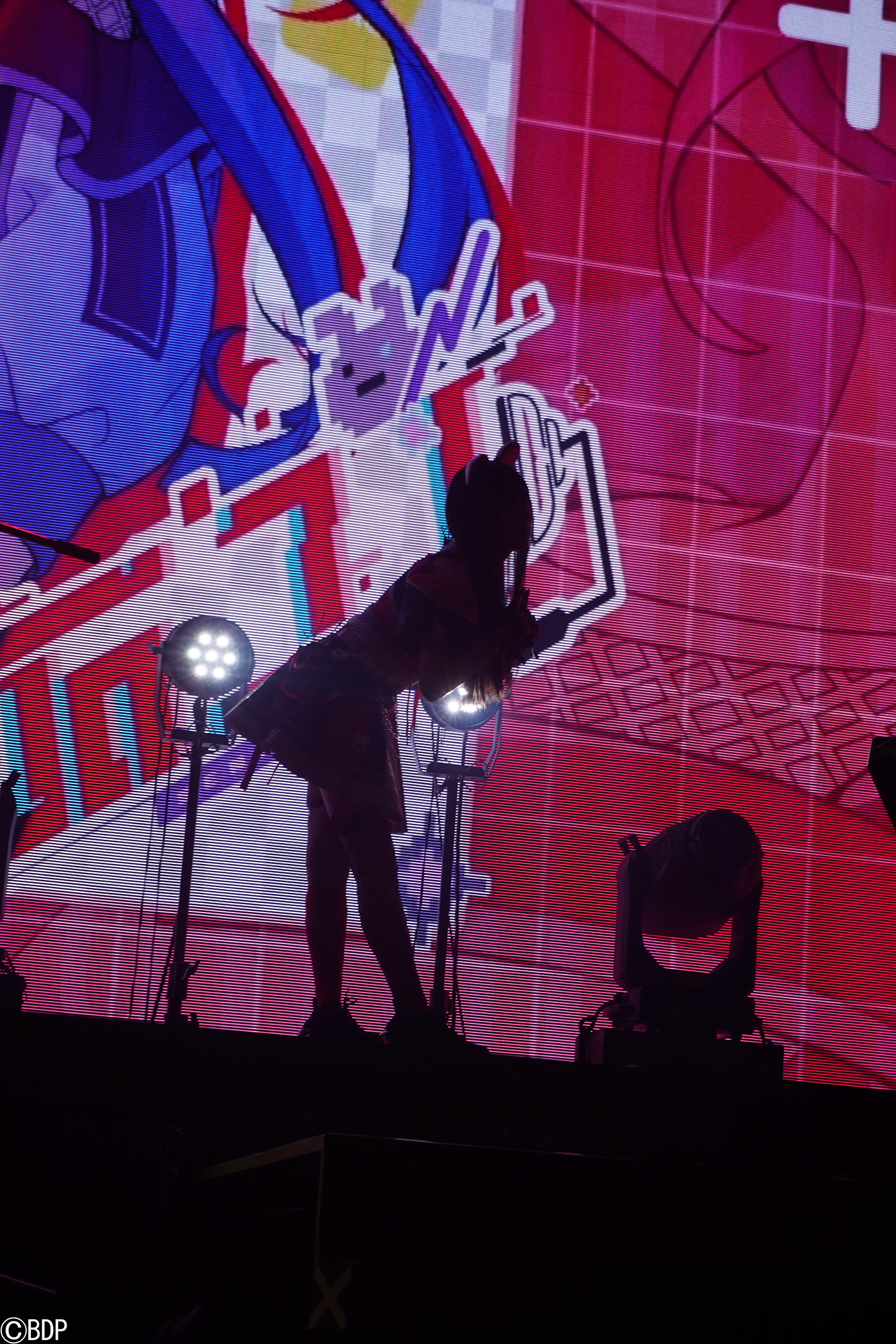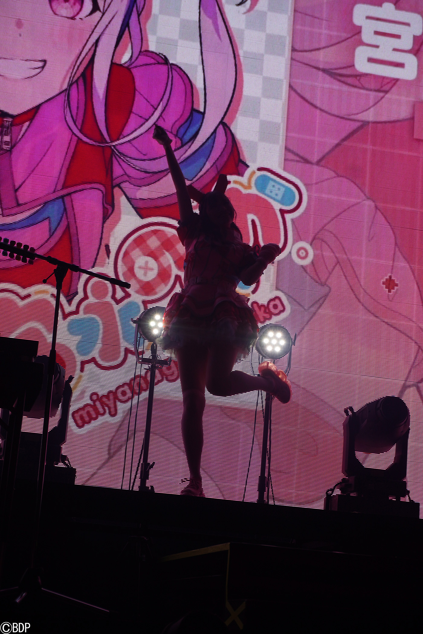 そんなゲキを受けてコールが盛り上がる中、VTuber・P丸様。の「メンタルチェンソー」にボカロ曲「エイリアンエイリアン」と、公式チャンネルで披露した【歌ってみた】ナンバーを迫力のライブバージョンで連続披露し、オープニングパートから場内の熱を一気に上げてみせた。
