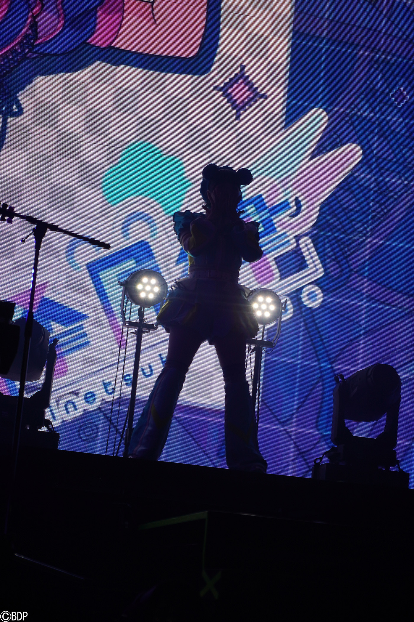 ライブもいよいよ後半戦に突入し、ファンにはおなじみの定番ナンバーを中心に明るくノリノリのパフォーマンスが繰り広げられていく。ハロー、ハッピーワールド!の代表曲「えがおのオーケストラっ!」のカバーと、ゲームのドット絵のようなかぶり物でパフォーマンスを繰り広げるPVをバックに繰り広げられた「新人類は仮想世界の夢を見るか?」とハイテンションに2曲で再び場内の空気を熱く盛り上げていく。