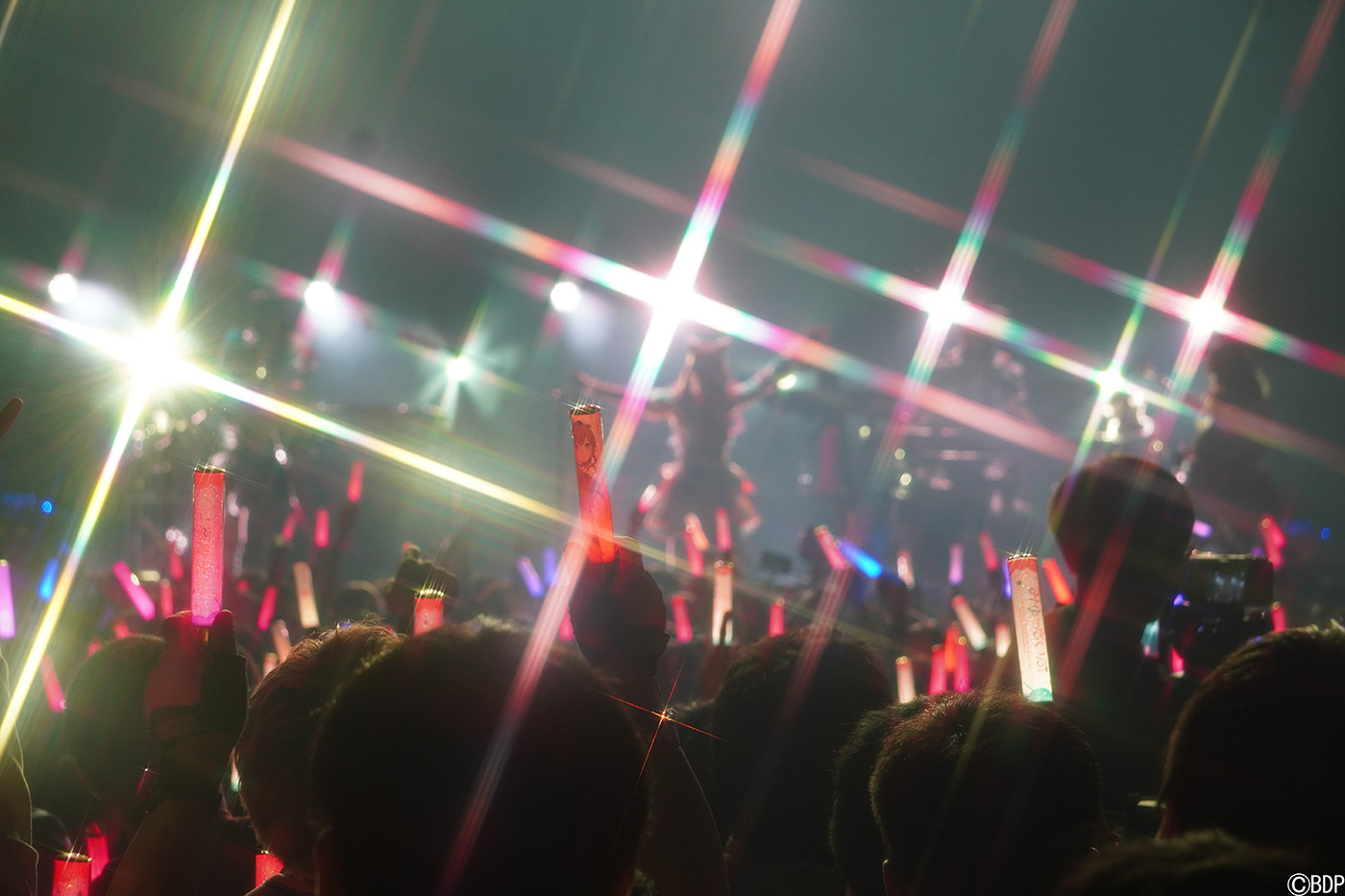 オープニングを飾ったのは、1stLIVEではアンコールのラストで初披露された「コハク」。後のMCで「1st LIVEからレベルアップした新しい自分達の姿を見せたいから」と語られたこの選曲に、その気持ちを感じた場内のテンションもスタートから最高潮に。自分の存在する意味が分からず、悩みながらも探し求める少女の気持ちを、激しい重低音の演奏とパワフルに叩きつけるようなボーカルで熱唱し、クライマックスの仲町のロングシャウトに大歓声が沸き上がった。