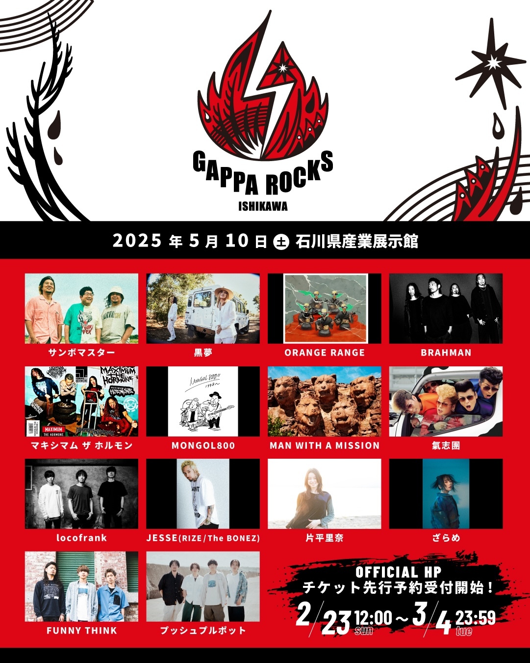 能登半島支援のライブイベント『GAPPA ROCKS ISHIKAWA』が、2025年5月10日(土)に石川県産業展示館で開催されることが発表された。