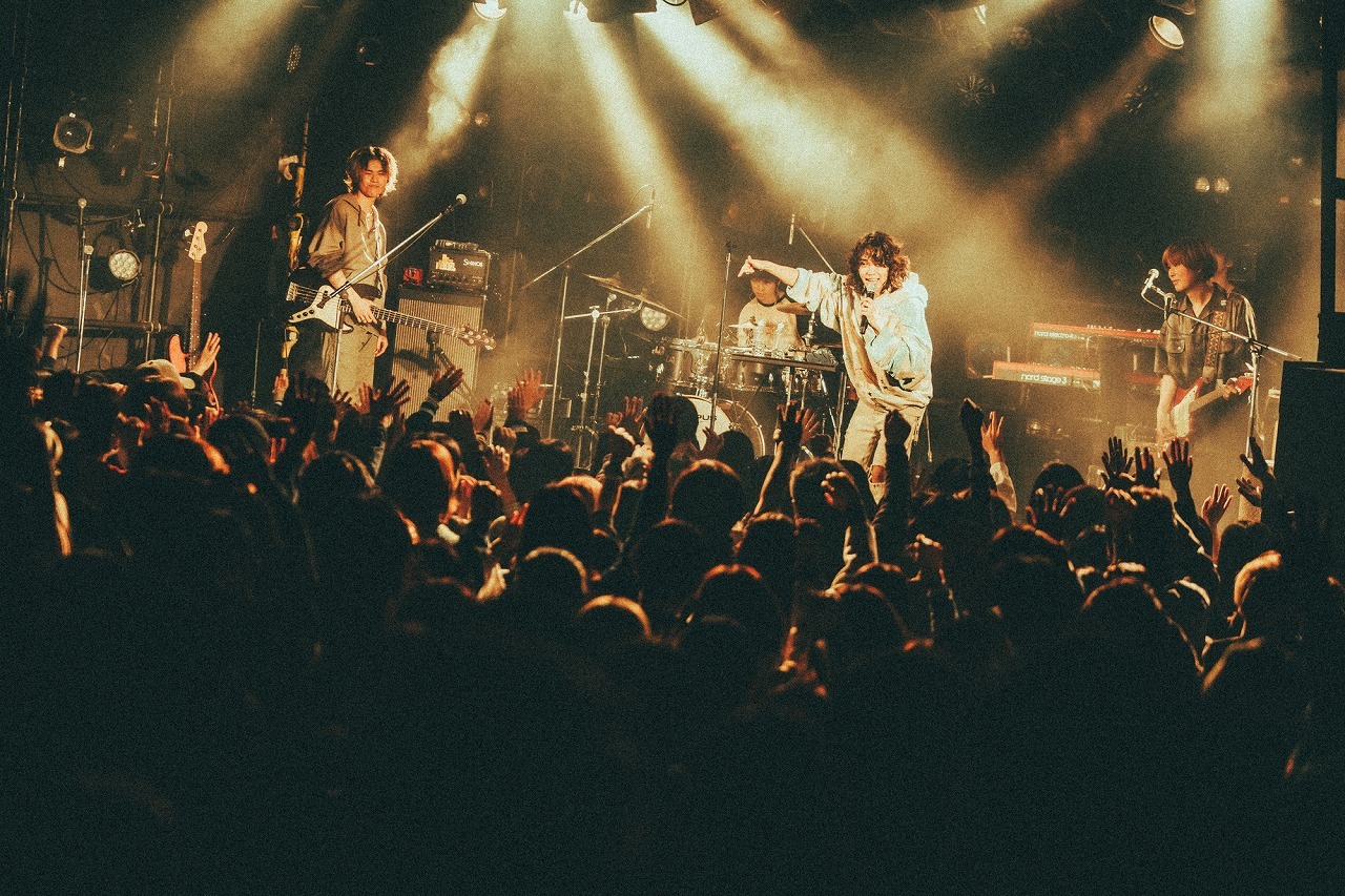 「本日がツアーファイナルです。今回のアルバムは言葉を大切にして作りました。1音1音に込めた言葉、想い、考えだったり、何か一つでもあなたの中に残って持って帰ってくれたら嬉しいのと同時に、それがあなたの生活の傘になりますようにという想いを込めて演奏します」――作品とライブに込めている想いを語った映秀。は、「もしかしたらバレちゃってるかもしれないんだけど……音楽がめっちゃ大好きなんですよ(笑)」と言いつつ、音楽への愛情も独特な表現で観客に伝えた。「僕、みりん焼きも音楽も好きなんだけど、音楽の方がすごいところがあるんです。みりん焼きは“みんなで食べよう”ってなった時に食べられる量がちょっとになっちゃうけど、音楽ってここにいる全員で食べても全員がお腹を満たして帰れるんですよね」――会場に集まった全員のお腹を満たすことを力強く宣言した彼は、多彩な曲をさらに届けてくれた。「ハ茶メ茶オ茶メ」「東京散歩」「僕等の秘密遊園地」「喝采」……豊かな表情を浮かべる歌声、粋なビートの乗りこなしによって煌めき続けた各曲。歌っている彼自身はもちろん、演奏を繰り広げるメンバー、全力で受け止める観客も本当に楽しそう。映秀。は「一緒に音楽をするぞ!」とこのライブの中で何度も呼びかけていたが、会場にいた誰も彼もが音楽をとことん楽しみ尽くす達人だった。