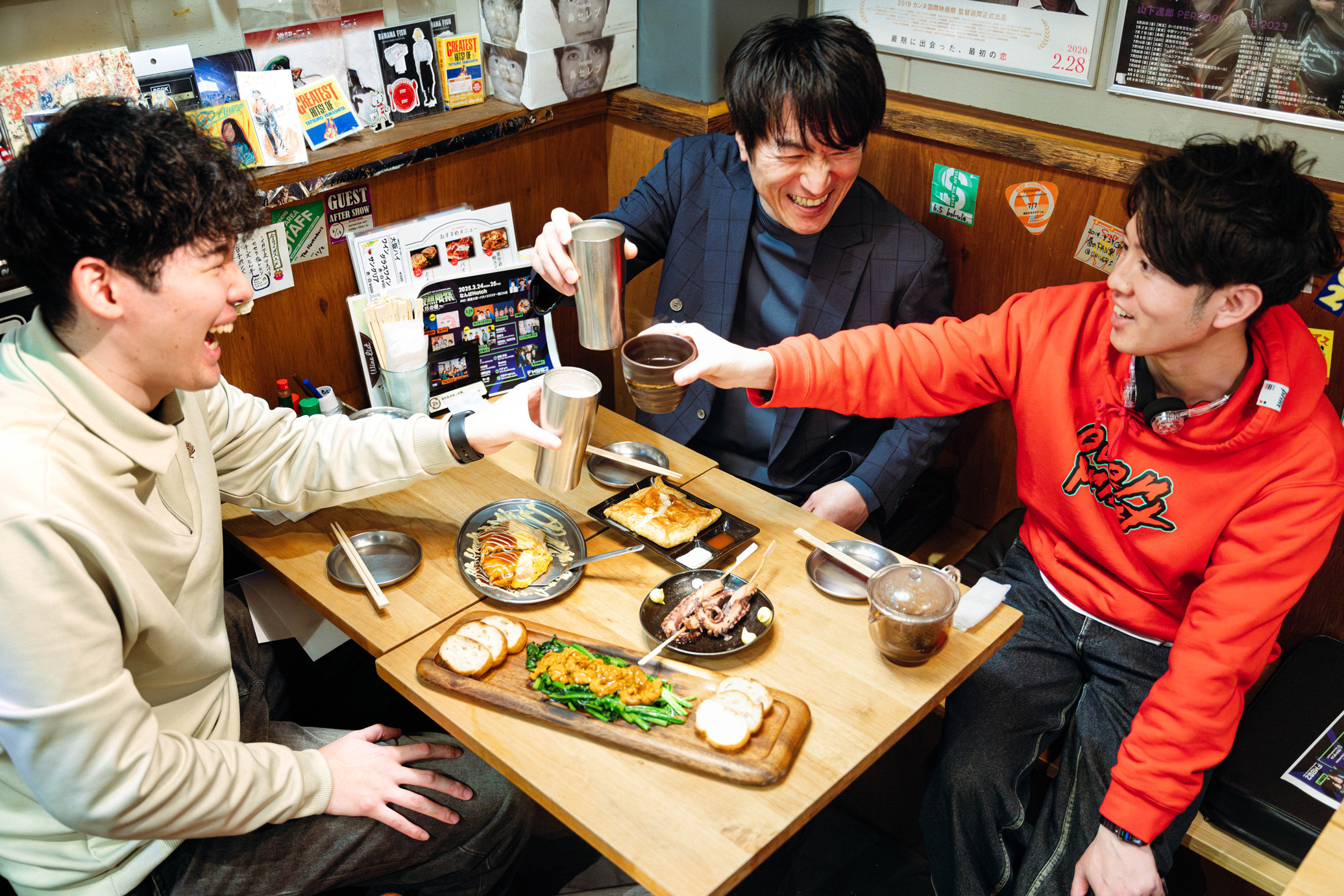 「番組とリスナーとアーティストと…1+1=ムゲンの可能性が生まれる(かもしれない!?)。ライブハウスシーンを追いかける木曜深夜のミュージックグラウンド」として放送中のFM802の番組『RADIO∞INFINITY』(毎週木曜0:00~3:00)が、2010年の番組開始から15周年を迎えた。それを記念して、3月24日(月)・25日(火)、大阪なんばHatchで『RADIO∞INFINITY 15th Anniversary pre. 電波無限祭-15の夜-』が行われる。今回はそれに先駆けて、『RADIO∞INFINITY』の歴代DJである飯室大吾、樋口大喜、ハタノユウスケの鼎談をセッティング。番組の歴史やDJとしての知られざる苦労、アーティストとの関係性などを語ってもらった。3人がいかに本気で番組に向き合っているか。オンエアではなかなか聞くことのできないエピソードも飛び出した濃厚な鼎談インタビュー。802も馴染みの居酒屋、鉄板野郎 裏参道店にお邪魔して、早速乾杯からスタート!