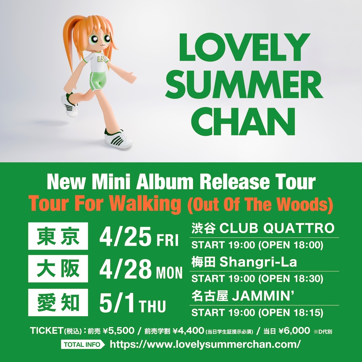 今回のツアー『Tour For Walking (Out Of The Woods)』は、前回ツアー『THE THIRD SUMMER OF LOVELY SUMMER SONIC Tour 2021-2』以来、約3年ぶり。4月25日(金)に東京・渋谷CLUB QUATTRO、4月28日(月)に大阪・梅田Shangri-La、5月1日(木)に愛知・名古屋JAMMIN’にて開催される。