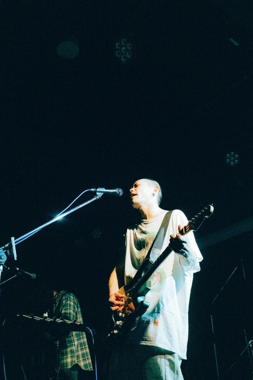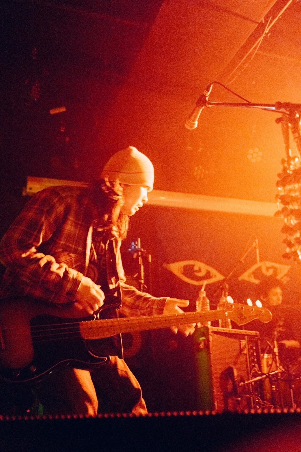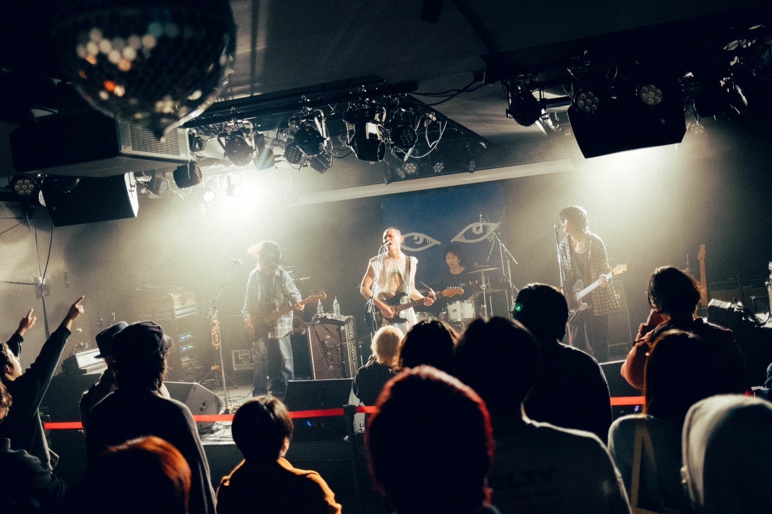 秒針の音と川の流れを彷彿とさせるSEの中、ながたなをや(Vo.Gt)が弾き語り始め、「Loop!!!」でショータイムの幕が上がった。DNA GAINZの楽曲は彼らのホームである島根県ののどかなムードや風を媒介に山や海、河川と溶け合っていく心地良さを内包しており、感情をそのまま身体所作として放出していくながたやキュートなスパイスを加えるはだいぶき(Ba)のコーラスワークによって、その壮大さが素朴な形に変換されて届けられる印象を受ける。つまりは、長きにわたり人々が敬意を表し続けてきた自然のエネルギーを拝借し、この場に出現させようとする営みが4人にとってのライブであると言えよう。それは雪崩れ込んだ「PARADISE HELL」も同様で、天国と地獄を喚起する赤と青のライティングやメタリックな手触りで刻まれるベース、宏武(Dr)のビートが重たく炸裂しながらも、<people!people!>と書くより「ピーポー! ピーポー!」と綴るのがドンズバなシャウトがどこかお茶目に響く。語りの延長線上に位置づけたくなる響きを所有しながらのボーカリゼーションは、わらべ歌さながらに聴き手を優しさと懐かしさで包みこんでくれるのだ。