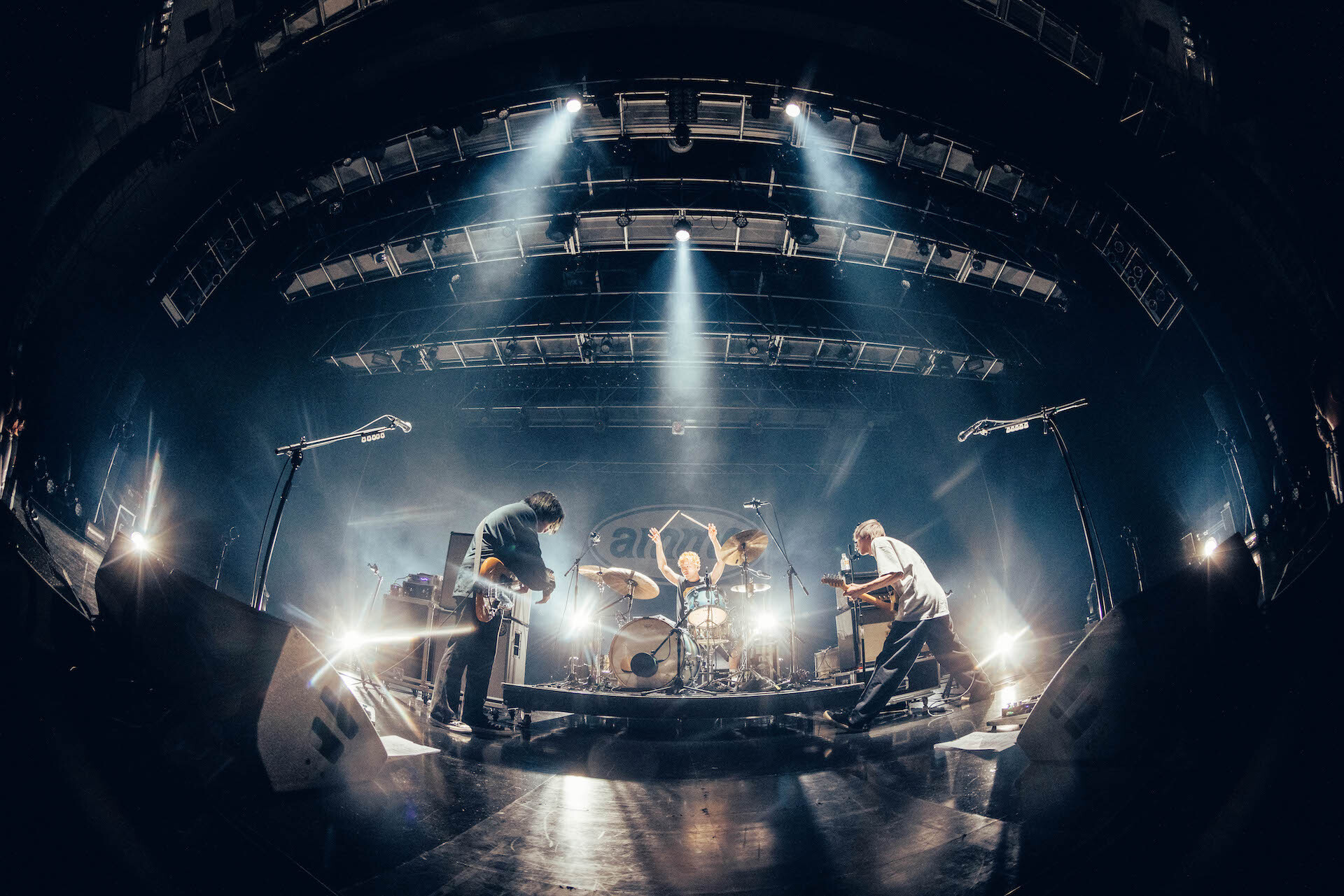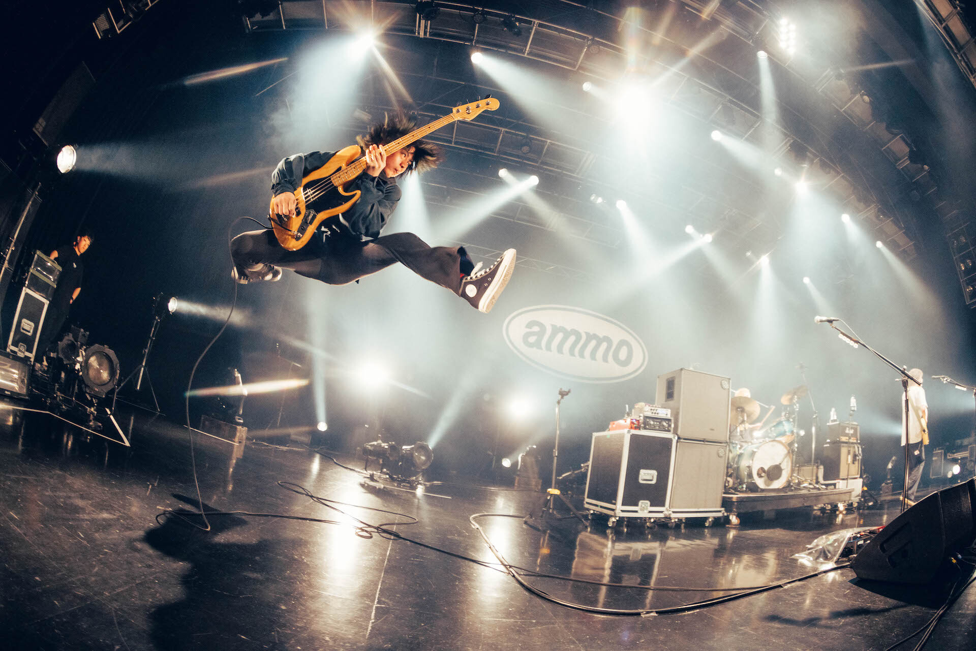 まだまだ愛を伝えきれないとばかりに「ライブハウスもロックバンドもみんなも。家族も裏方さんも最後まで愛しきります」と捧げたのは「High Ace!!!」。ハコの歌と衝動のナンバーで幕を上げた一夜が、バンドの第一作である「フロントライン」での羽化を経て、夢をたんまりと積み込んだバンドワゴンの曲へ結ばれていく。裏打ちのリズムを基盤にした「High Ace!!!」と、シンガロングというよりも合唱と形容したくなる硬派さを備えた「埃人間」で新たなammoの音楽的な広がりを確信させると、初期衝動マシマシの「SING ALONE GOOD」から「未開封」「星とオレンジ」「これっきり」とこの場所へ3人を連れてきてくれたキラーチューンを乱れ打ち。