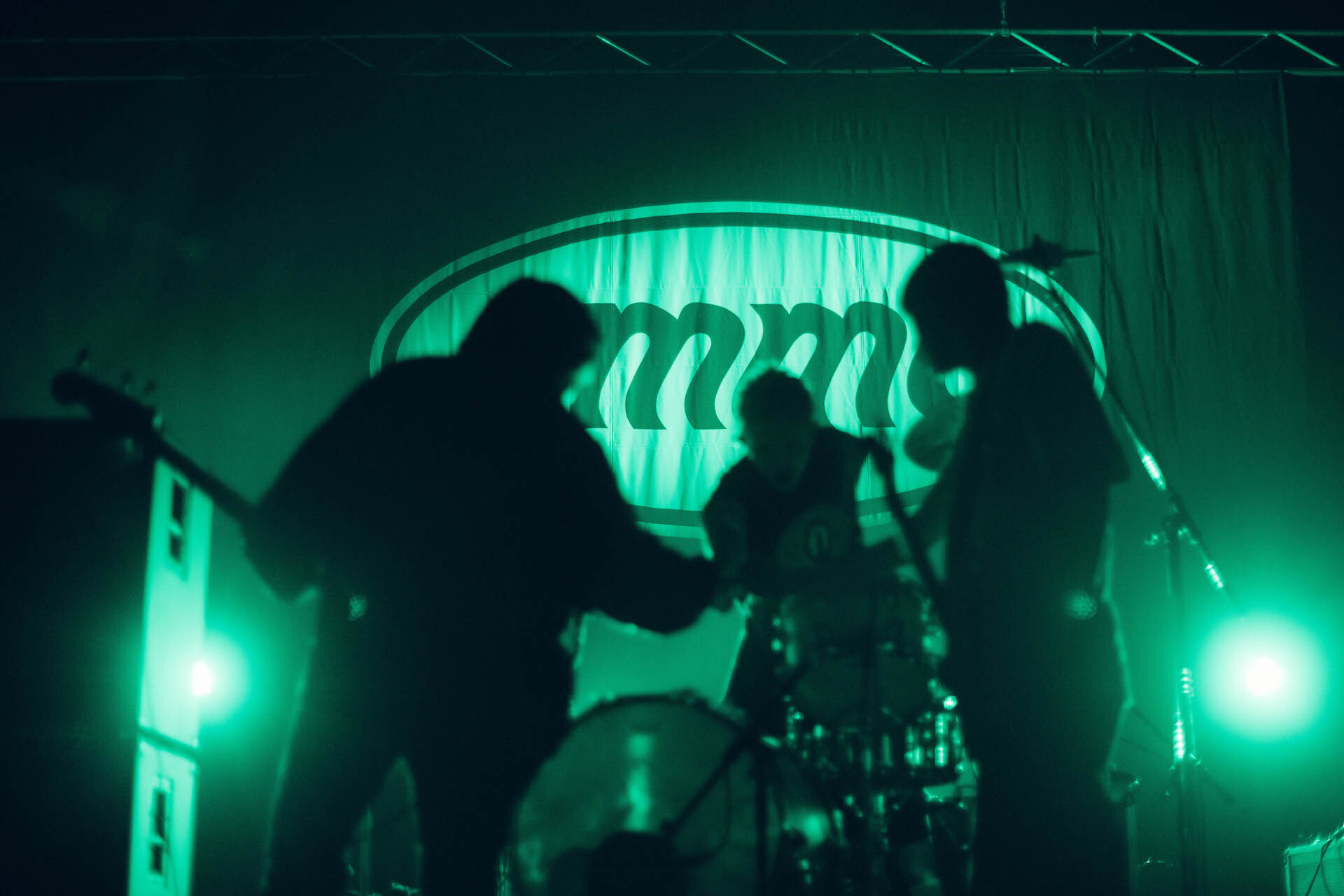 定刻を少し過ぎた頃、大きなバックドロップが深緑に染まる。静寂の最中、ポツポツと岡本優星(Vo.Gt)がギターを爪弾き始め、歌い出したのは「箱の中から」。降り注ぐ白いライトで伸ばされた3人のシルエットはどこか憂いを帯びながらも、丁寧に編まれるアンサンブルが混じり気のないammoとファンだけのボックスをゆっくりと切り取っていく。そのまま「大阪、Orange Owl Records所属、ammo。憧れのライブハウスで史上最長のワンマンライブをやりにきました」の口上でなんばHatchに名乗りを上げると「CAUTION」へ。冒頭2曲でありありと示されたのは、今日が彼らにとってライブハウスと改めて対峙する日であること。ワンルームから思いを馳せるような「箱の中から」は、眠れない夜にベッドの上であの音楽を流す時さながらのリスナーとバンドの関係を綴った歌として、ズドンと落ちた衝撃を瞬かせる「CAUTION」は<僕はずっとここに居るよ>の歌詞に重ねて「ここにいるぜ」と呟いた通りの存在証明のナンバーとして、客席を満たす。