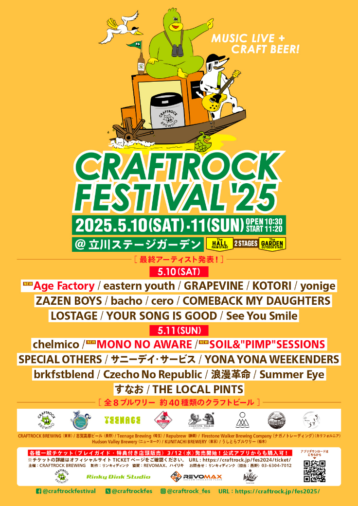 5月10日(土)・11日(日)の2日間にわたり、東京・立川ステージガーデンで開催される『CRAFTROCK FESTIVAL’25』から、最終出演アーティスト3組が発表された。
