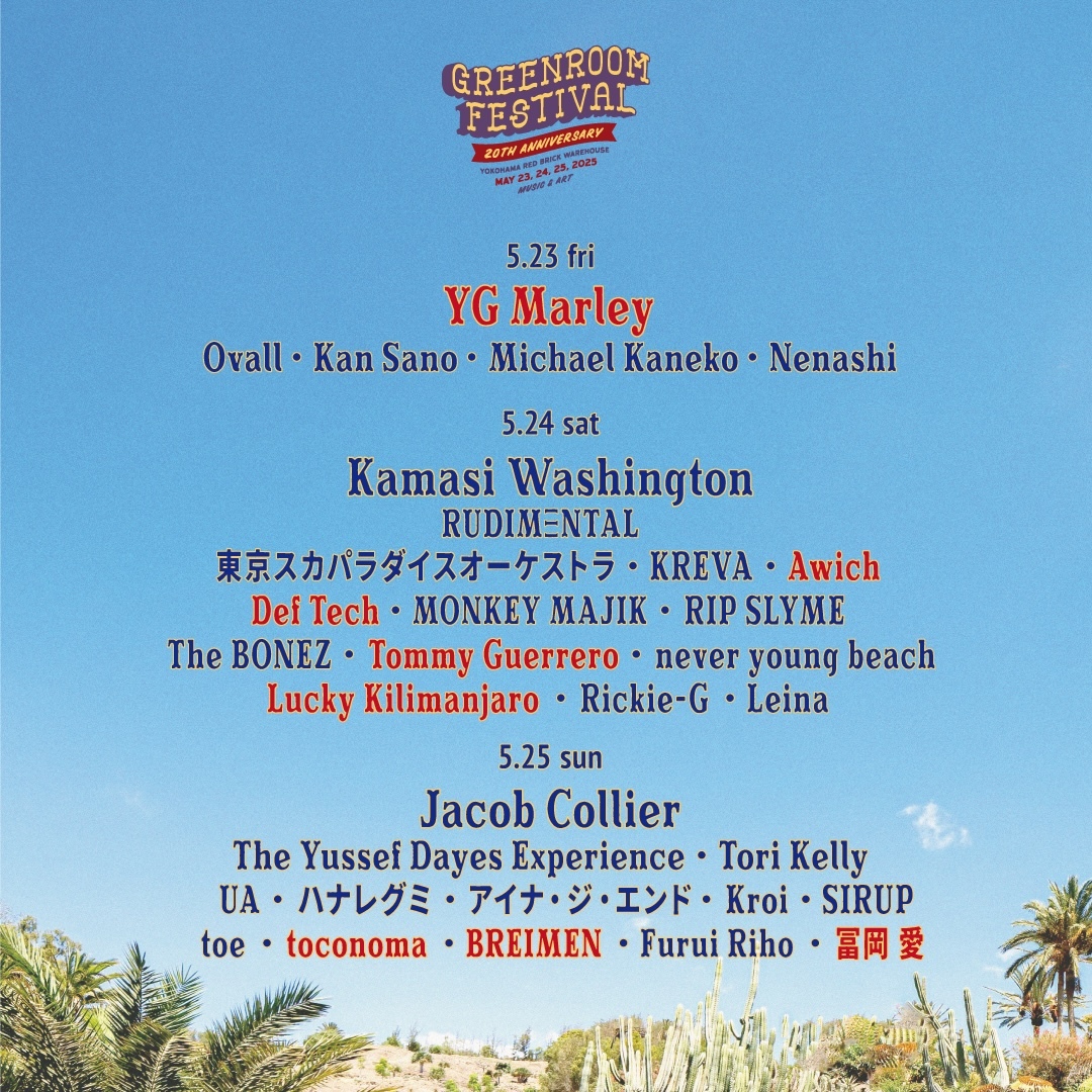 2025年5月23日(金)・24日(土)・25日(日)に横浜赤レンガ倉庫にて開催される『GREENROOM FESTIVAL 20th Anniversary』の第4弾出演アーティストが発表された。